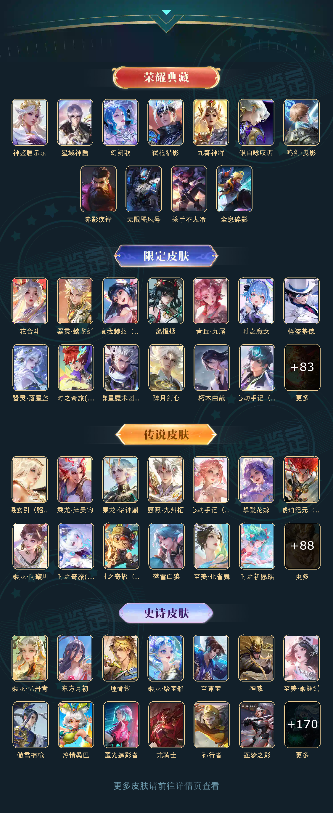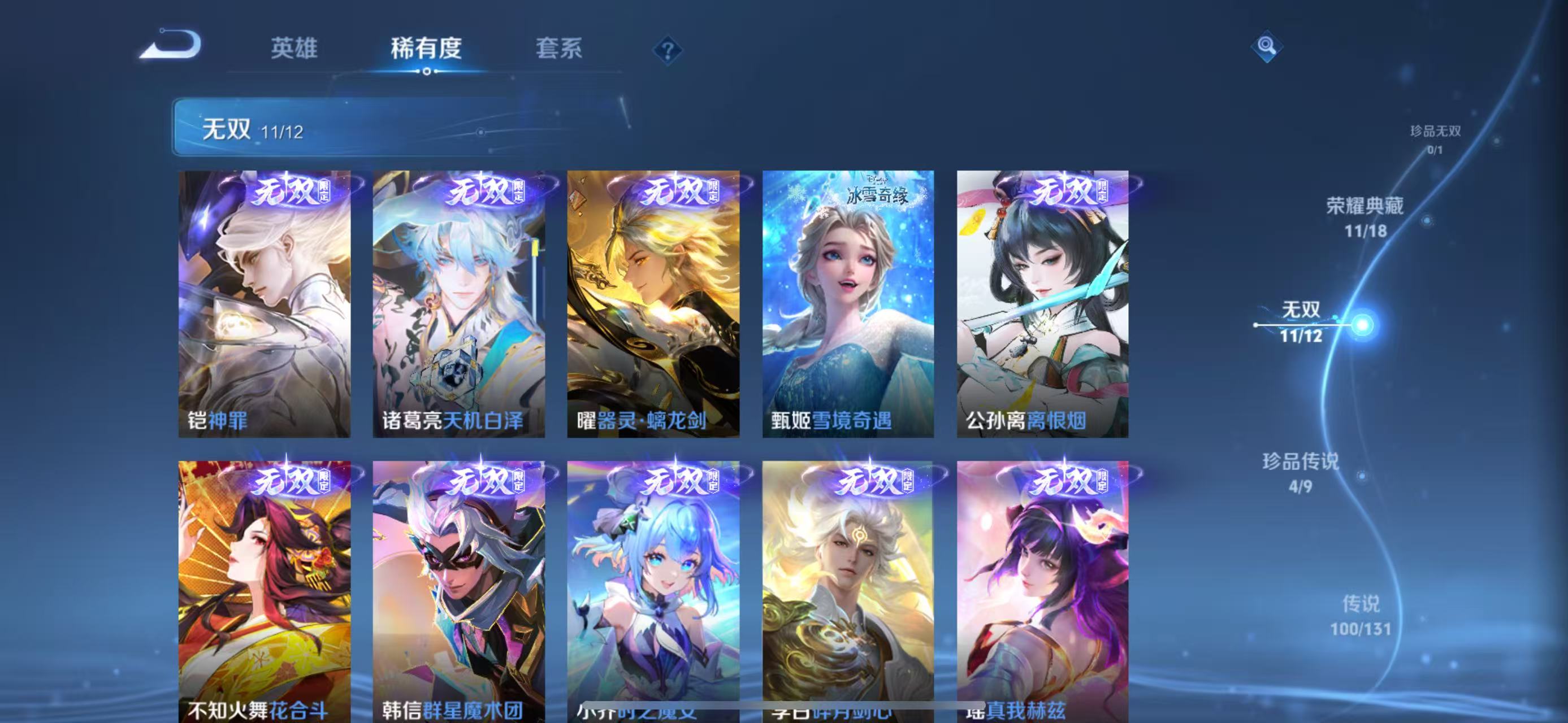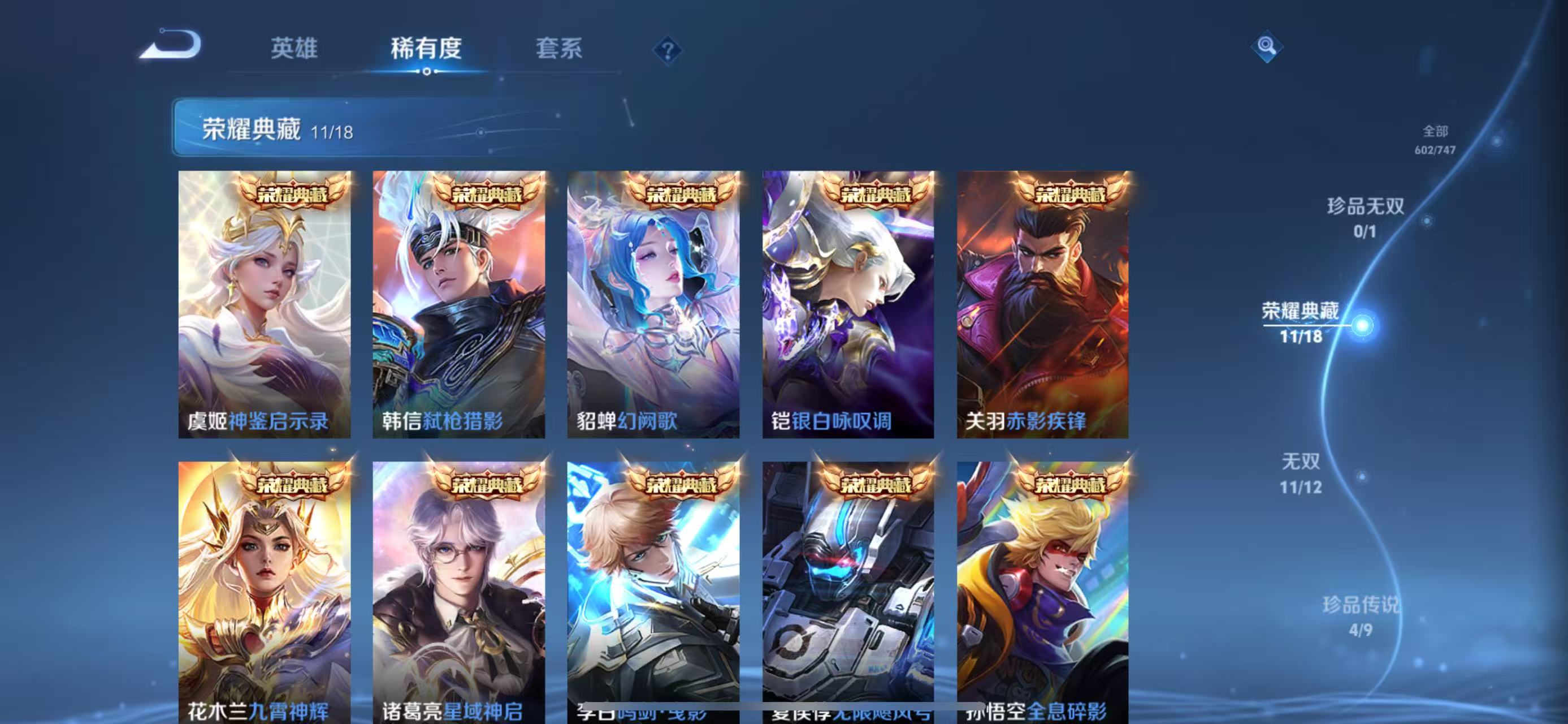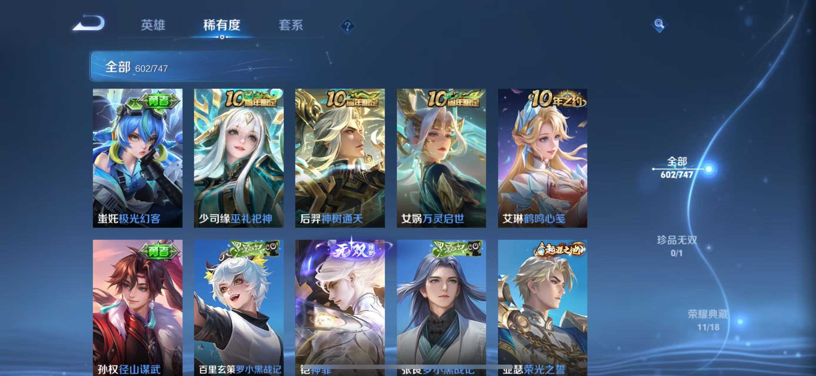 贵族等级V10,英雄数量127,典藏皮肤数11,皮肤数量601,街头霸王天魔缭乱至尊宝杀手不太冷热情桑巴逐梦之影武陵仙君无限飓风号黄金狮子座一生所爱全息碎影大圣娶亲冰霜恋舞曲青龙志白虎志朱雀志太华久胜战神飞衡白鹤梁神女匿光追影者鸣剑·曳影遇见胡旋龙胆星域神启李逍遥武圣奔雷神使孙行者玉兔公主补天异界灵契神威启示之音傲雪梅枪淬星耀世时雨天司