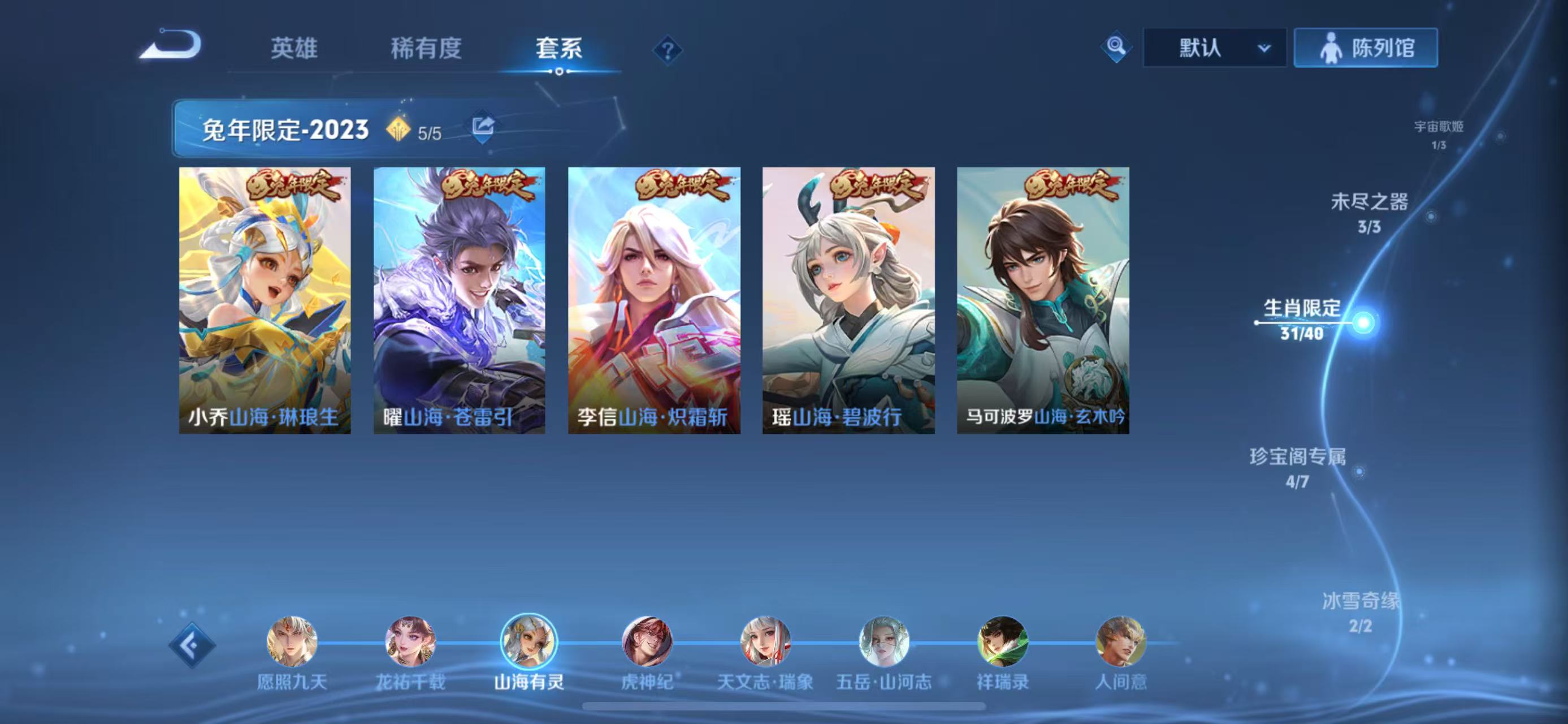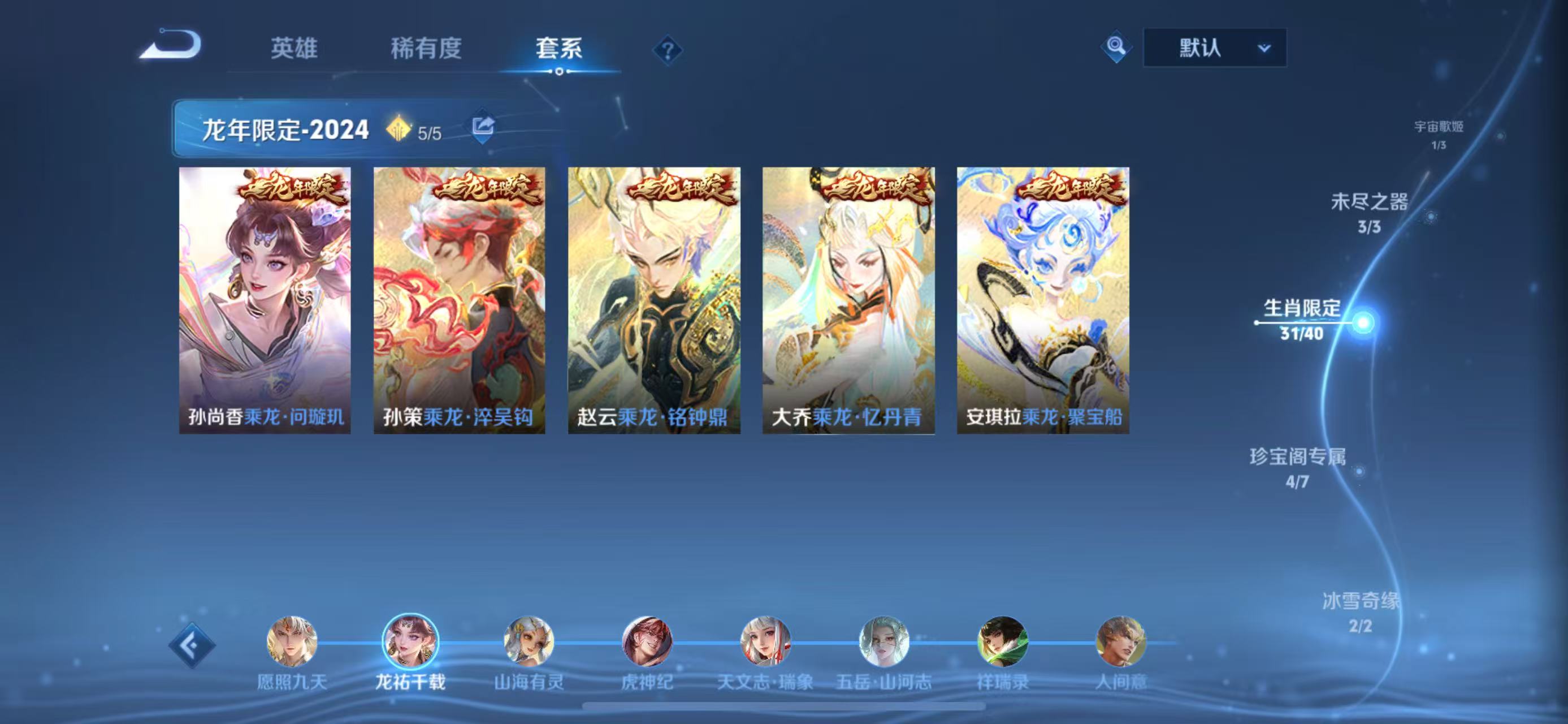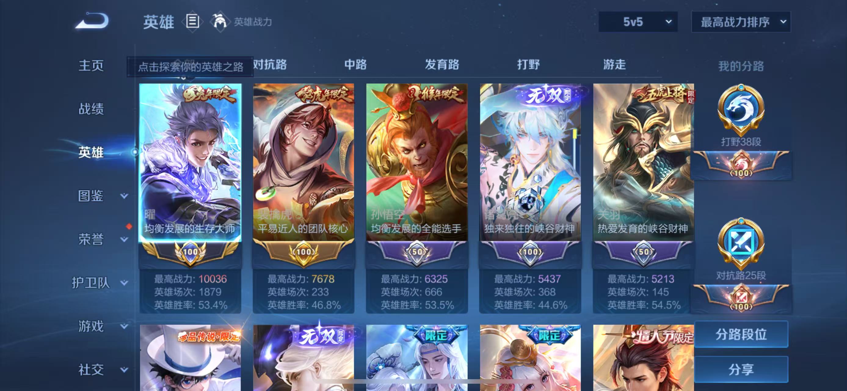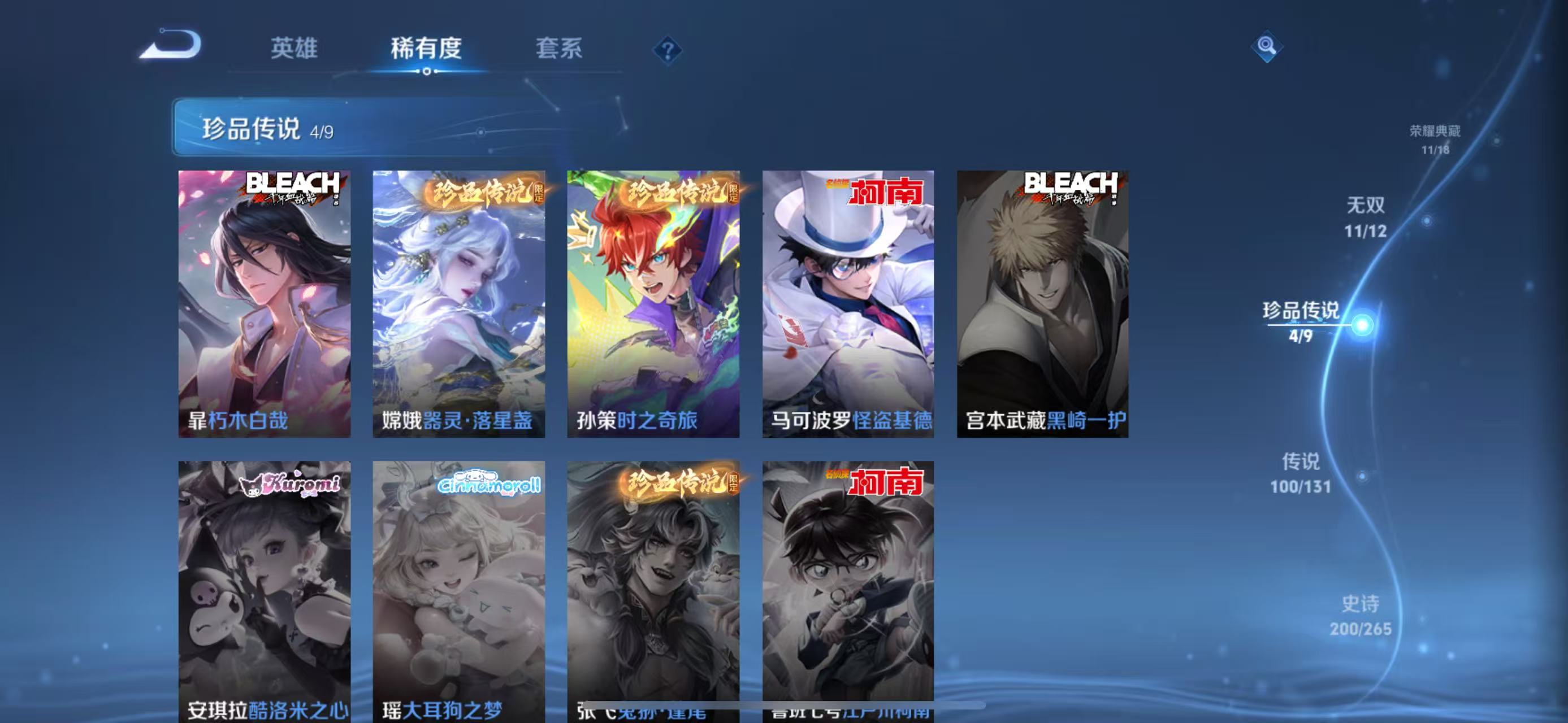贵族等级V10,英雄数量127,典藏皮肤数11,皮肤数量601,街头霸王天魔缭乱至尊宝杀手不太冷热情桑巴逐梦之影武陵仙君无限飓风号黄金狮子座一生所爱全息碎影大圣娶亲冰霜恋舞曲青龙志白虎志朱雀志太华久胜战神飞衡白鹤梁神女匿光追影者鸣剑·曳影遇见胡旋龙胆星域神启李逍遥武圣奔雷神使孙行者玉兔公主补天异界灵契神威启示之音傲雪梅枪淬星耀世时雨天司