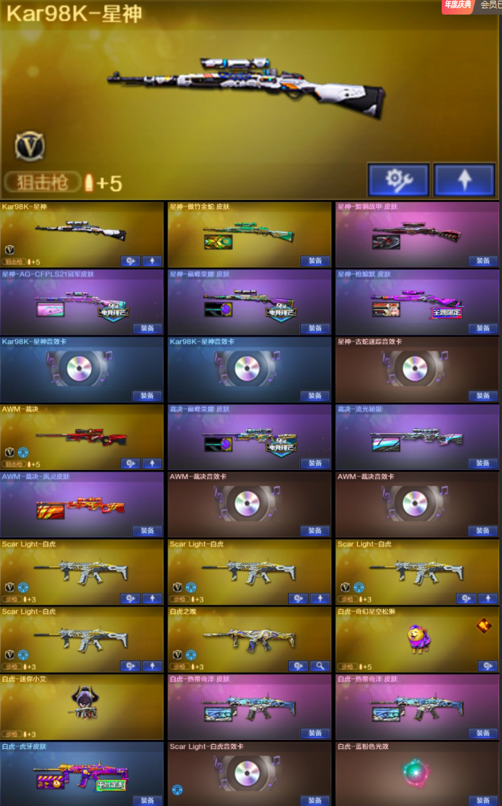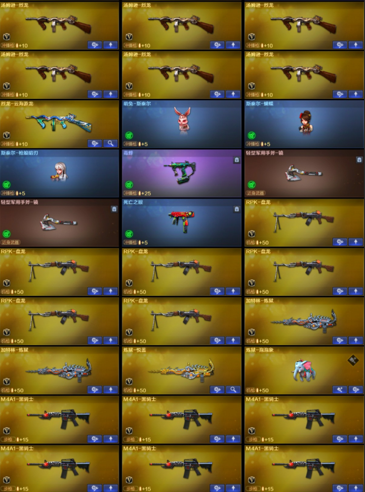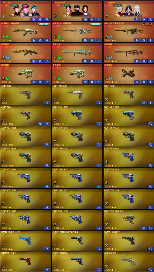 【稀有武器】:传说夜影/传说灵眸/传说幽瞳/传说破晓(2)/传说幽冥/M200-幻神(6)/Kar98K-星神(2)/VSK-94-金蚀(2)/八面凌龙/G36C-幻影/ScarLight-白虎(4)/M14EBR-玄武/HK417-朱雀/QBZ03-天罚(3)/M4A1-幻灵/M4A1-雷霆(2)/AK47-雷暴/雷霆之契(2)/USP-雷暴/COP357-幻灵(5)/柯尔特-竞技荣光/USP-神工天巧/天神-动感闪耀/修罗-云海游龙/COP357-云龙(9)/柯尔特-荣耀世冠白鲨2023/柯尔特-无冕之王/修罗-古蛇迷踪/荣耀世冠-柯尔特/COP357-雷霆王者-觉醒版/王者破空枪刃/金色蔷薇-古蛇迷踪/QBZ03-云龙/QBZ03-金色蔷薇(3)/AK47-火麒麟(2)/M4A1-黑龙(4)/M4A1-雷神(5)/M4A1-黑骑士(6)/AK47-无影/AK47-黑武士/Barrett-毁灭(4)/Barrett-极光/AWM-裁决(2)/RPK-盘龙(6)/加特林-炼狱(2)/汤姆逊-烈龙(6)/炽芒蝶刃(8)/斩神刀-雷暴/幻灵之锋(2)/擎天-竞技荣光/唐刀-神工天巧/云龙扇(6)