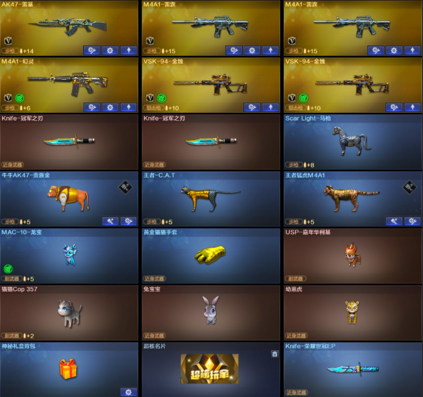【其他亮点】:斯泰尔-蝴蝶/炼狱-泡泡象/Knife-冠军之刃(2)/M4A1-小神龙/QBZ03-嘉年华柯基/白虎-迷你小艾/白虎-奇幻星空松狮/MK5-炽火炎龙/毒蜂/Scar Light-马枪/牛牛AK47-贵族金/王者-C.A.T/王者猛虎M4A1/斯泰尔-枪娘暗刃/MAC-10-龙宝/黄金猫猫手套/迷你泡泡象/茸茸小松狮/USP-嘉年华柯基/猫猫Cop357/兔宝宝/超核名片