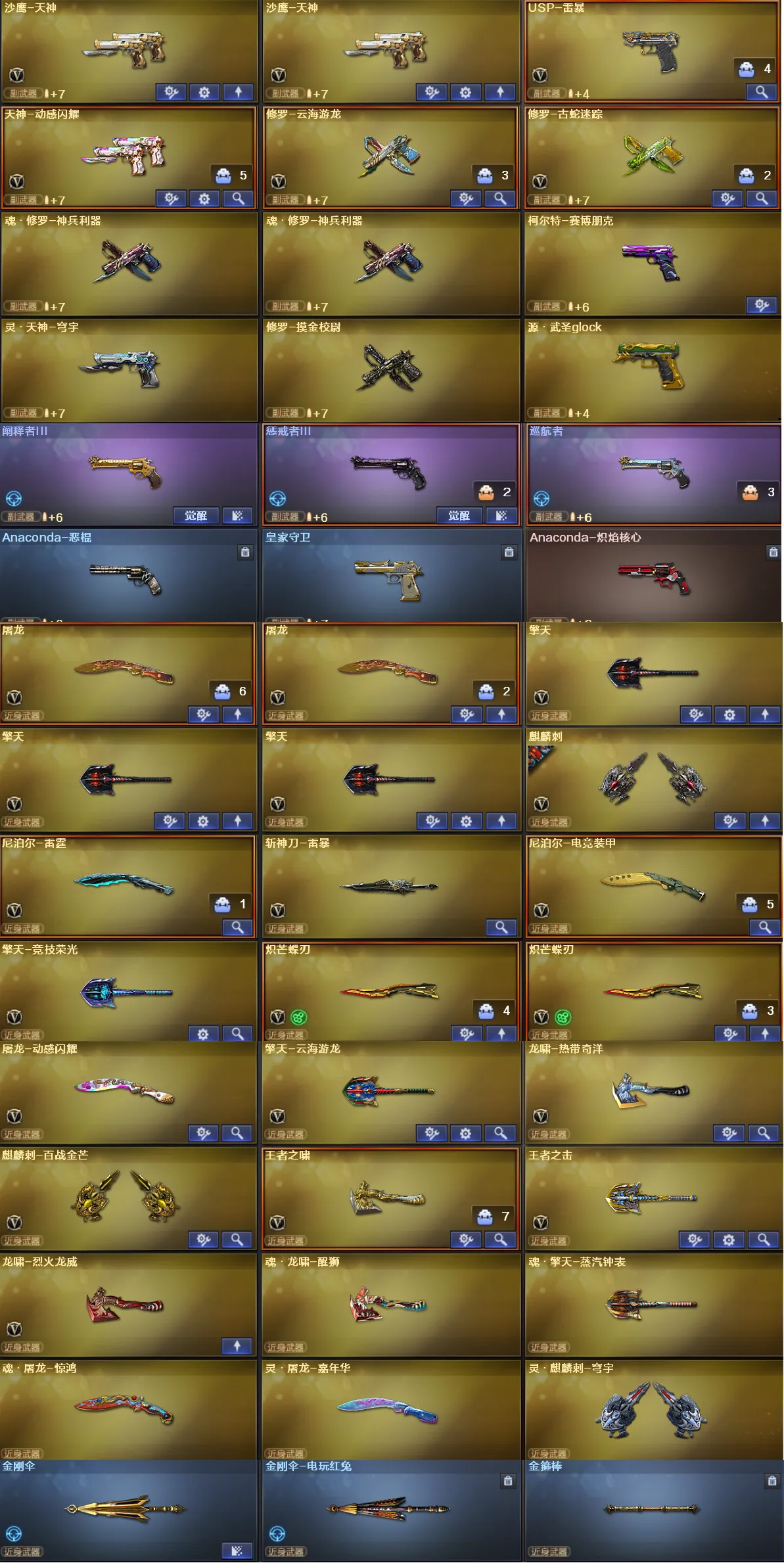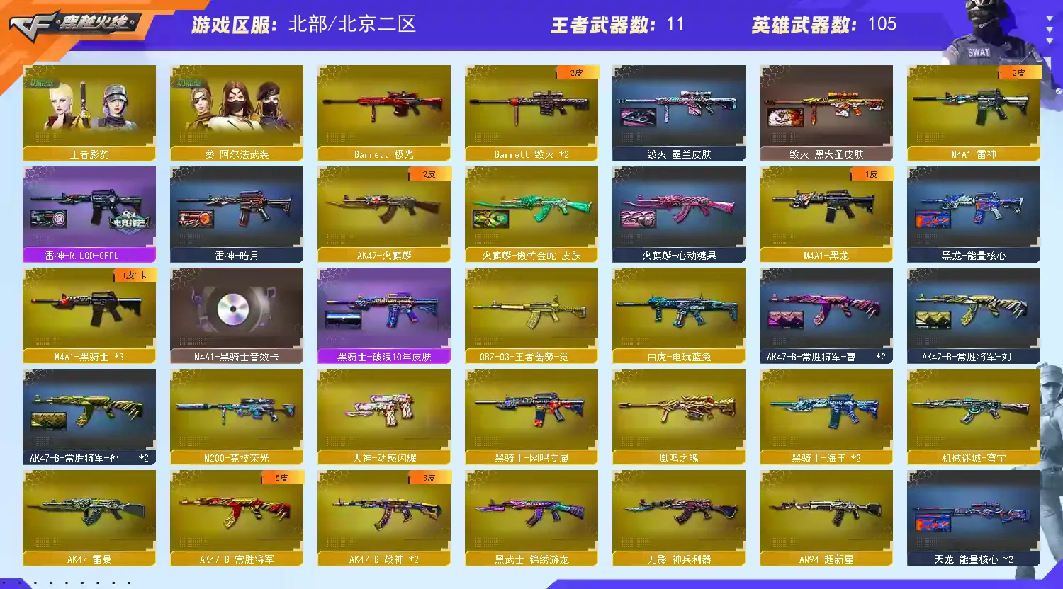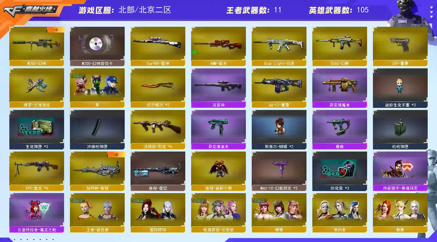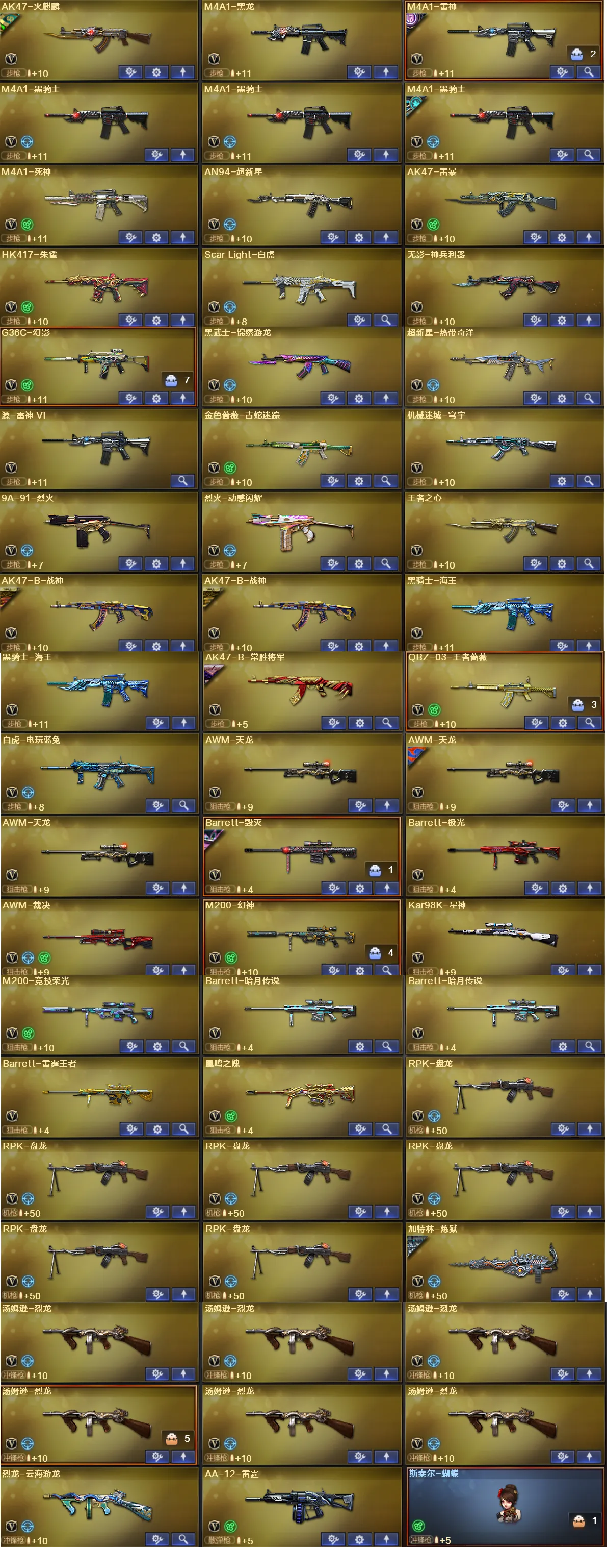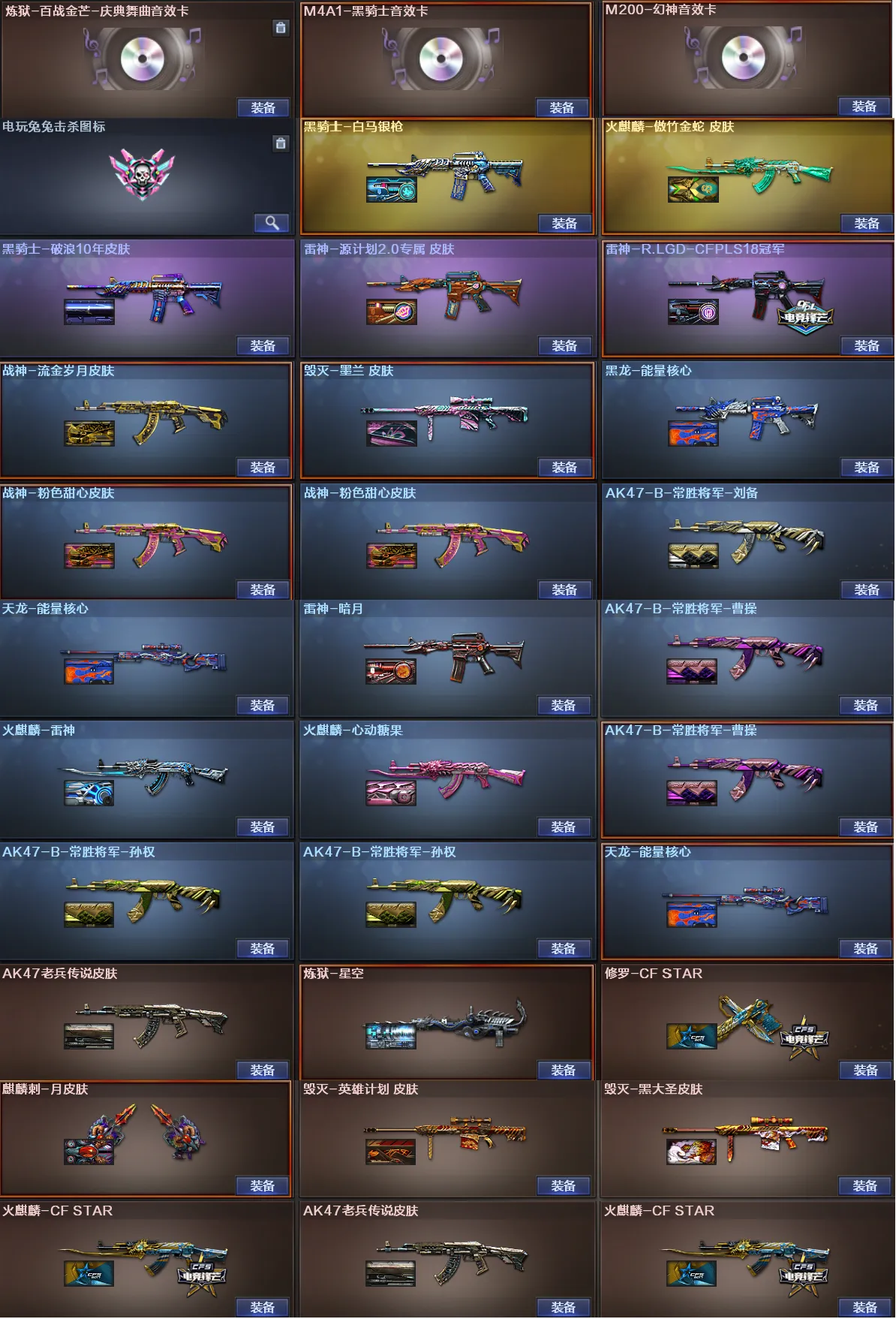 稀有武器:M200幻神、98K星神、M200竞技荣光、G36C幻影、盘龙X6、炼狱、烈龙X7、Scar白虎、HK417朱雀、火麒麟、黑龙、雷神、黑骑士X3、死神、超新星、雷暴、无影神兵利器、黑武士锦绣游龙、超新星热带奇洋、源雷神、金色蔷薇古蛇迷踪、机械迷城穹宇、烈火、烈火动感闪耀、白虎电玩蓝兔、天龙X3、毁灭、极光、裁决、暗月传说X2、雷霆王者、凰鸣之魄、雷霆、天神X2、USP雷暴、天神动感闪耀、修罗云海游龙、修罗古蛇迷踪、屠龙X2、擎天X3、、麒麟刺、尼泊尔雷霆、斩神刀雷暴、尼泊尔电竞装甲、擎天竞技荣光、炽芒蝶刃X2、屠龙动感闪耀、擎天云海游龙、龙啸热带奇洋、麒麟刺百战金芒、龙啸烈火龙威