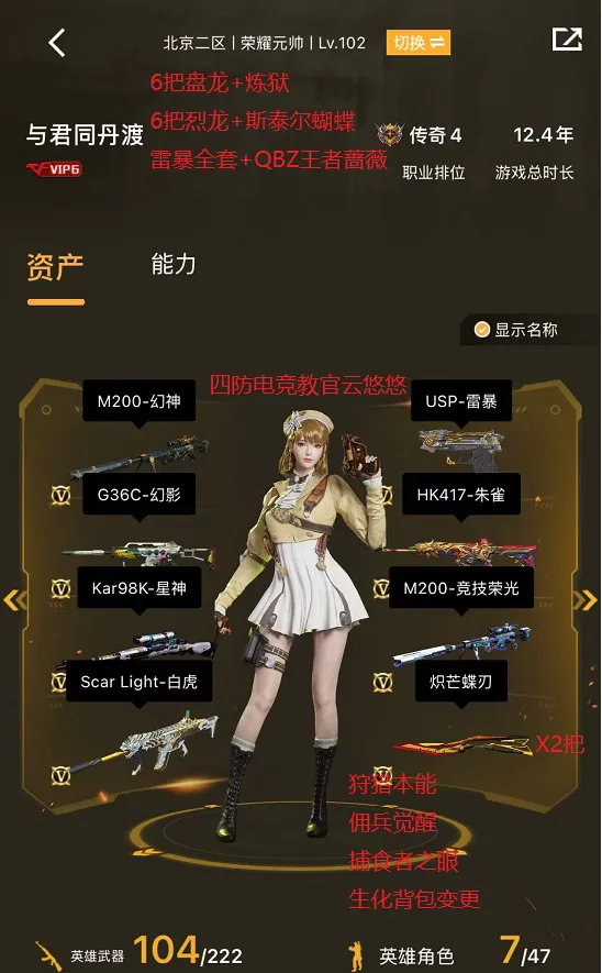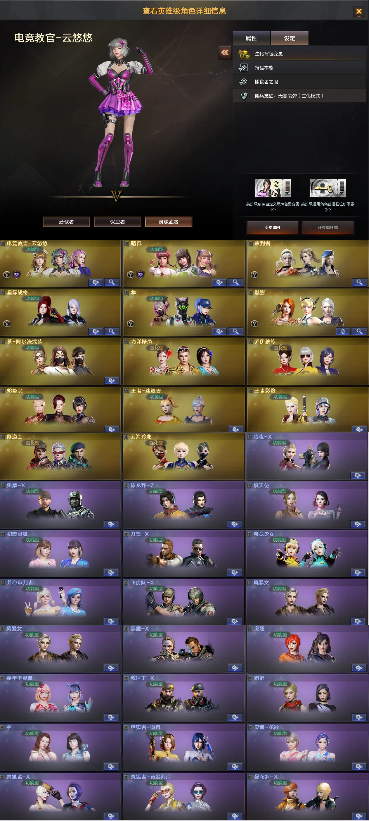 稀有角色:电竞教官云悠悠(四防狩猎本能/佣兵觉醒/捕食者之眼/生化背包变更)、晴雅、审判者、星际战将、隼、魅影、葵阿尔法武装、奇洋探员、乔伊教练、蛇影宗、王者迷迭香、王者影豹、修道士、云海玲珑、芳心审判者、电竞少女、炽天使、灵狐者黄金海岸