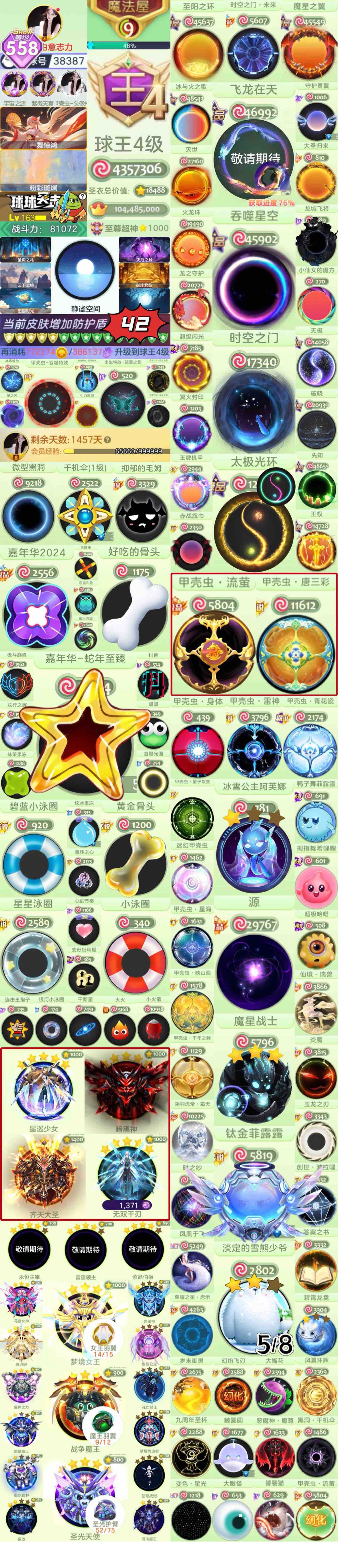 黑洞时空 静谧空间 满级魔星 阿芙娜 黑色十字架漩涡甲壳虫黑甲 唐三彩甲壳虫 雷神甲壳虫 红甲壳虫 青花瓷甲壳虫 十甲壳虫全家桶 钛金非露露 大白 龙城飞将 蛇年嘉年华 双骨头 三泳圈 24嘉年华 千机伞 满级暗黑神 四年卡v8 开局42护盾 六主题背景