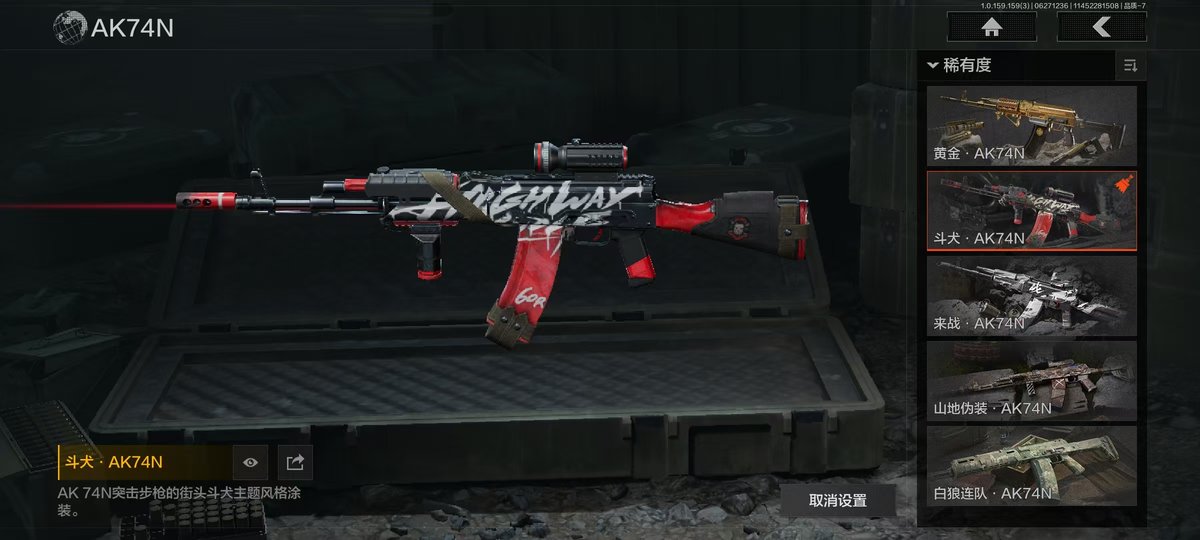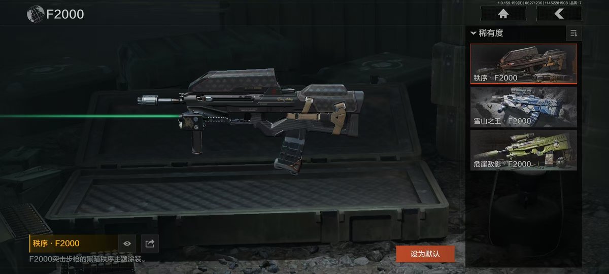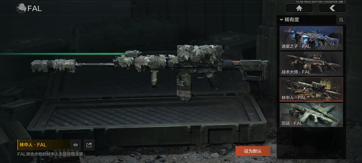 【角色皮肤】:都护铁衣战术甲胄,绕指玉鸾战术甲胄,黑暗行者特摄戏服,正义战士特摄戏服,绅士西服,绅士西服,林中人特遣作战服;【装备涂装】:绕指玉鸾装备组合包,都护铁衣装备组合包,战术甲胄装备涂装组合,散花海Ⅱ装备组合包,瀚海军行Ⅱ装备组合包,散花海装备组合包,瀚海军行装备组合包,钢铁壁垒涂装组合包,正义战士涂装组合包,不败坚守装备涂装,噤声者装备涂装组合,过江龙装备涂装组合,机车朋克装备涂装组合,秋日盛宴套装,秩序套装,涂装-林中人特遣作战服;【近战武器】:三尺万仞战术剑,下弦月,涂鸦利刃,胜利军刀,明刀绣春,龙魂双节棍,冬日冰镐,裁决手杖剑,急袭弯刀,野战折刀,工兵铲,来战开山刀;【手套】:玉鸾挂枝手套,角弓得控手套,裁决手套,急袭手套;【突击步枪】:黄金M4A1,骑士之剑M4A1,诸星之子FAL,战术大师FAL,林中人FAL,蓝色咆哮H416,堕落者H416,黄金H416,战术大师AK102,黄金AK74N,斗犬AK74N,秩序F2000,银月AN94,缟兵玄墨AKM,来战AKM,德尔塔小队M4A1,竞技M4A1,黑金国际M4A1,自喷网格H416,逆火MDR,涂鸦AK102,来战AK74N,山地伪装AK74N,骑士之剑AKS74U,极恶AUG,雪山之王F2000,危崖敌影F2000,涂绘猎人AR57,无声暗月AR57,战术大师AR57,湖冰倒影ACE31,白垩游魂ACE31,飞鲨ACE31,暴虐AEK,胜利锋刃AEK,壁垒AN94,阴影AN94,龙威T951,缟兵玄墨T03,玄戈梨花T03,林地数码T03,07式林地迷彩QBZ191;【冲锋枪】:长缨风掣Vector9,湖冰倒影MP5,无声暗月MP5,龙威MP5,缟兵玄墨MPX,玄戈梨花MPX,涂鸦MPX,灰鼠幻歌P90,星云火花P90,兔年春季限定,代号天依P90,禁止访问UMP45,恶念Vector9;【射手步枪】:战术大师VSS,冰河碎影MK14,缟兵玄墨VSS,玄戈梨花VSS,白狼连队VSS,缟兵玄墨M110,玄戈梨花M110,午夜梦魇M110,光粒子M110,全地形数码M110;【栓动步枪】:长缨风掣AX50,白色丧钟莫辛,白垩游魂莫辛,无声暗月AX50;【轻机枪】:长缨风掣RPK16,娜迦RPK16,壁垒RPK16;【卡宾枪】:龙影SKS;【手枪】:涂鸦G18C,秩序G18C,白貂F57