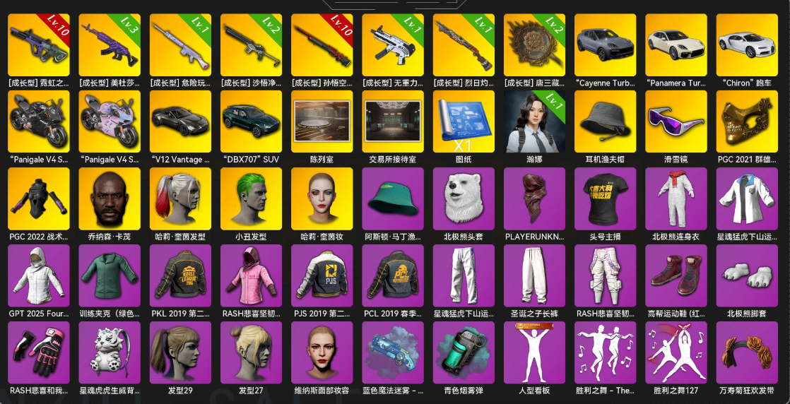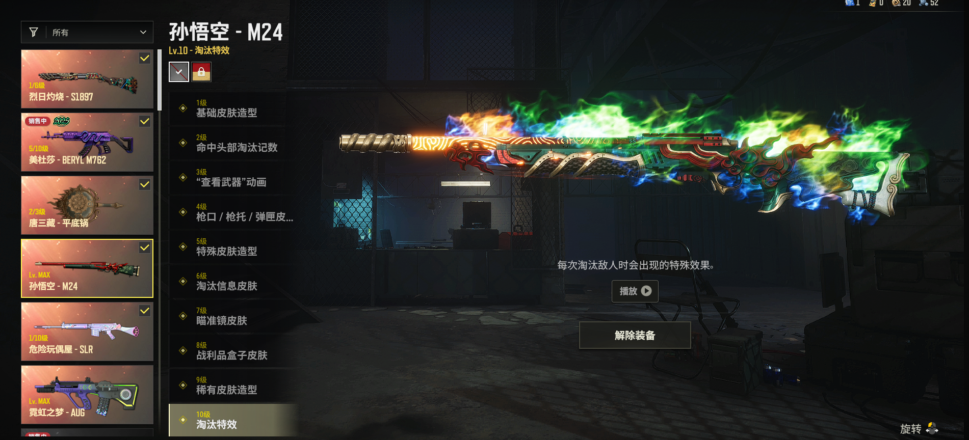 【成长武器】[成长型] 霓虹之梦 - AUG[10级],[成长型] 危险玩偶屋 - SLR[1级],[成长型] 沙悟净 - Mini14[2级],[成长型] 唐三藏 - 平底锅[2级],[成长型] 美杜莎 - Beryl M762[3级],[成长型] 无重力 - MP5K[1级],[成长型] 烈日灼烧 - S1897[1级],[成长型] 孙悟空 - M24[10级]