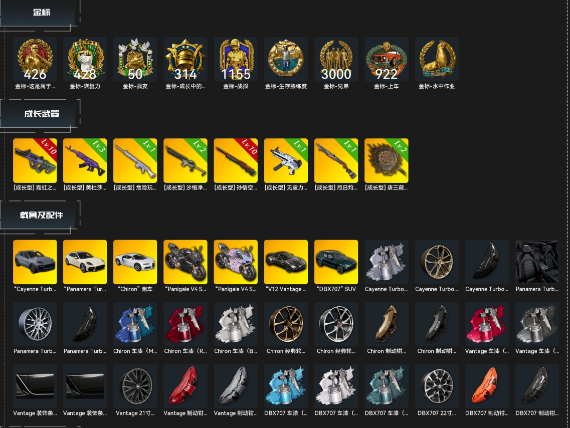 【优质载具】“Panigale V4 S(纯净黑)” 摩托车,“DBX707” SUV,“Chiron” 跑车,“Panigale V4 S(暮光粉)” 摩托车,“V12 Vantage Roadster” 跑车,“Panamera Turbo S”轿车,“Cayenne Turbo GT”SUV
