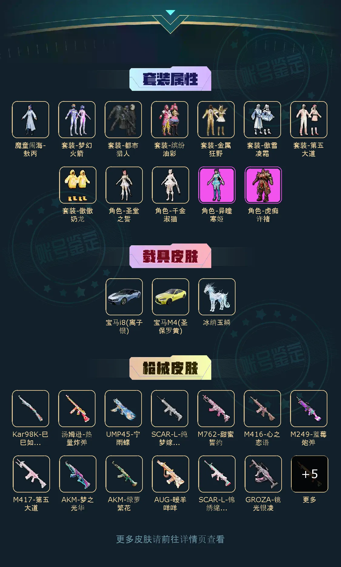 【稀有资产】角色-魔童闹海-敖丙[3级]/角色-千金淑猫/套装-第五大道/套装-缤纷油彩/M416-心之恋语/AUG-暖羊咩咩/AKM-梦之光华/角色-8号机/套装-都市猎人/套装-浪漫天命/套装-潮萌小黄鸭/套装-龟仙人/套装-兔兔白日梦/套装-晶辉守护/套装-缤纷假日/套装-浪漫假日/角色-都市丽猫/角色-银尘/角色-冰公主/角色-情公主/角色-白光莹