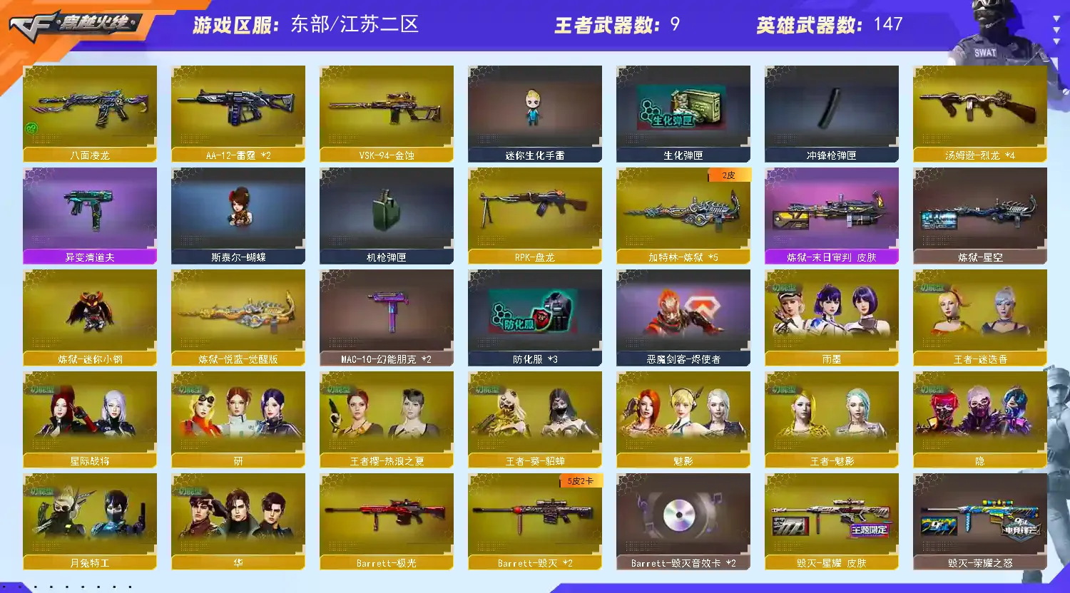 生化背包蛇影宗 雨墨等4个四防角色,传说幽瞳 传说灵眸 辉光 破晓 幽冥 4柯尔特 2usp 1cop 双蝴蝶刀 蝴蝶小人枪 炼狱小钢 王者破空枪刃