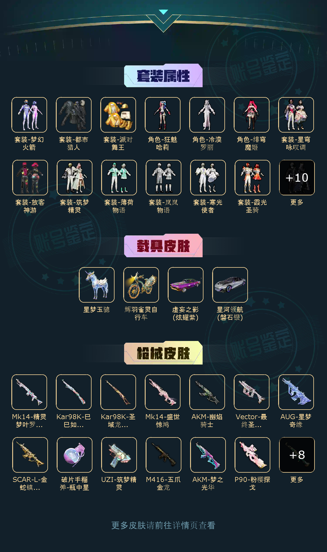【稀有资产】角色-千金淑猫/M416-五爪金龙/AKM-梦之光华/破片手榴弹-瓶中星球/AUG-星梦奇缘/AKM-幽焰骑士/M416-墨龙九天/SCAR-L-金蛇镇世/Mk14-盛世惊鸿/套装-派对舞王/套装-都市猎人/套装-粉红小猪/套装-浪漫天命/套装-暗影哥特/套装-龟仙人/套装-兔兔白日梦/套装-晶辉守护/套装-绒宝小鹅/套装-浪漫假日/套装-牛仔情诗/套装-星谷精灵/套装-银月精灵/套装-圣穹绘梦/套装-虚空漩涡/角色-粉雾星云/角色-都市丽猫/角色-摩登魅猫/角色-俏兔智灵/角色-灵公主/角色-情公主/角色-白光莹/角色-鲛海歌灵/角色-海琴烟