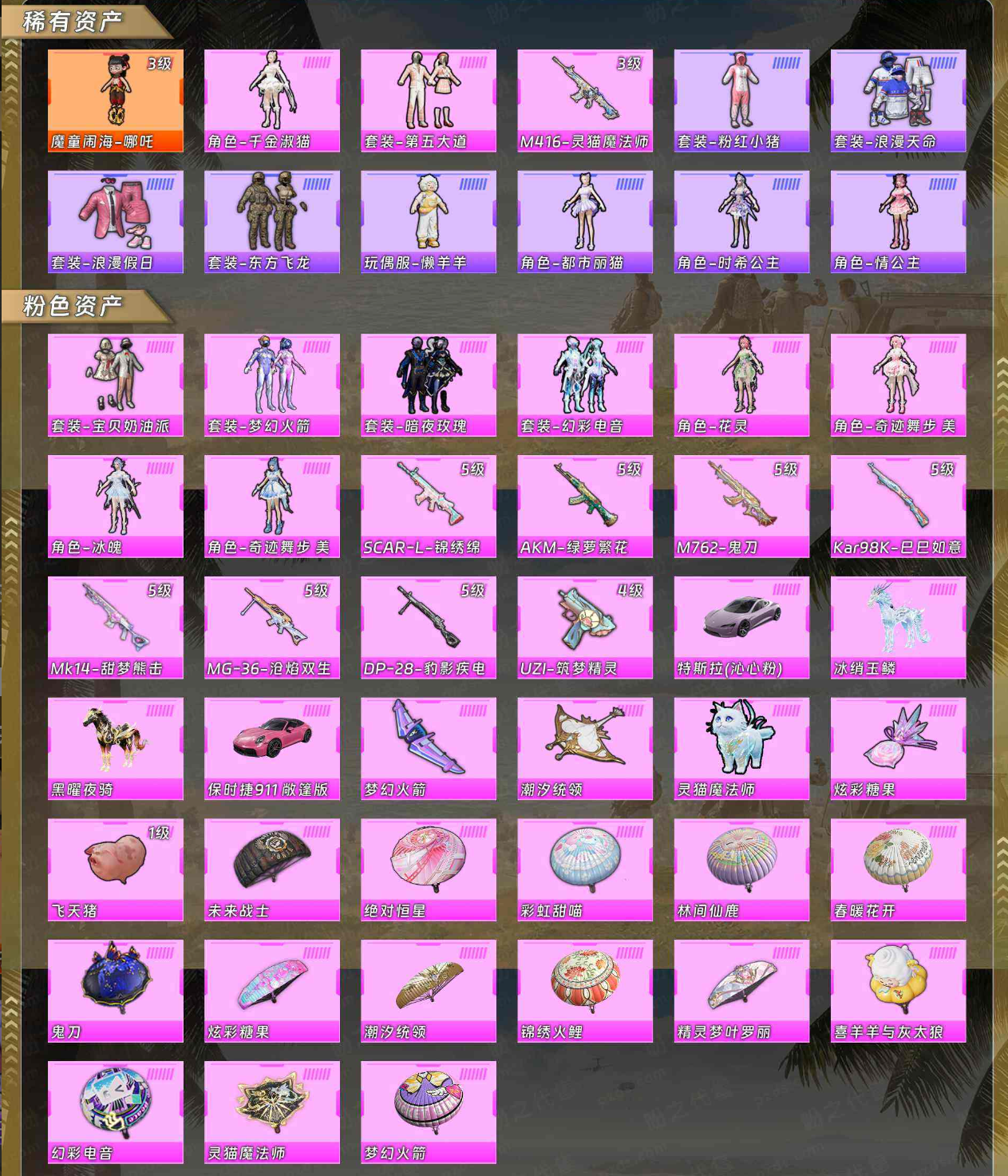【稀有资产】角色-魔童闹海-哪吒[3级]/角色-千金淑猫/套装-第五大道/M416-灵猫魔法师/套装-粉红小猪/套装-浪漫天命/套装-浪漫假日/套装-东方飞龙/玩偶服-懒羊羊/角色-都市丽猫/角色-时希公主/角色-情公主