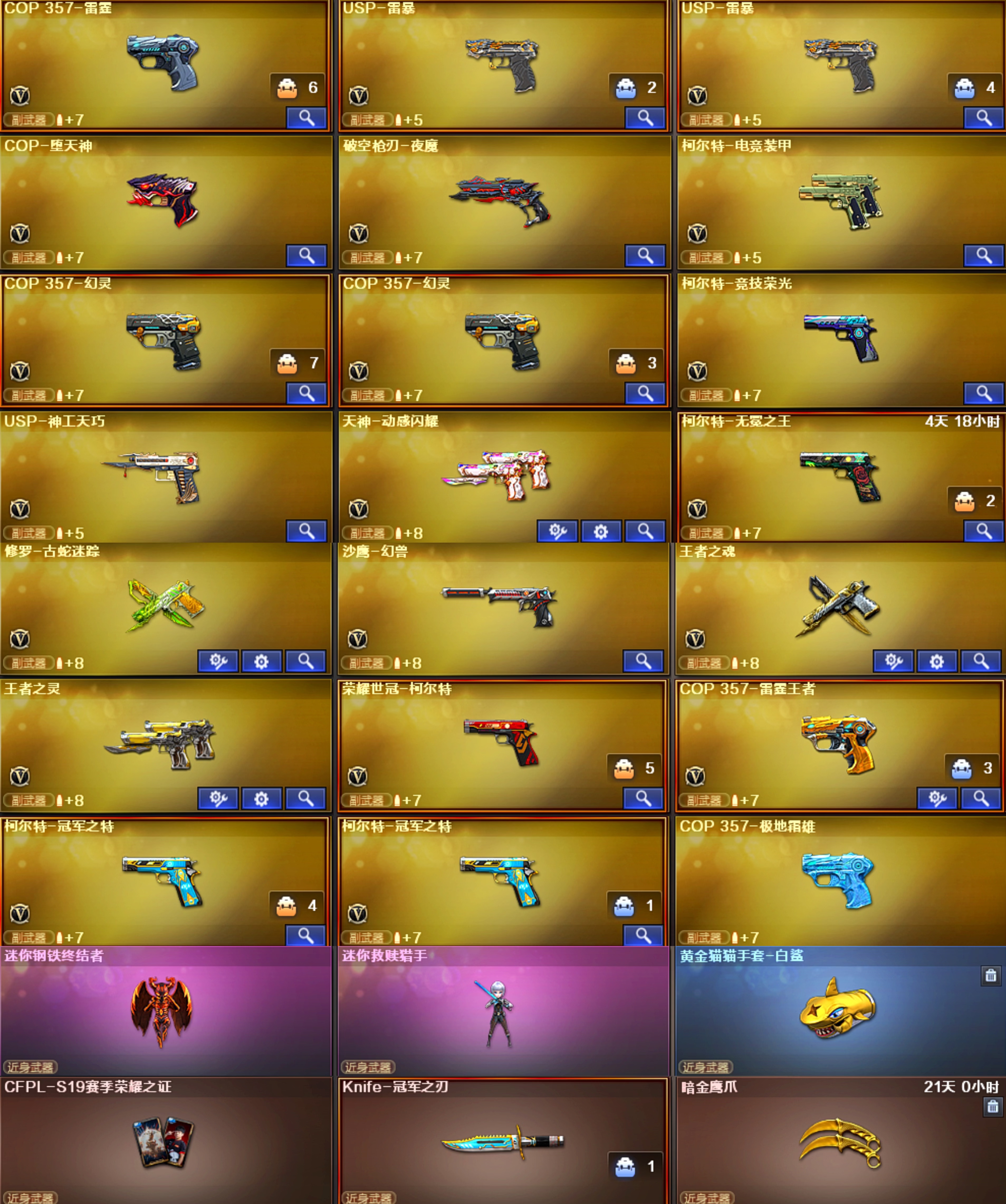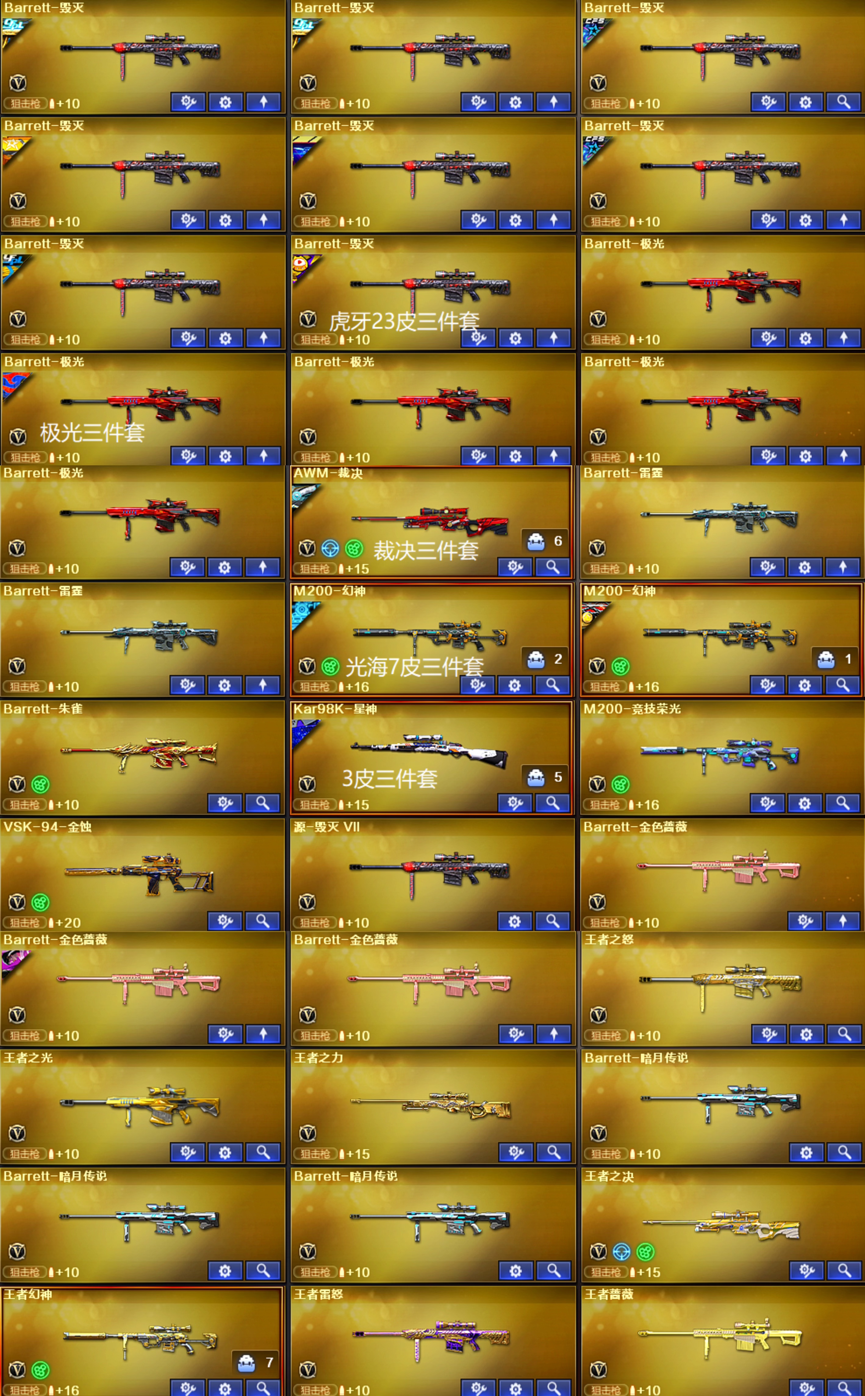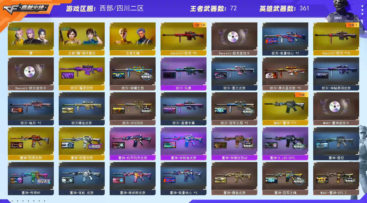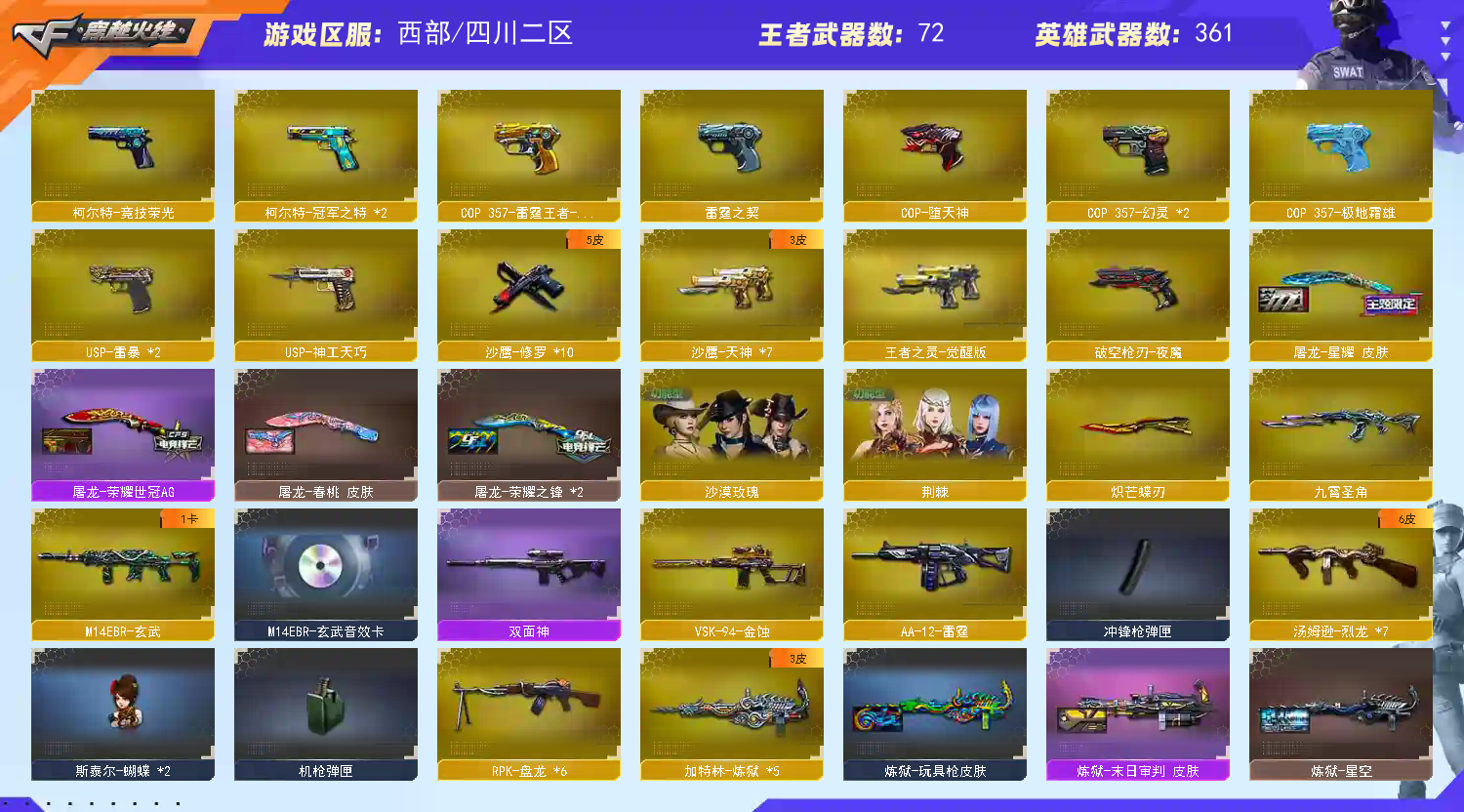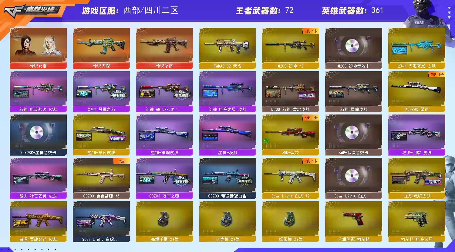星神3皮肤带卡 裁决音效卡 白虎黄金松狮4皮 qbz冠军 法码斯天戎 雷神荣耀之魄 23皮 毁灭虎牙23皮 火麒麟电竞30皮 黑骑士15皮 黑龙8皮肤 极光三件套 6烈6盘6炼狱小钢 蝴蝶刀 AA12擎天柱 臻选套金狐