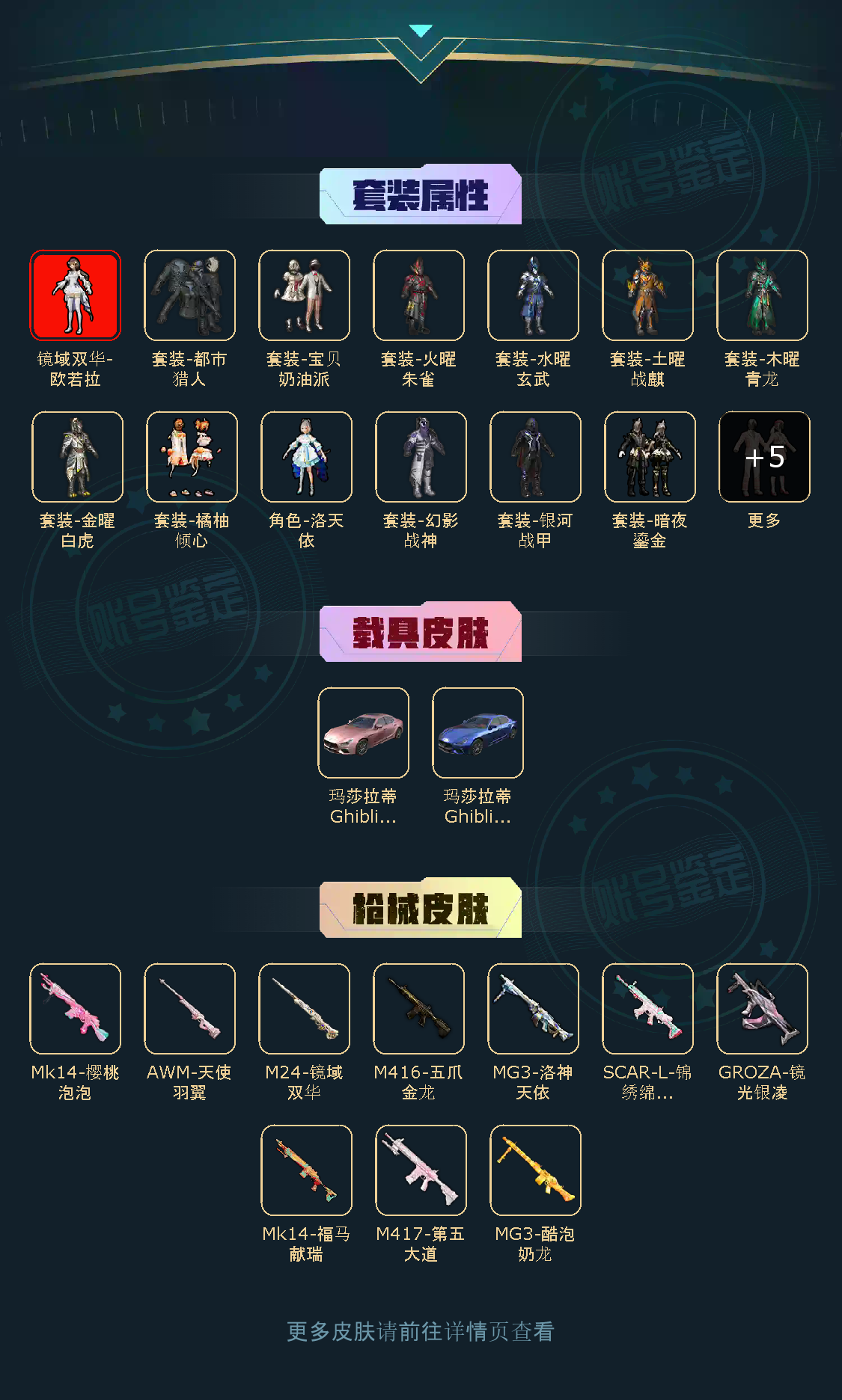 【稀有资产】镜域双华-欧若拉[3级]/角色-千金淑猫/套装-第五大道/M416-五爪金龙/熔岩游骑兵面罩/套装-深海小丑鱼/套装-都市猎人/套装-奇异狩猎者/套装-粉红小猪/套装-浪漫天命/套装-雪山精英/套装-暗影哥特/套装-迅捷狂鲨/套装-绒宝小鹅/套装-狂战萌兔/套装-冷酷挑战者/角色-都市丽猫/角色-摩登魅猫