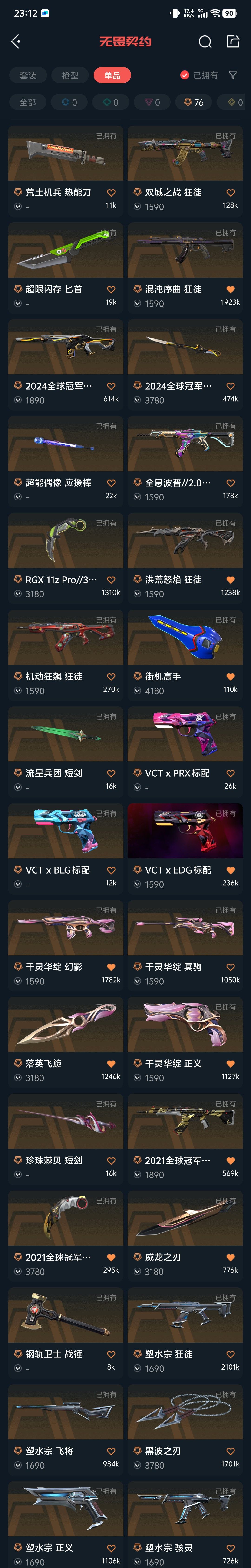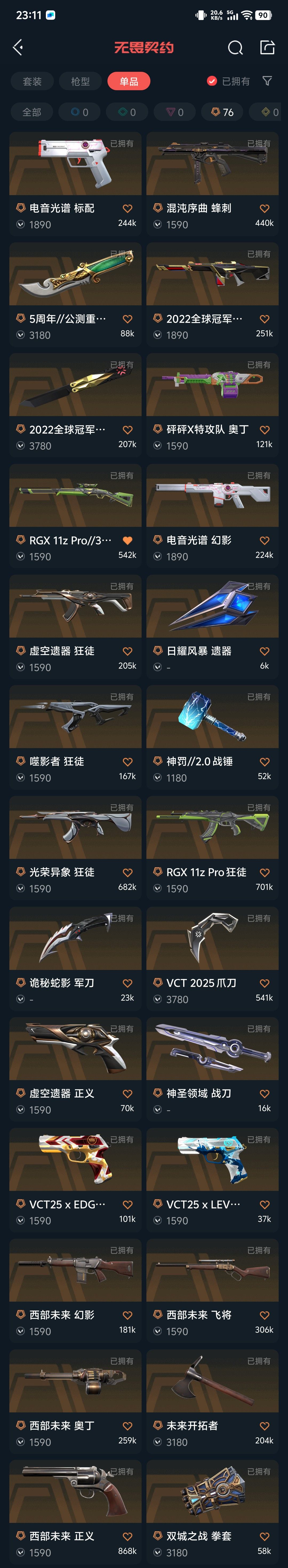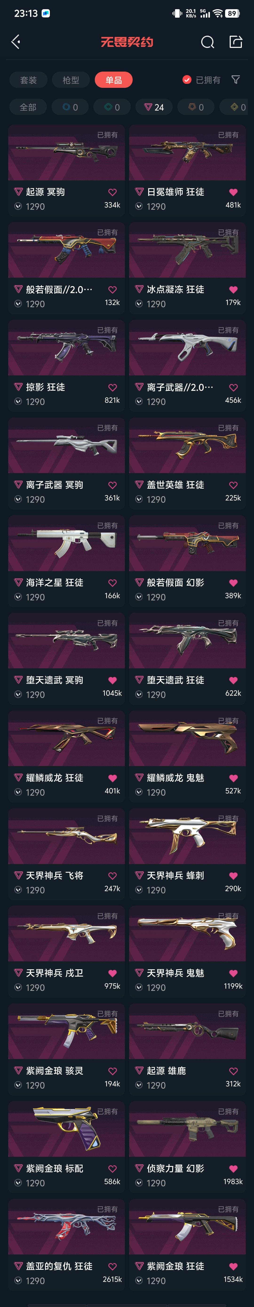 【拥有手枪】西部未来-正义,VCT25-x-EDG-标配,VCT-x-EDG-标配,双城之战-正义,VCT-x-NRG-标配,VCT-x-PRX-标配,VCT-x-LEV-标配,混沌序曲-短炮,781-A协议-正义,天界神兵-鬼魅,离子武器-正义,神圣领域-狂怒,荒土机兵-标配,超限闪存-正义,流星兵团-鬼魅,珍珠棘贝-狂怒,钢轨卫士-狂怒,钢轨卫士-短炮,沙尘幻旅-正义,弧光异彩-短炮,合金战车-正义,超能冲撞-标配,月球哨兵-正义,纳米-正义,逆冲蛮牛-狂怒,模拟赫兹-鬼魅,浮光跃金-标配,聚合之力-狂怒,采蜜小蜂队-鬼魅,纤云弄巧-正义,战术熊与伙伴们-狂怒,纤云弄巧-短炮,战术熊与伙伴们-标配,深海水族-短炮,复古浪潮-正义,光导纤维-鬼魅,天才少女-短炮,光导纤维-标配,萌彩剪影-狂怒,胡桃狂想-鬼魅,宿怨-鬼魅,信手涂鸦-鬼魅,彩梦之城-标配,数码咒术-鬼魅,花漾粉红-狂怒,
