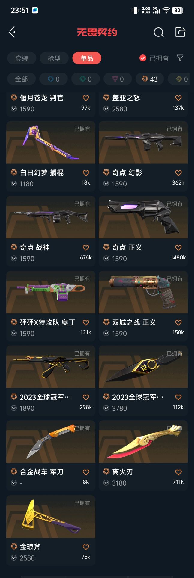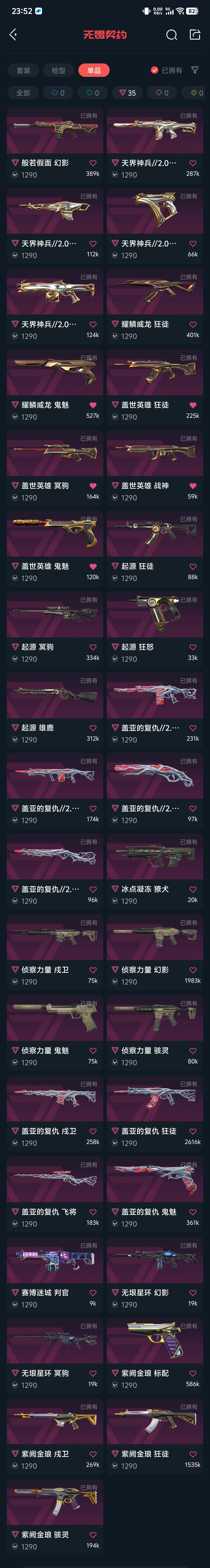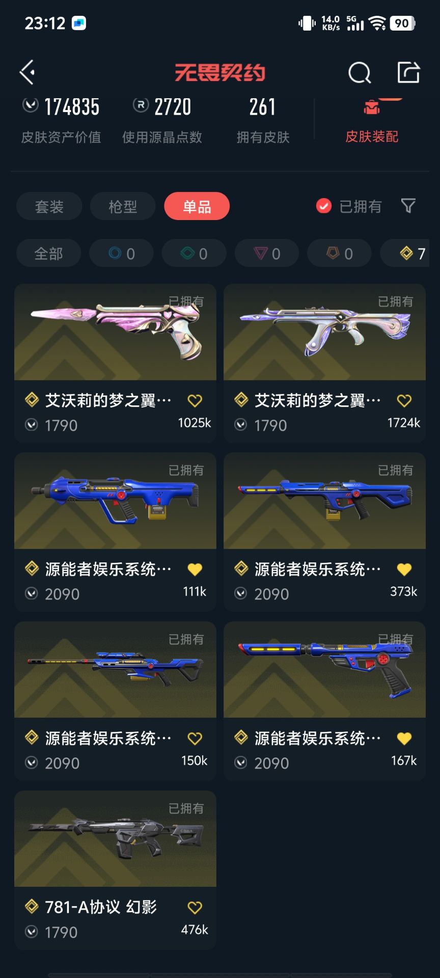 【拥有手枪】西部未来-正义,VCT25-x-EDG-标配,VCT-x-EDG-标配,双城之战-正义,VCT-x-NRG-标配,VCT-x-PRX-标配,VCT-x-LEV-标配,混沌序曲-短炮,781-A协议-正义,天界神兵-鬼魅,离子武器-正义,神圣领域-狂怒,荒土机兵-标配,超限闪存-正义,流星兵团-鬼魅,珍珠棘贝-狂怒,钢轨卫士-狂怒,钢轨卫士-短炮,沙尘幻旅-正义,弧光异彩-短炮,合金战车-正义,超能冲撞-标配,月球哨兵-正义,纳米-正义,逆冲蛮牛-狂怒,模拟赫兹-鬼魅,浮光跃金-标配,聚合之力-狂怒,采蜜小蜂队-鬼魅,纤云弄巧-正义,战术熊与伙伴们-狂怒,纤云弄巧-短炮,战术熊与伙伴们-标配,深海水族-短炮,复古浪潮-正义,光导纤维-鬼魅,天才少女-短炮,光导纤维-标配,萌彩剪影-狂怒,胡桃狂想-鬼魅,宿怨-鬼魅,信手涂鸦-鬼魅,彩梦之城-标配,数码咒术-鬼魅,花漾粉红-狂怒,