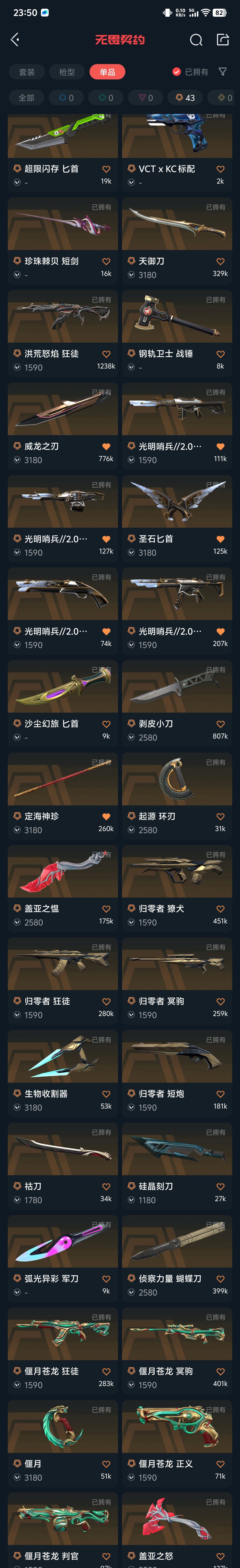 【拥有套装】创纪元套装(创·纪元-狂徒,创·纪元-莽侠,创·纪元-骇灵,创·纪元-正义,镭切)双城之战套装(双城之战-狂徒,双城之战-拳套)破败军械套装(破败军械-幻影,破败军械-戍卫,破败军械-骇灵,破败军械-鬼魅,破败王者之残刃)塑水宗套装(塑水宗-骇灵,塑水宗-狂徒,塑水宗-飞将,塑水宗-正义,黑波之刃)全息波普套装(全息波普-獠犬,全息波普-奥丁,全息波普-判官,全息波普-狂怒,全息匕首)奇点2.0套装(奇点//2.0-狂徒,奇点//2.0-鬼魅,奇点//2.0-蝴蝶刀)2024全球冠军赛套装(2024全球冠军赛-幻影,2024全球冠军赛-战刀)2023全球冠军赛套装(2023全球冠军赛-狂徒,2023全球冠军赛-苦无)2021全球冠军赛套装(2021全球冠军赛-狂徒,2021全球冠军赛-爪刀)紫阙金琅套装(紫阙金琅-戍卫,紫阙金琅-狂徒,紫阙金琅-骇灵,紫阙金琅-标配,金琅斧)掠影套装(掠影-狂徒,掠影-冥驹,掠影-戍卫,掠影-正义,影刃)