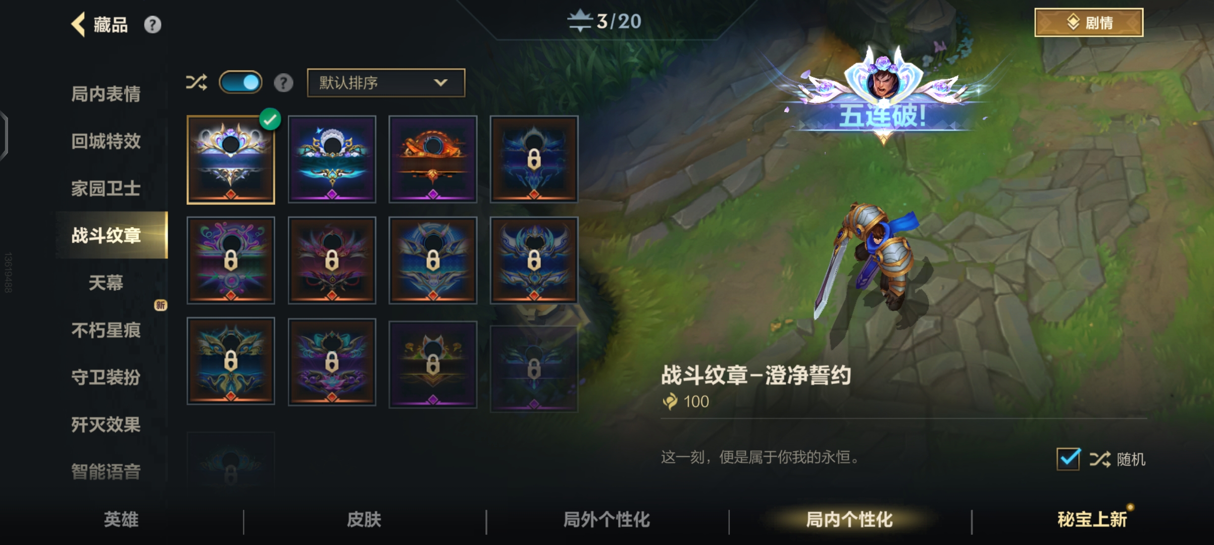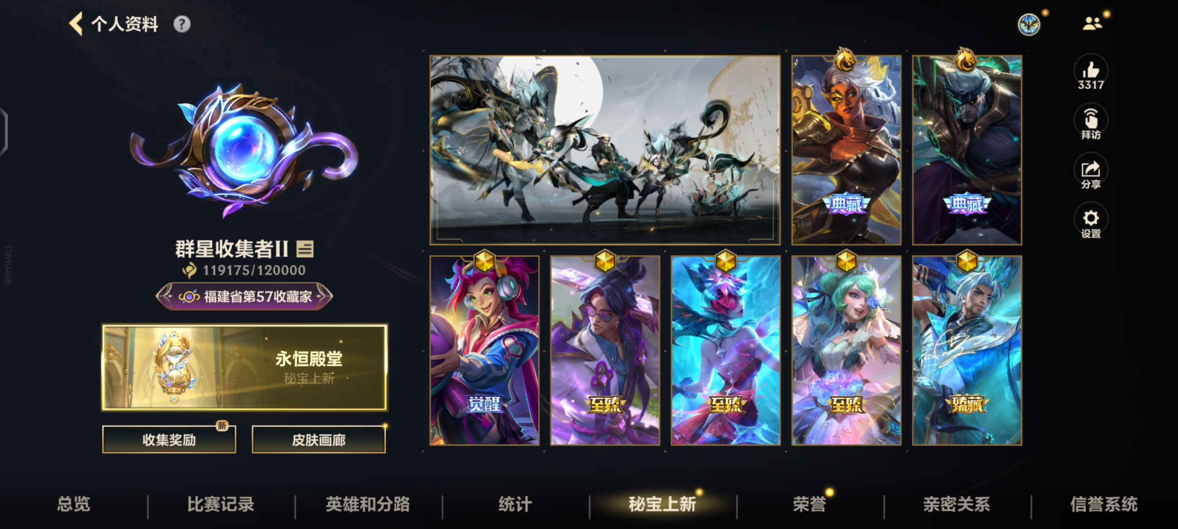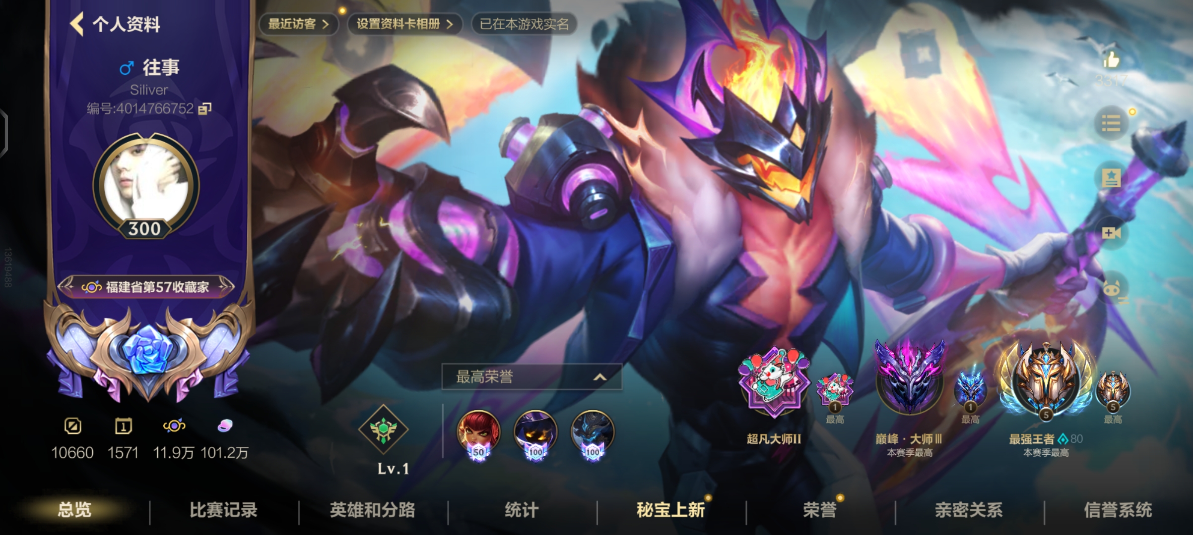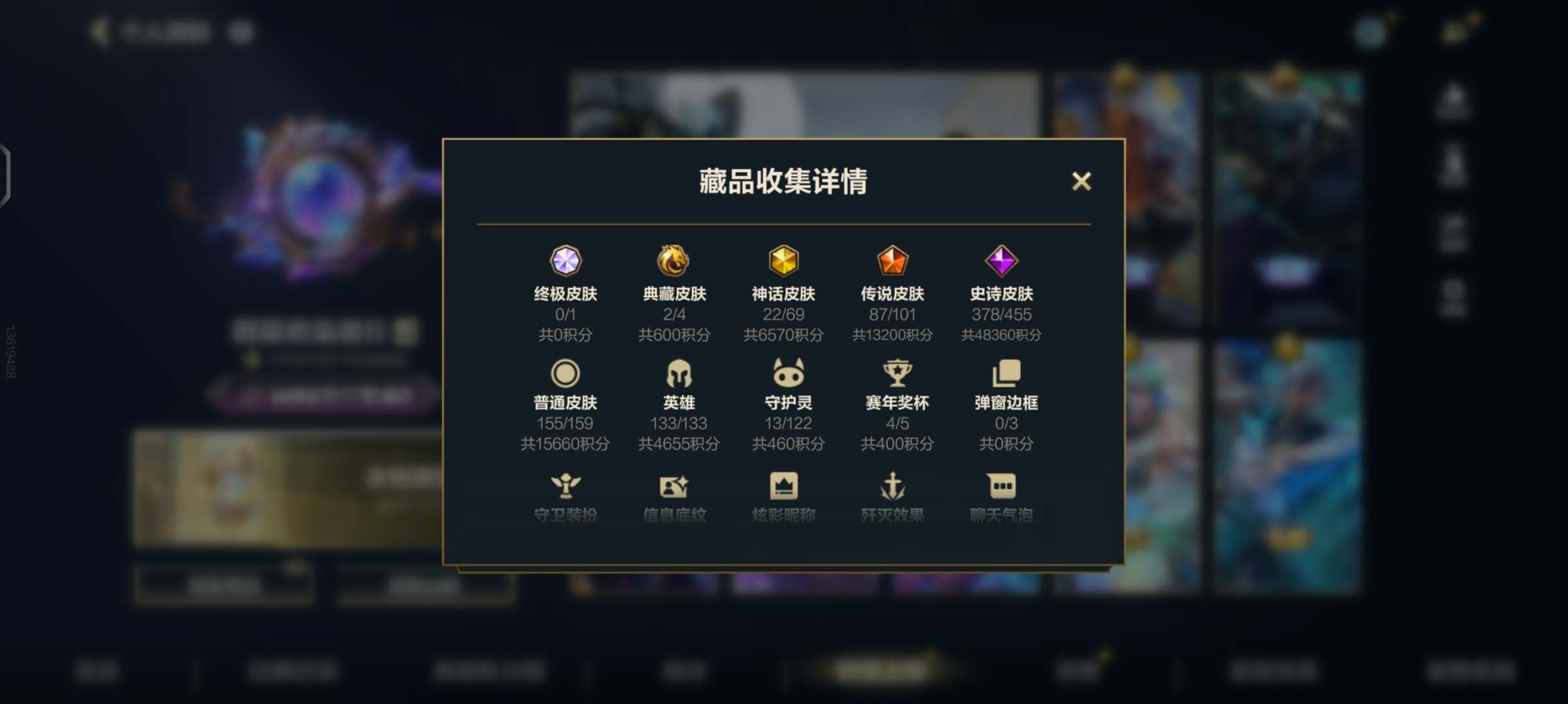 11w收藏分 皮肤645 2典藏/21神话/86传说/376史诗/ 最强王者 645 【游戏段位】最强王者 【终极皮肤】0 【典藏皮肤】2 超武乾坤裁决德莱厄斯 超武乾坤征服莎弥拉 【神话皮肤】21 狂潮裂变金克丝 臻藏御风墨影亚索 至臻深海奇域莫甘娜 至臻星之守护者辛德拉 至臻灵魂莲华易 至臻水晶玫瑰格温 此志凌云嘉文四世 渔帆满载亚索 夜星流火金克丝 巡游踏云霄墨菲特 春晖仙子苍云缥缈卡莎 冠星耀辰盖伦 光焰澎湃火力全开格雷福斯 海克斯科技安妮 海克斯科技阿利斯塔 海克斯科技吉格斯 龙的传人李青 星域游侠圣时豪杰崔斯特 星之守护者永绽盛芒阿狸 银鞍玉甲嘉文四世 最终BOSS里大魔王维迦 【传说皮肤】86 深海奇域厄运小姐 西部魔影永恩 秘灵奇境婕拉 碧空长歌萨勒芬妮 水晶玫瑰阿狸 青花瓷奥瑞利安·索尔 霸天原祖沃利贝尔 咖啡甜心悠米 神龙尊者昼日真龙亚索 源计划超体莫德凯撒 北极星神黛安娜 双城之战殊途杰斯 暗星锤石 海魔至尊亚托克斯 幻灵特战队长菲奥娜 驯龙学者黑默丁格 律政大亨蒙多医生 星之守护者阿卡丽 水晶玫瑰卡莎 魄炼九幽派克 神龙尊者圣龙李青 花车开起来咯墨菲特 御风墨影亚索 淳和墨意嘉文四世 暗星女王拉克丝 暗星尊烬 霸天零式赛恩 春晖神女莫甘娜 地狱之门卫士加里奥 斗魂觉醒莎弥拉 斗魂无双亚索 福牛守护者厄运小姐 灌篮高手德莱厄斯 光明哨兵格雷福斯 光明哨兵薇恩 黑夜使者亚索 剪胜裁春格温 KDAALLOUT萨勒芬妮 黎明使者锐雯 黎明使者永恩 黎明使者德莱文 炼狱魔犬内瑟斯 灵魂莲华瑟提 灵魂莲华锤石 灵魂莲华阿狸 魔女伊芙琳 女主播迦娜 欧米伽小队幽灵特工提莫 日蚀骑士蕾欧娜 神龙尊者驭风啸龙易 神拳李青 神王盖伦 神王德莱厄斯 水晶玫瑰拉克丝 水晶玫瑰伊泽瑞尔 水晶玫瑰萨勒芬妮 水晶玫瑰阿卡丽 太空律动猫猫布里和里茨布里茨 天煞劫 跳跳倩影厄运小姐 未来战士凯特琳 西部魔影卢锡安 西部魔影大小姐蕾欧娜 西部天使艾希 西部天使赛娜 心之钢凯隐 星域武神贾克斯 星域游侠崔斯特 星之守护者卡莎 星之守护者阿狸 星之守护者金克丝 星之守护者辉霞 星之守护者落霞 星之守护者熠洛 星之守护者陨洛 驯龙炮手崔丝塔娜 耀星女神拉克丝 源计划毁灭派克 源计划净化薇恩 源计划联合艾希 源计划林易 源计划泯灭雷克顿 月蚀骑士蕾欧娜 战斗学院凯特琳 战斗学院伊泽瑞尔 最终BOSS维迦 【稀有回城特效】 【史诗皮肤】376 狂潮异想金克丝 深海奇域潘森 深海奇域莫甘娜 深海奇域锤石 深海奇域凯尔 抵抗军雷神杰斯 红帽迷影薇古丝 欧米伽小队天雷爆破手维迦