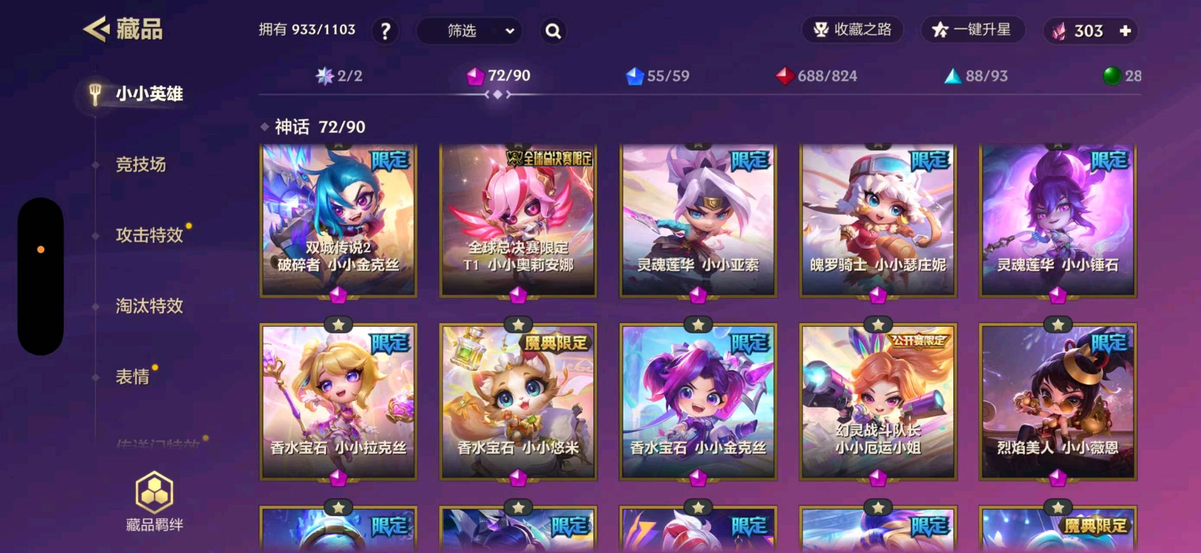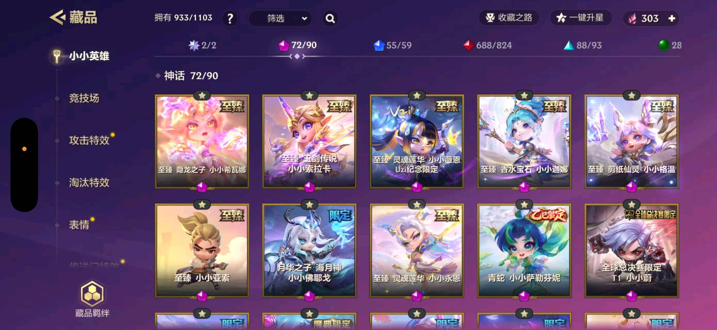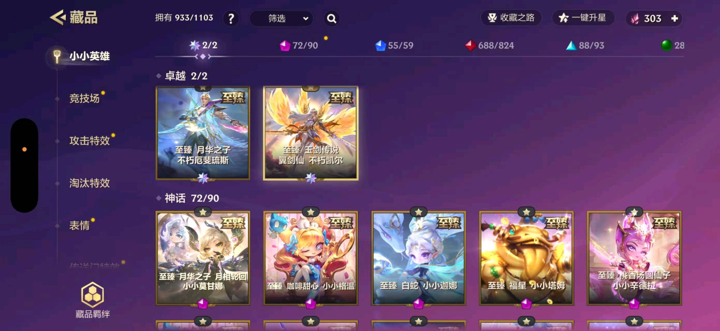 至臻白蛇风女 至臻福星塔姆 至臻龙女 至臻剪纸格温 至臻灵魂莲花永恩 至臻灵魂莲花薇恩 至臻香水宝石风女 至臻玉剑传说索拉卡 至臻辛德拉 三星胡子喵