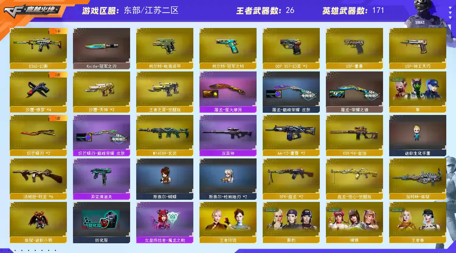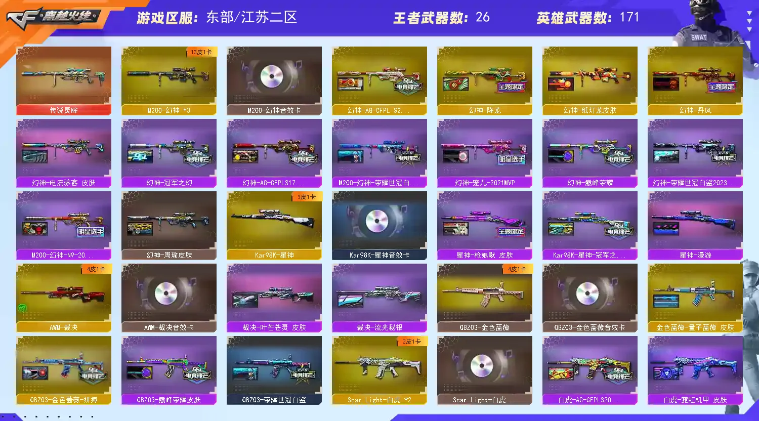 【稀有武器】:传说灵眸/M200-幻神(3)/Kar98K-星神/VSK-94-金蚀/G36C-幻影/ScarLight-白虎(2)/M14EBR-玄武/M4A1-青龙/HK417-朱雀/QBZ03-天罚/M4A1-幻灵/M4A1-神工天巧(2)/USP-雷暴/柯尔特-电竞装甲/COP357-幻灵(3)/USP-神工天巧/天神-动感闪耀/柯尔特-冠军之特/QBZ03-金色蔷薇/AK47-火麒麟(3)/M4A1-黑龙/M4A1-雷神(5)/M4A1-黑骑士(2)/AK47-无影/AK47-黑武士/荣耀世冠-火麒麟/白虎-电玩蓝兔/Barrett-毁灭(4)/Barrett-极光/AWM-裁决/RPK-盘龙(2)/加特林-炼狱/汤姆逊-烈龙(6)/AA-12-雷霆(2)/炽芒蝶刃(2)/斩神刀-雷暴/马来剑-夜魔/幻灵之锋/擎天-竞技荣光/唐刀-神工天巧