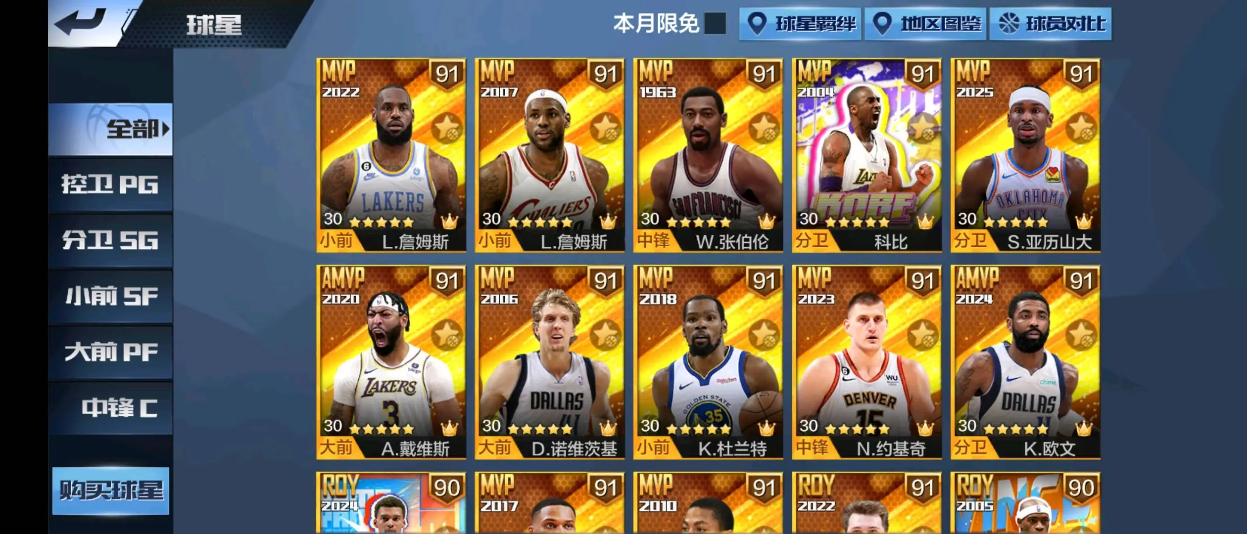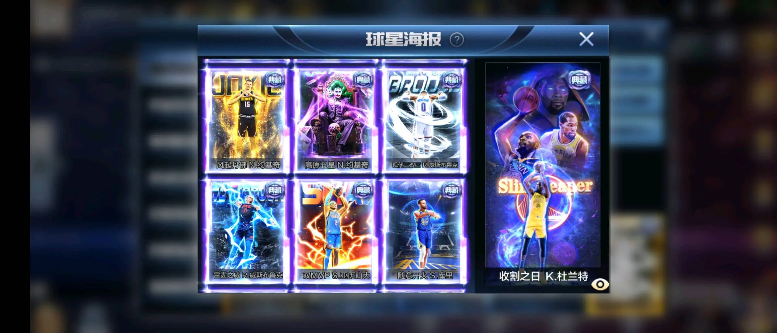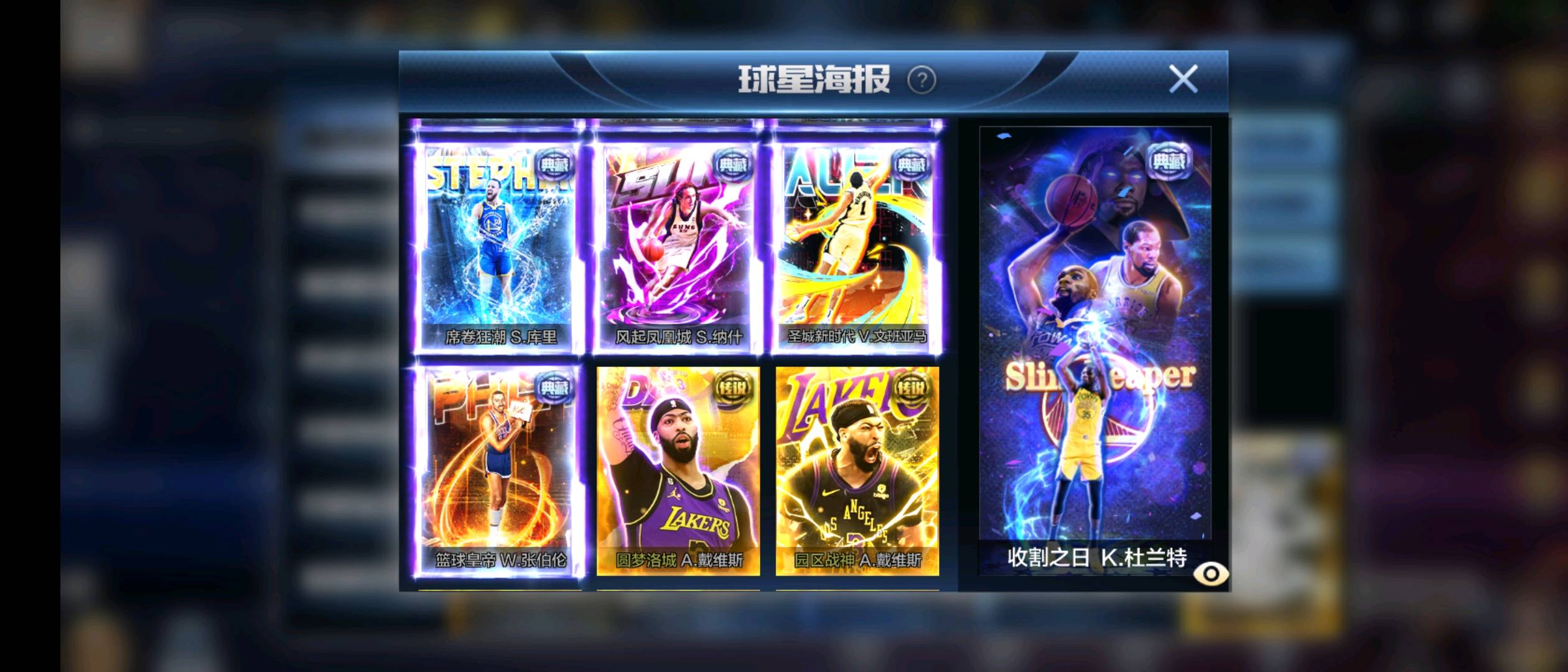 新科比 典藏新库里 典藏亚历山大 典藏新詹姆斯 典藏纳什 典藏幼詹 典藏张伯伦 典藏戴维斯 双典藏约基奇(两个典藏开满) 双典藏威少(两个典藏开满) 典藏老库里 典藏司机 典藏欧文 典藏杜兰特 典藏文班亚马 硬汉坎普 硬汉卡特 硬汉新大虫罗德曼