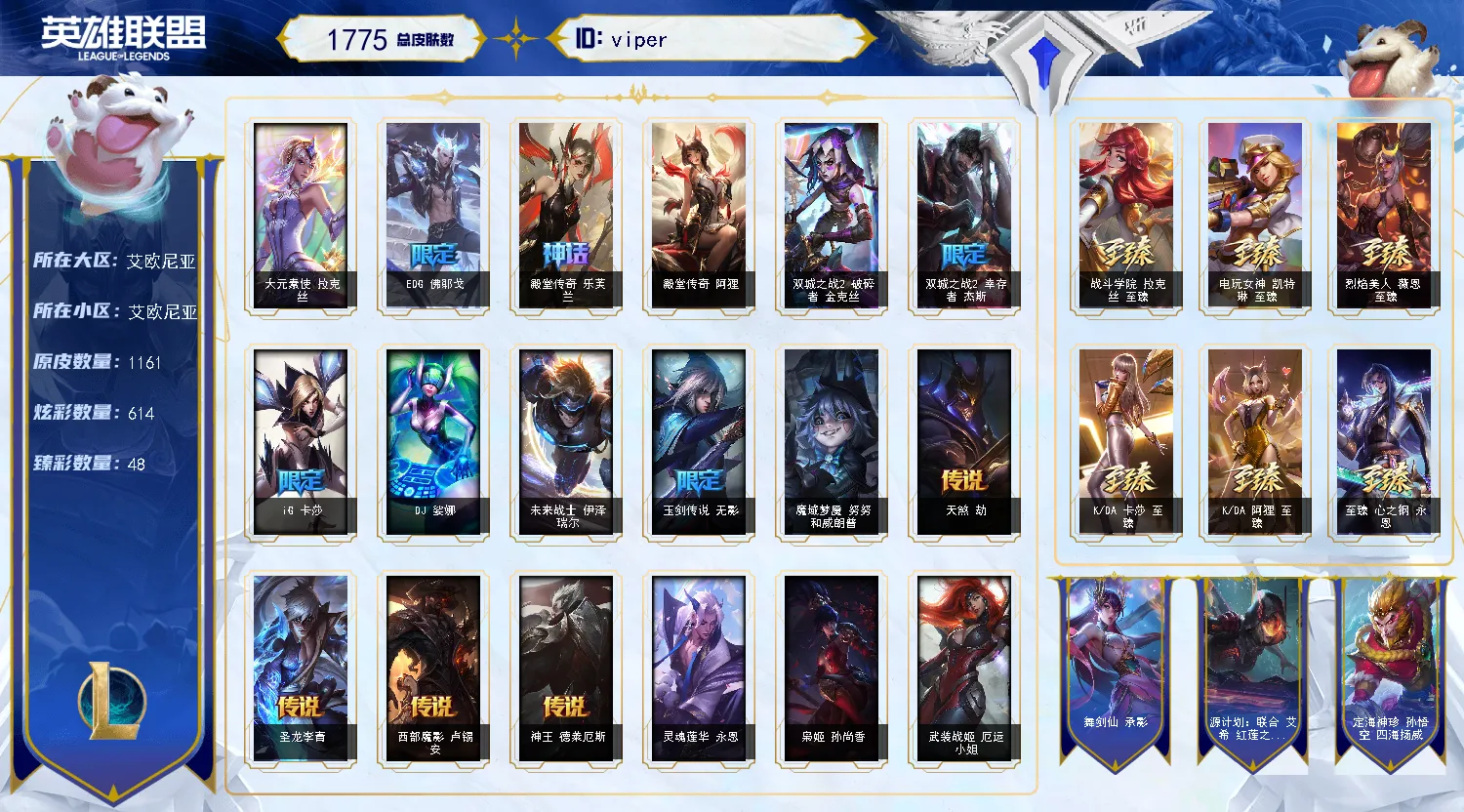 艾欧尼亚|1763皮|69神话|殿堂阿里|圣堂金克丝|EDG破军套|斗魂莲花套|云顶七神话|男女刀