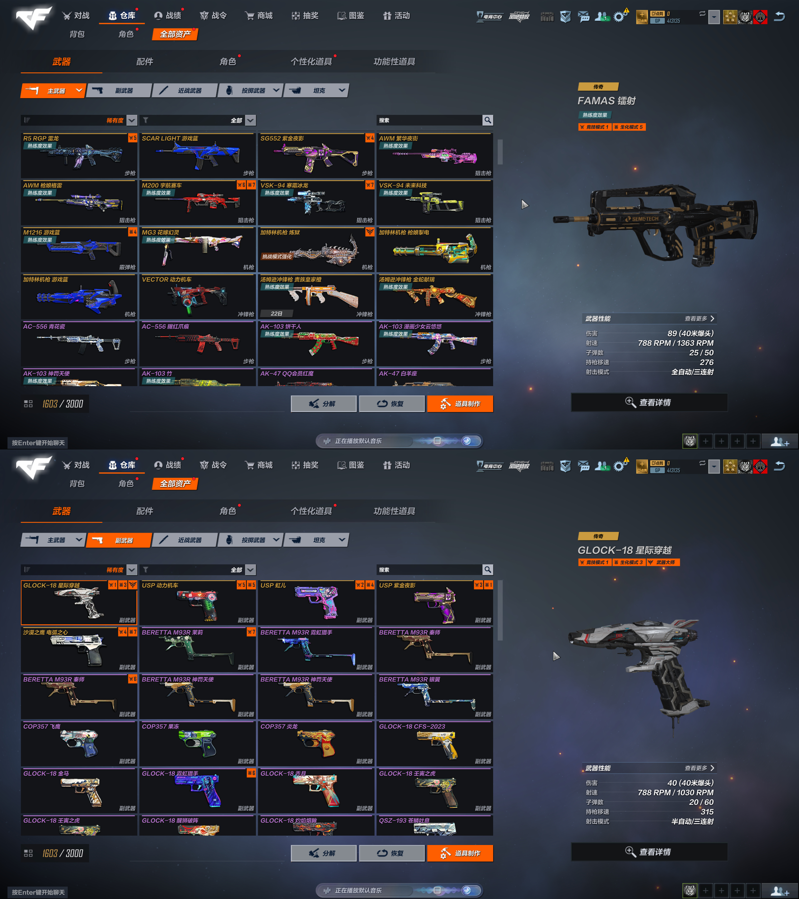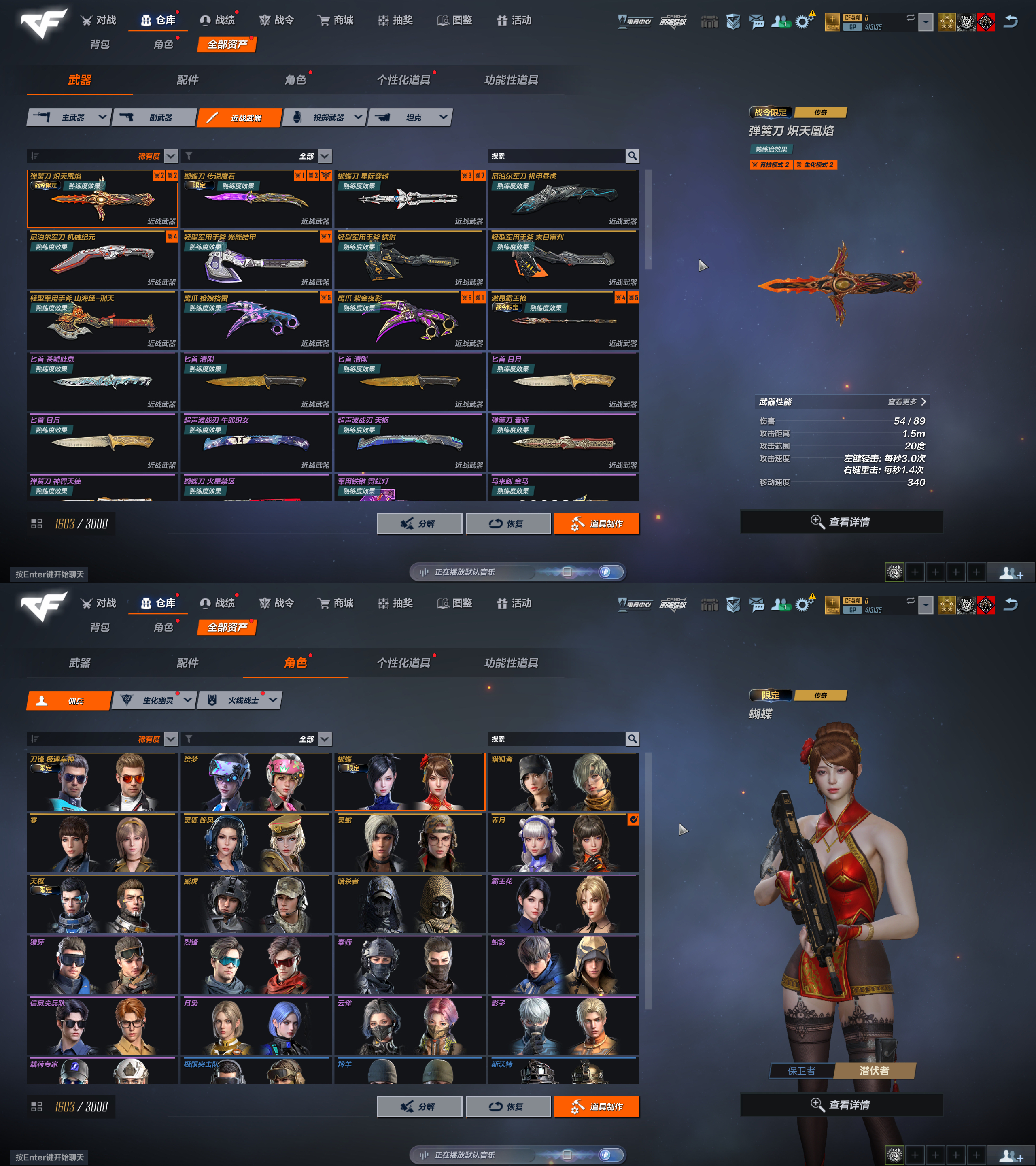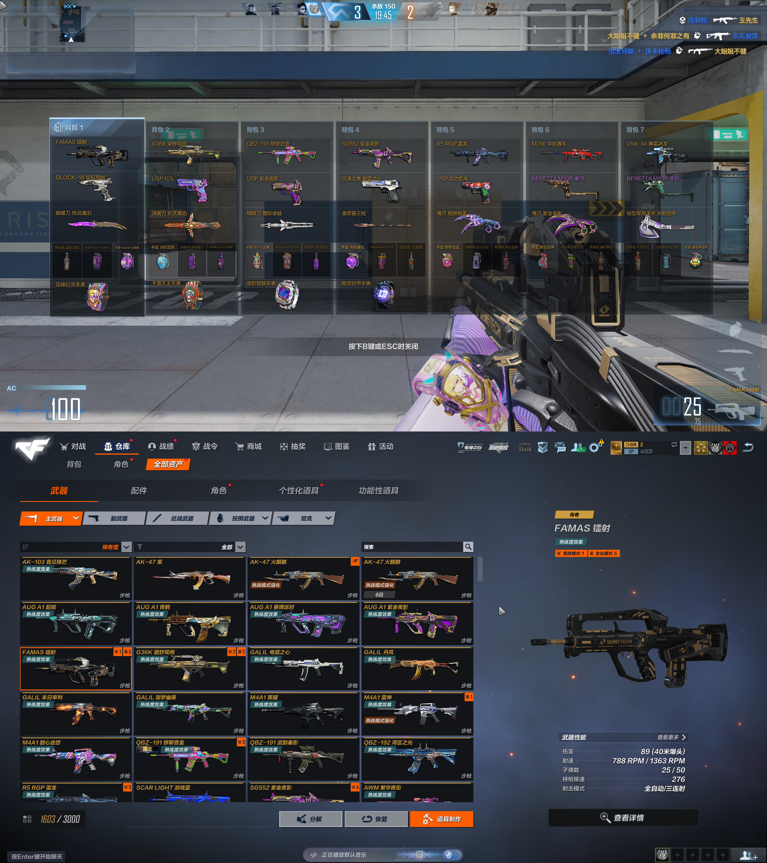 FAM镭射✅G36望舒观阙✅弹簧刀炽天凰焰✅蝴蝶刀魔石✅星际✅激昂霸王枪✅流浪者赏金猎人✅蝴蝶✅刀锋