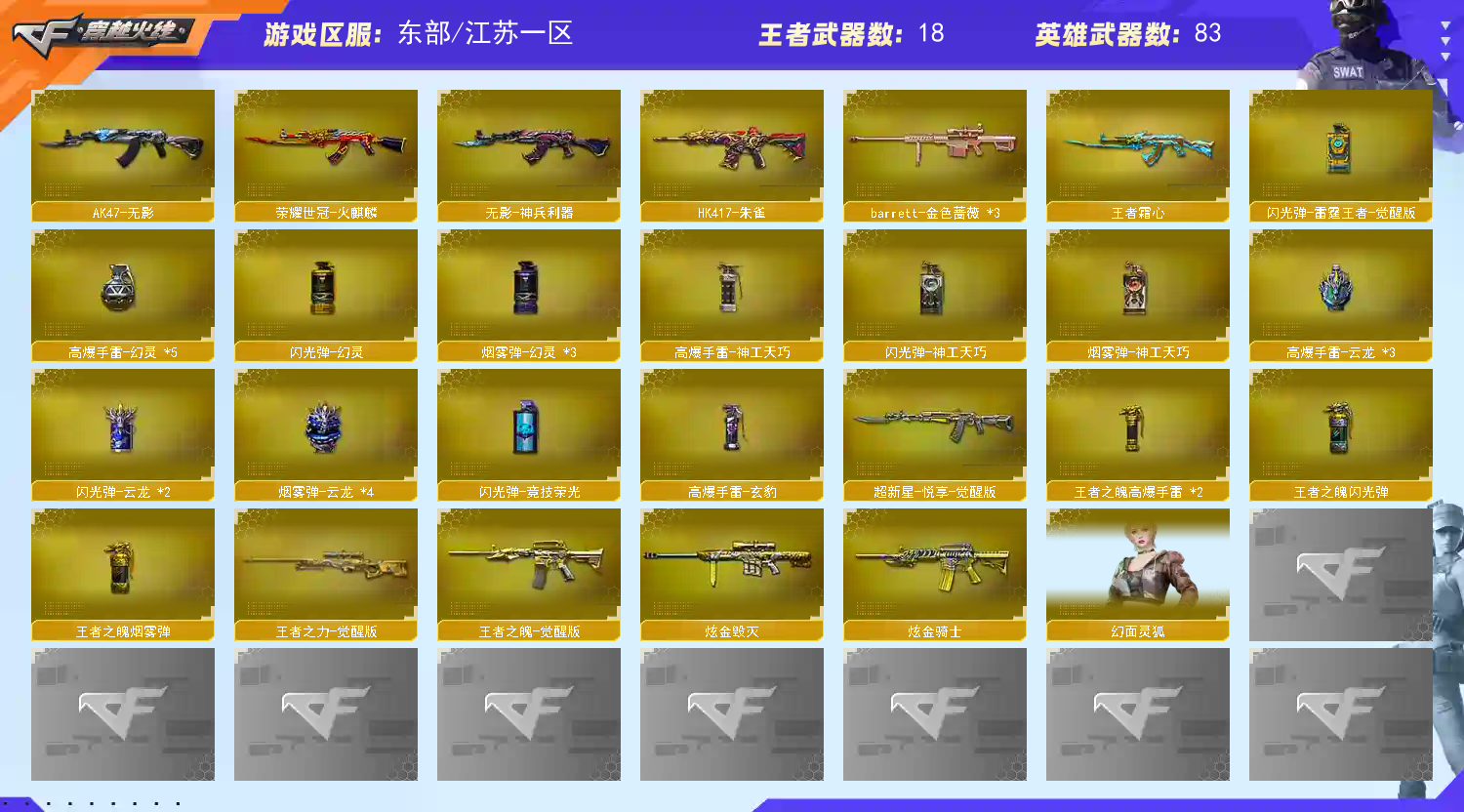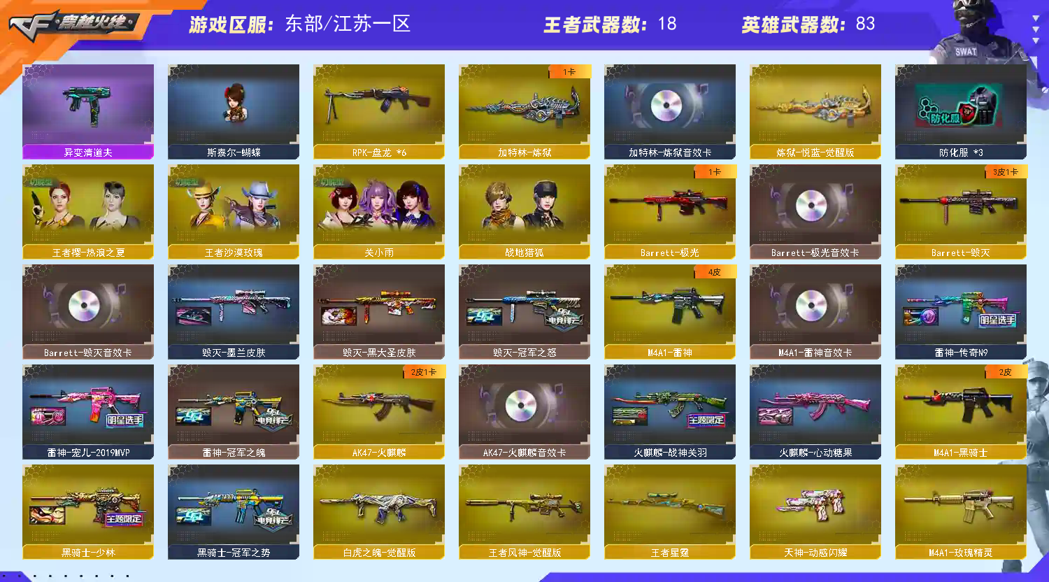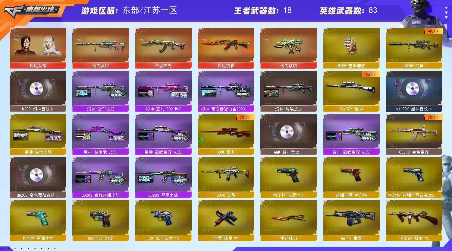 【亮点解析 四防女帝 幻神4皮带卡 星神3皮带卡 裁决三件套 生化满配 】【四防传说女帝】【传说灵眸 传说辉光 传说夜影 传说破晓 】【m200幻神+音效卡+宠儿+周瑜+冠军之幻+荣耀世冠白鲨2023】【98k星神+音效卡+破竹+枪娘+巅峰荣耀 】【王者风神 王者星霆 】【6烈龙 6盘龙 炼狱+卡 炽芒蝶刃 斯太尔蝴蝶 四防王者沙漠玫瑰】【g36c幻影】【白虎之魄】【qbz金色蔷薇+卡+巅峰荣耀+冠军之薇】【朱雀】【火麒麟+卡】【雷神+卡+冠军之魄+宠儿+白鲨冠军+n9】【黑骑士+少林+冠军之势 】【毁灭+卡+枪娘+ag15冠军+冠军之怒 】【极光+卡】【裁决 +卡+异化之源+巅峰荣耀】【武器:王者之魄 王者霜心 荣耀世冠火麒麟 】【12手枪:修罗*4 幻灵 天神 云龙*2 柯尔特荣耀世冠白鲨 柯尔特无冕之王 荣耀世冠柯尔特 冠军之特 】【12刀具:龙啸 麒麟刺 幻灵之峰 竞技荣光 王者玉锋 王者冰锋】【3雷套:幻灵雷 神工天巧 云龙雷 】【小人枪:雷神小红 m200喜狮迎春】【音效卡:炼狱音效卡 星神音效卡 天罚音效卡 火麒麟音效卡 雷神音效卡 金色蔷薇音效卡 幻神音效卡 极光音效卡 毁灭音效卡 裁决音效卡 】【四防角色:王者沙漠玫瑰 】