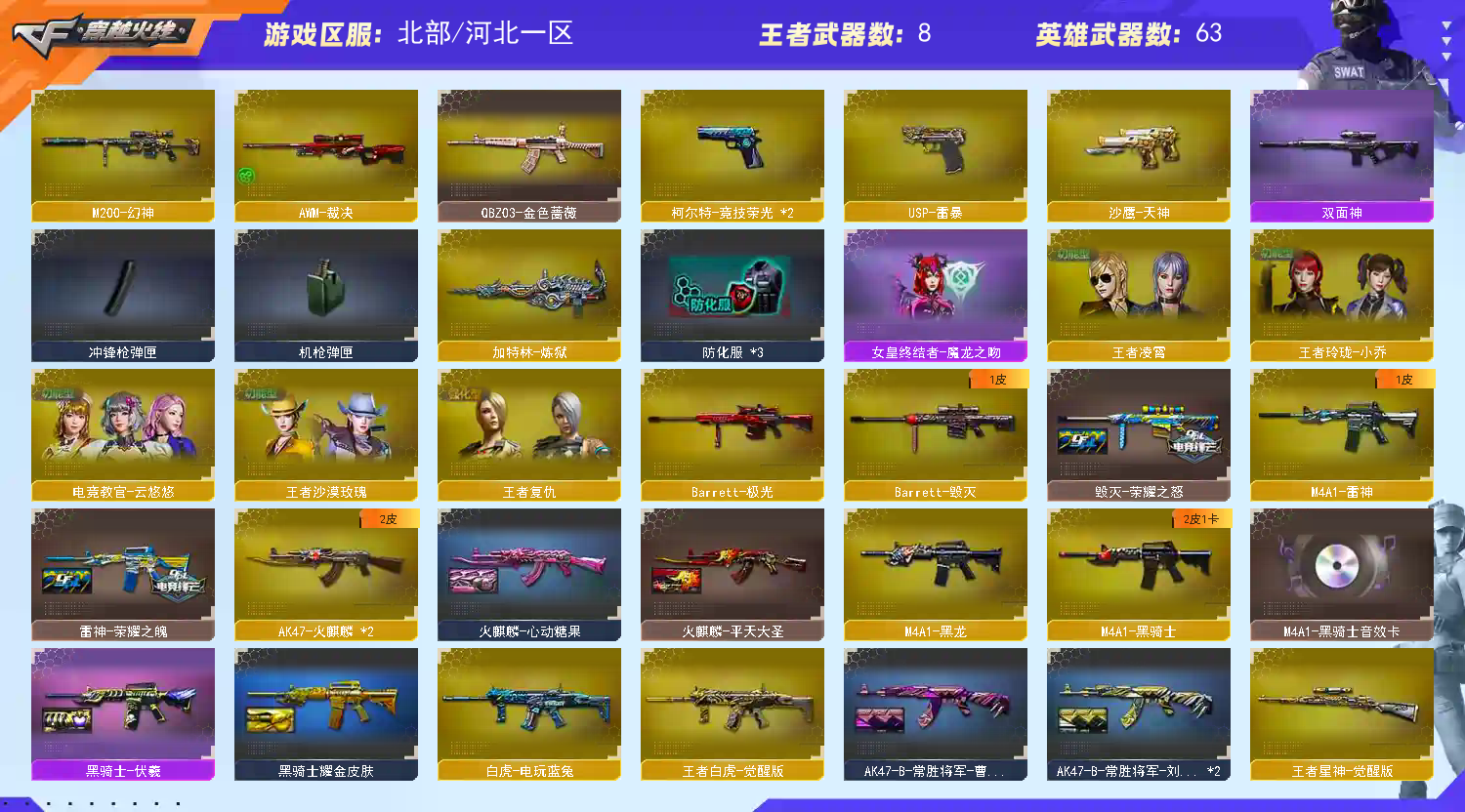 幻神-竞技荣光-王者星神-qbz金色蔷薇-王者白虎-白虎电玩蓝兔-毁灭-裁决-usp雷暴-柯尔特竞技荣光-天神动感闪耀-龙啸-擎天-竞技荣光手雷套-云悠悠-乔伊教练-王者沙漠玫瑰-黑骑士音效卡-荣耀之魄-荣耀之怒