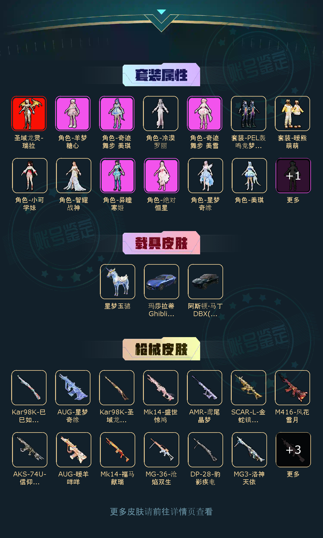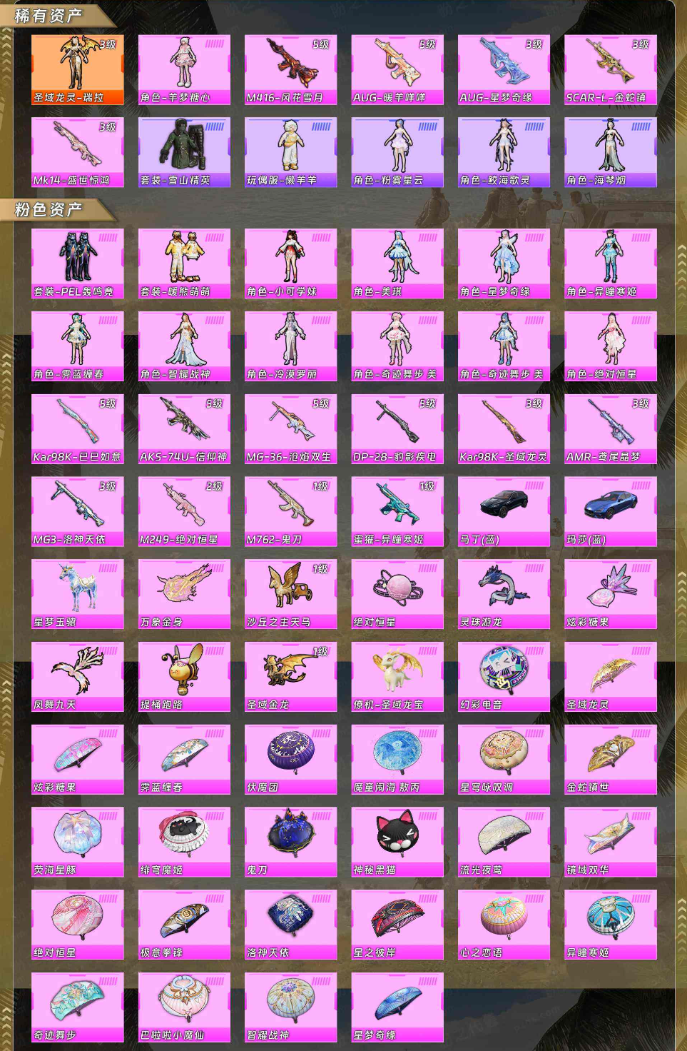 【稀有资产】圣域龙灵-瑞拉[3级]/角色-羊梦糖心/M416-风花雪月/AUG-暖羊咩咩/AUG-星梦奇缘/SCAR-L-金蛇镇世/Mk14-盛世惊鸿/套装-雪山精英/玩偶服-懒羊羊/角色-粉雾星云/角色-鲛海歌灵/角色-海琴烟