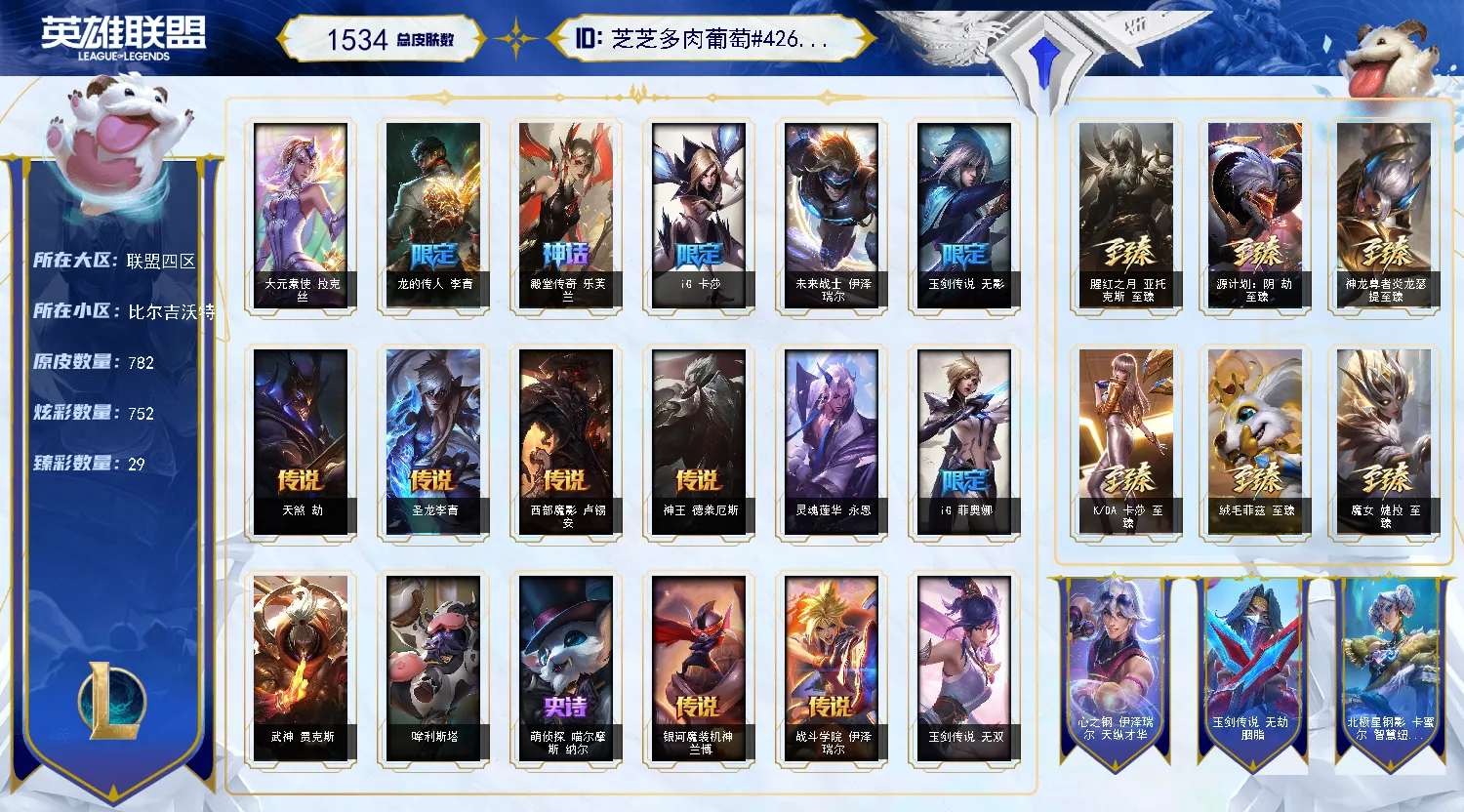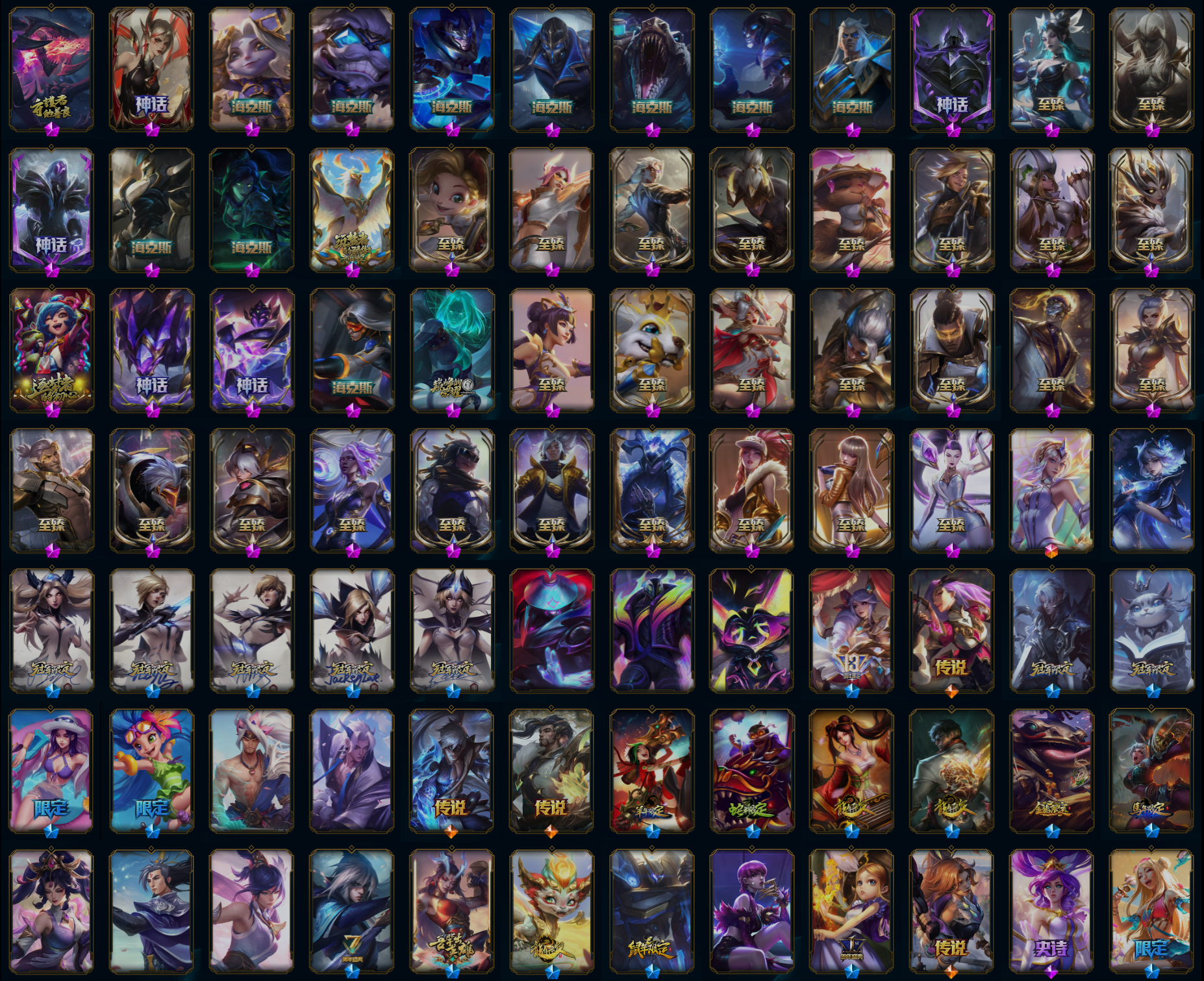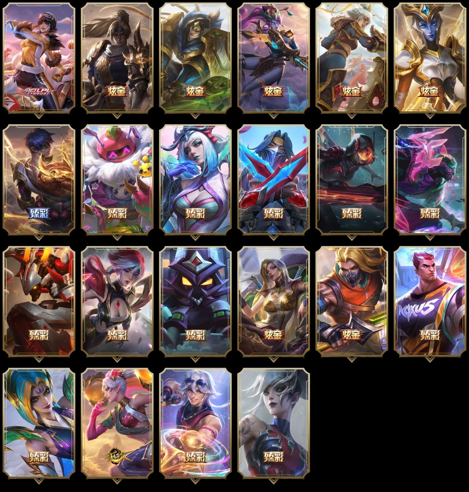 【重要皮肤】DRX亚托克斯至臻 星之守护者辛德拉至臻 月蚀骑士赛娜至臻 青花瓷拉克丝至臻 神凰行者烈羽焰凰霞至臻 魔女婕拉至臻 奥术师佐伊至臻 未来战士卢锡安至臻 真实伤害亚索至臻 真实伤害赛娜至臻 灵魂莲华提莫至臻 灵能特工伊泽瑞尔至臻 福牛守护者菲奥娜至臻 源计划逆流塞拉斯至臻 源计划阴劫至臻 神龙尊者炎龙瑟提至臻 黑夜使者凯隐至臻 焰执事布兰德至臻 KDA二代卡莎至臻 KDA一代卡莎至臻 KDA卡莎2022至臻 KDA阿卡丽至臻 魅惑女巫厄运小姐至臻 魅惑女巫厄运小姐2022至臻 源计划正义艾瑞莉娅至臻 绒毛菲兹至臻 玉剑传说武剑仙至臻 腥红之月亚托克斯至臻 腥红之月亚托克斯2022至臻 黑夜使者李青至臻 黑夜使者李青2022至臻 殿堂传奇乐芙兰 水晶巫灵泽拉斯 灰烬骑士莫德凯撒 灰烬骑士派克 海克斯科技雷克顿 海克斯科技斯维因 海克斯科技吉格斯 海克斯科技玛尔扎哈 海克斯科技嘉文四世 海克斯科技崔丝塔娜 水晶掠夺者卡兹克 暗星科加斯 零之枪骑赫卡里姆 摄魂使者薇恩 新创战纪希维尔 胜利剑圣易 胜利女神娑娜 胜利之王泰达米尔 胜利巨口克格莫 钢铁军团拉克丝 荣誉使者玛尔扎哈 养蜂人辛吉德 安妮梦游仙境 玉剑传说无影 女帝格温 玉剑传说无劫 玉剑传说舞龙卫 点心宝贝阿木木 龙的传人李青 天龙之子斯莫德 替父从军花木兰 神龙烈焰金克丝 碧玉之牙卡西奥佩娅 古琴余韵娑娜 紫金罗刹莫甘娜 烈焰美人薇恩 纳财大帝塔姆 神龙之翼库奇 王国机神玄武盖伦 胜利女神瑟庄妮 胜利机器人布里茨 胜利女神奥莉安娜 胜利枪神卢锡安 胜利之剑亚托克斯 觅心魔灵奥莉安娜 双城之战2微光实验室辛吉德 圣诞老人布隆 冰雪风暴希维尔 冰封王子蒙多 魄罗骑士瑟庄妮 圣诞糖果棒厄运小姐 死亡誓约劫 海之歌艾希 海之歌萨勒芬妮 泳池派对凯特琳 泳池派对佐伊 泳池派对奥莉安娜 泳池派对塔莉垭 泳池派对厄运小姐 泳池派对格雷福斯 泳池派对雷克顿 泳池派对布隆 鸡里奥 EDG厄斐琉斯 EDG悠米 DWG烬 iG卡蜜尔 iG洛 iG卡莎 iG艾瑞莉娅 iG乐芙兰 iG菲奥娜 SSG霞 SSG纳尔 SSG伊泽瑞尔 SKTT1辛德拉 SKTT1艾克 SKTT1瑞兹 SKTT1伊莉丝 SKTT1雷克顿 SSW泰隆 SSW图奇 SKTT1贾克斯 SKTT1劫 SKTT1婕拉 暗杀星奥莉安娜 暗杀星伊泽瑞尔 Fnatic古拉加斯 Fnatic嘉文四世 Fnatic卡尔萨斯 冰雪节玛尔扎哈 冰雪节辛吉德 防暴士兵格雷福斯 防暴天使凯尔 钢铁之翼艾尼维亚 冠军典狱长锤石 冠军之矛卡莉丝塔 冠军之血希瓦娜 鬼影森森茂凯 胡桃夹子萨科 警用试作体K9内瑟斯 蓝色忧郁崔斯特 南瓜头费德提克 女猎手希维尔 圣诞精灵崔丝塔娜 圣诞开心鬼提莫 圣诞狂欢基兰 圣诞老人古拉加斯 圣诞玩偶波比 圣诞驯鹿克格莫 外星装甲库奇 无头骑士赫卡里姆 喜庆之树茂凯 邪恶圣诞老人维迦 雪默丁格 雪装奈德丽 野兽猎人瑟庄妮 英勇玩具兵普朗克 勇者阿狸 勇者奈德丽 暗影沃里克 冠军之箭艾希 魅惑女巫辛德拉 波比的巧克力工坊 都铎王朝图奇 十五周年纪念希维尔 十周年纪念安妮 源代码乐芙兰 神凰行者瑞羽圣凰艾尼维亚 大元素使拉克丝 未来战士伊泽瑞尔 绝息圣堂洛 星之守护者净化之羽霞