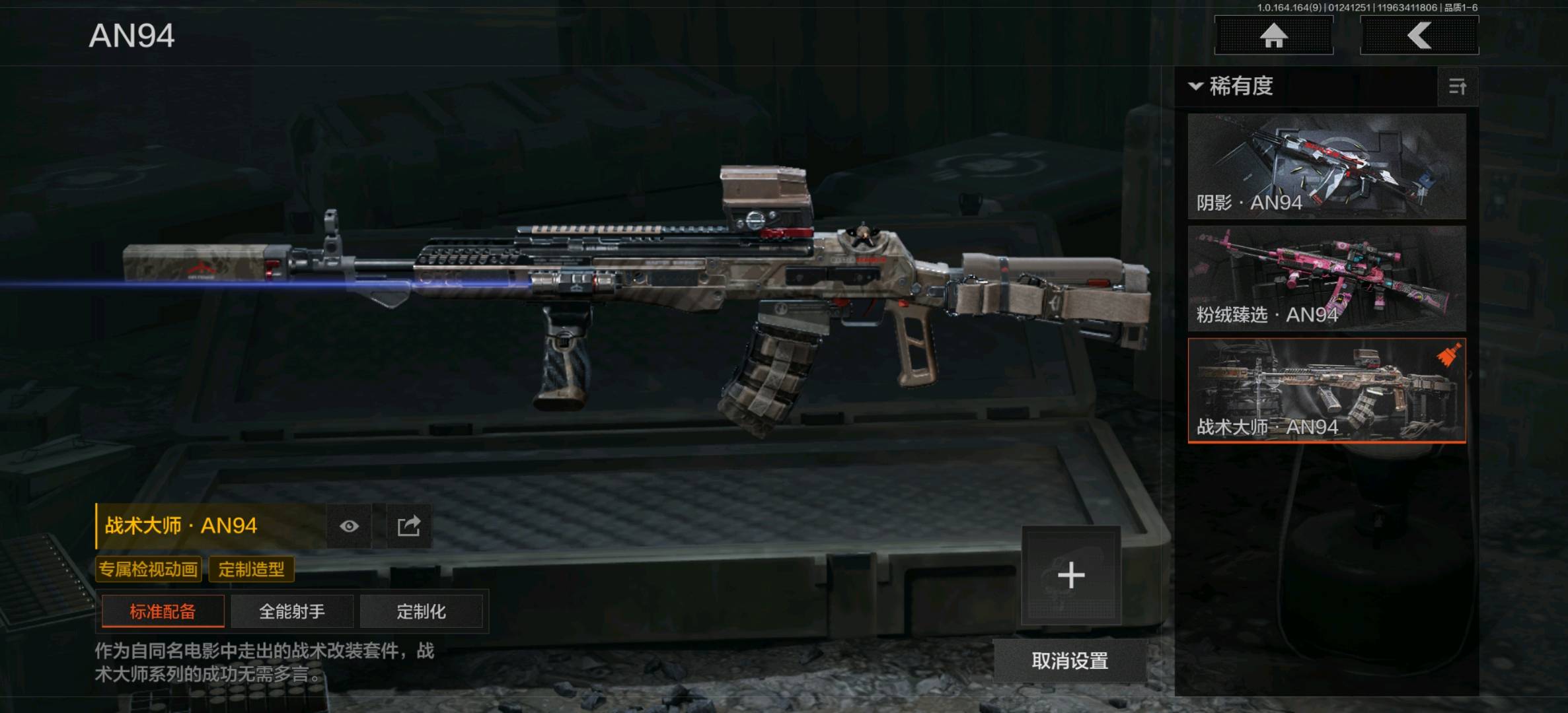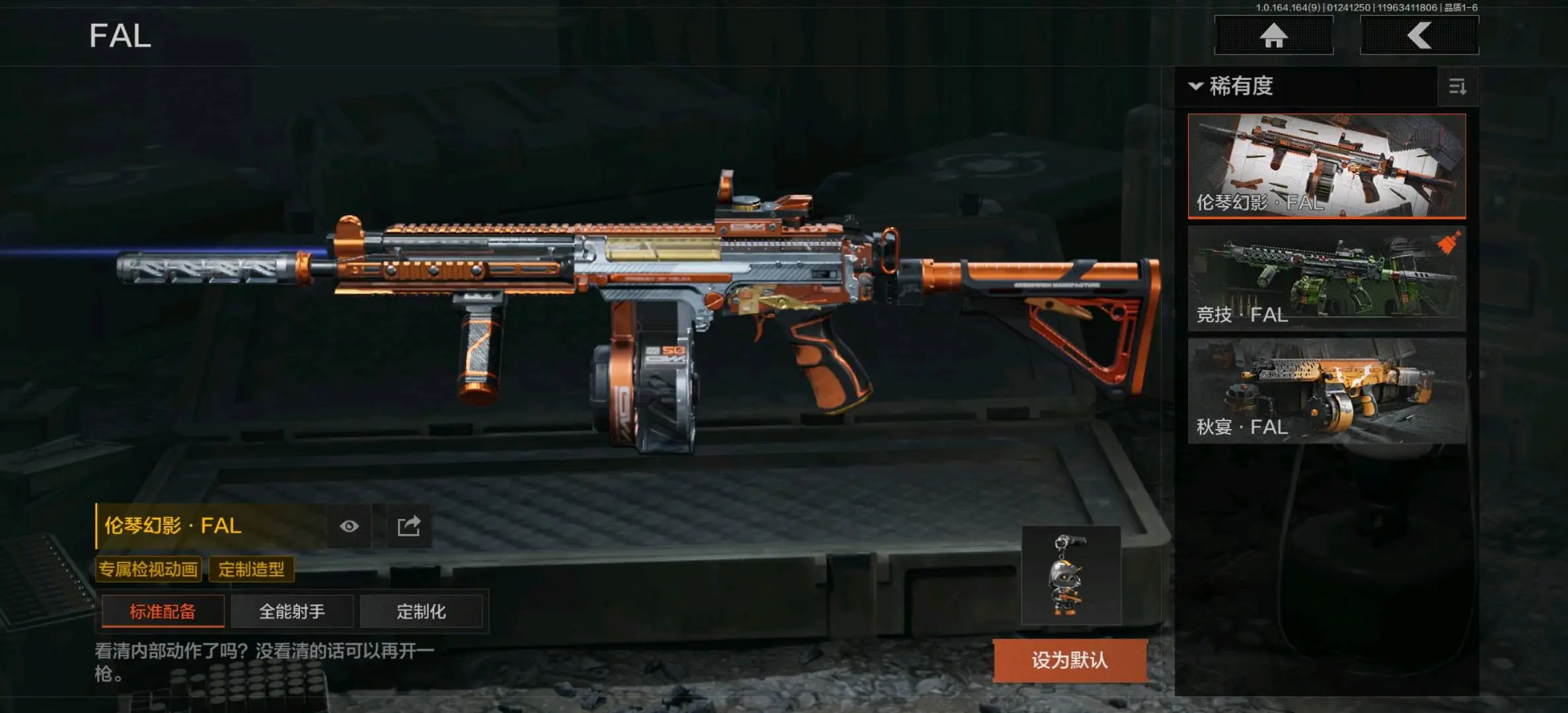伦琴幻影FAL,竞技FAL,告丧夜曲AUG,告丧夜曲AR57,旗帜AEK,战术大师AN94,旧王圣谕QBZ191,浮鳞影青QBZ192,猎手骸骨M4A1,自喷网格H416,鱼跃丹青DTMDR,竞技MDR,涂鸦AK102,战术大师AK74N,伦琴计量AK74N,来战AK74N,山地伪装AK74N,最后防线AKS74U,赢家F2000,炎夏浪花AR57,无声暗月AR57,战术大师AR57,狂怒荣耀AEK,最后防线AEK,粉绒臻选AN94,阴影AN94,典礼武备Groza,伦琴计量SCAR,冬日姜兵SCAR,伦琴计量T951,利齿风暴T03,百锻寒芒T03,骤羽尖啸AK12,鱼跃丹青MCX,典礼武备MCX;