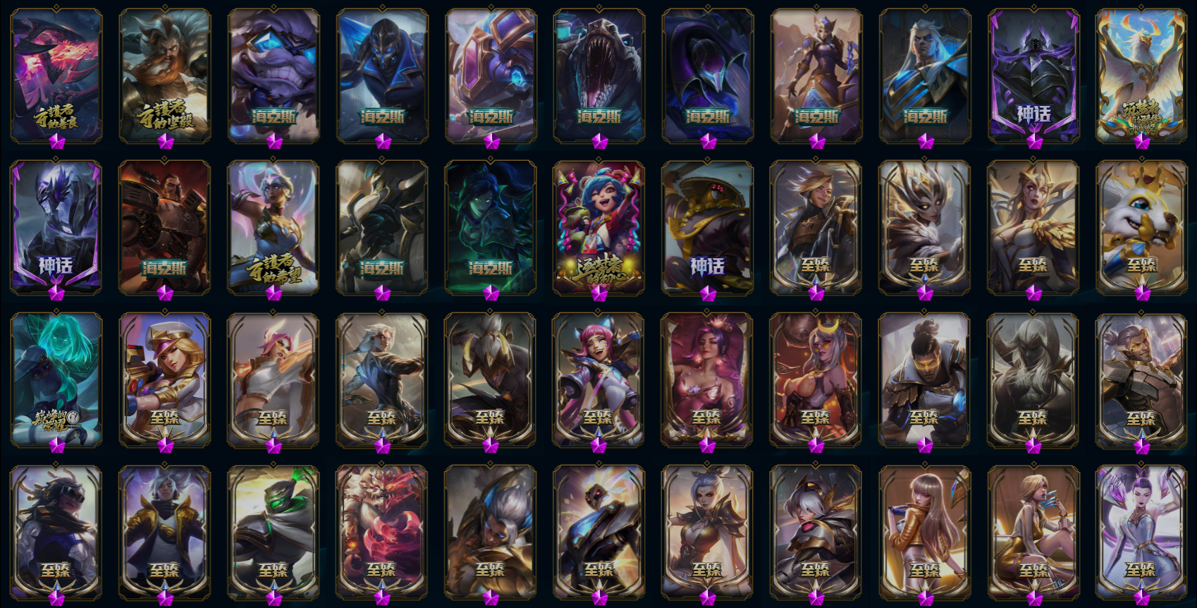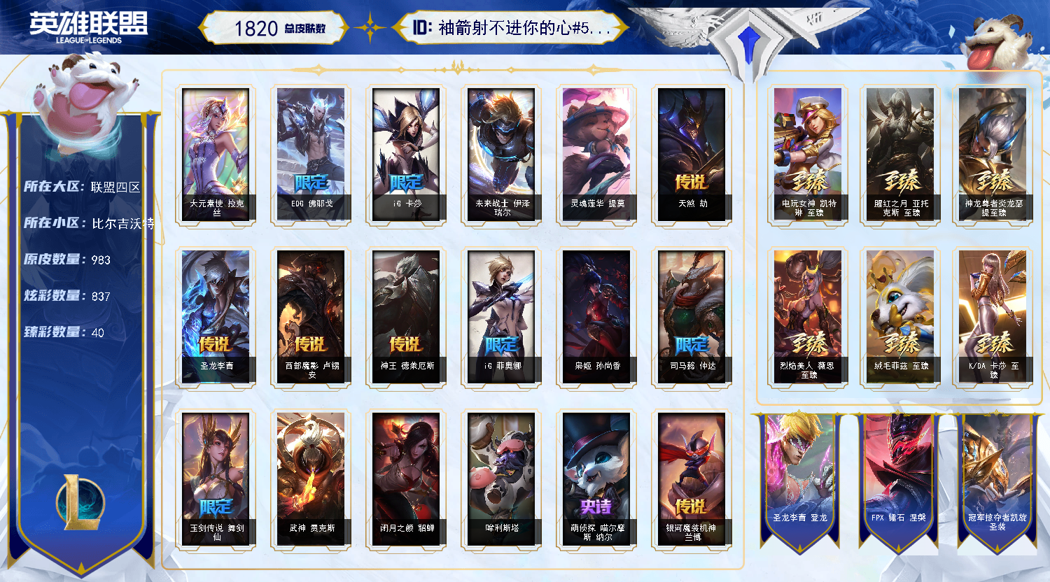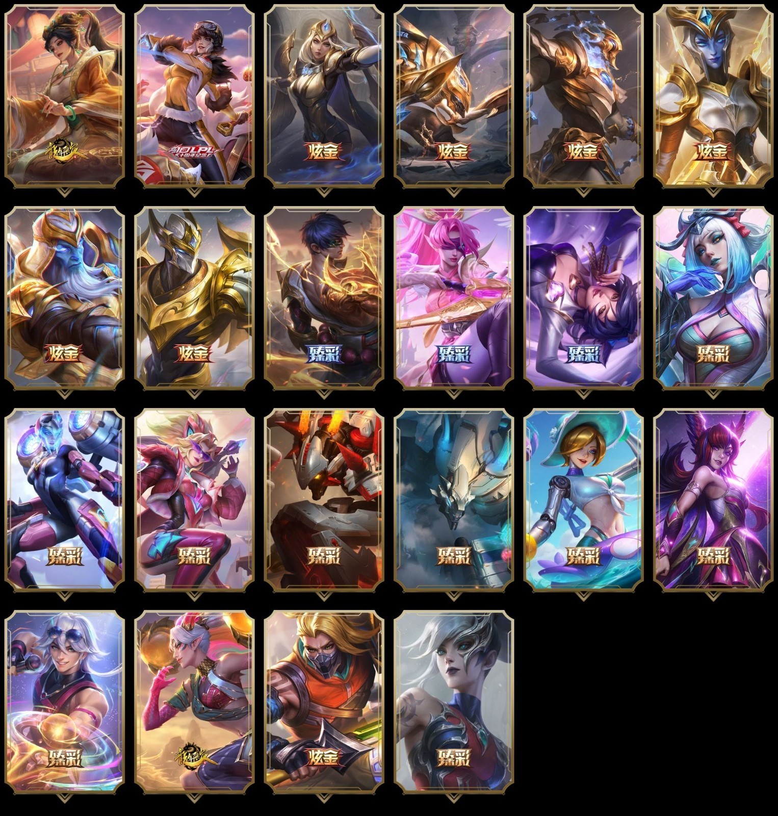 【重要炫彩】古琴余韵娑娜炫金天籁 无畏骑士瑟庄妮赤子初心 冠军之箭艾希凯旋圣装 冠军掠夺者卡兹克凯旋圣装 冠军典狱长锤石凯旋圣装 冠军之矛卡莉丝塔凯旋圣装 冠军之志瑞兹凯旋圣装 冠军之隐劫凯旋圣装 神龙尊者圣龙李青龙腾云起 灵魂莲华薇恩春晓 偶像歌手阿狸极地雪莲 净雪之月莫甘娜冬虹 弹幕天使卡莎炽天使勇敢 幻灵战斗蝠薇恩梦幻强袭 霸天异形卡兹克刹那银光 霸天巨兽雪崩墨菲特 泳池派对奥莉安娜优雅珠光鲸 星之守护者霞烈羽 天煞劫黑洞 灰烬杀手塞拉斯余烬觉醒 灰烬骑士莫德凯撒余烬觉醒 战斗校长悠米独角兽 奥德赛金克丝恒星游历者 星之守护者佐伊迷魂魔女 腥红之月卡特琳娜落樱 源代码乐芙兰梦幻闪击 泳池派对奥莉安娜萌萌少女鲸 幻惑之月希维尔 泳池派对塔莉垭海豚剧院 黎明使者薇恩霞辉 光明哨兵薇恩灵岛抗击者 奈落之炎凯南骄傲之焰 春晖海神卡兹克前程似锦 奥德赛卡兹克恒星游历者 腥红之月易落樱 宇航员波比万有引力 幻惑之月派克 怨之砂派克绯幻 图奇影足梦境勇者 我甜筒怒角维迦 永恒之森维迦致幻菇 霸天龙神奥瑞利安索尔华天 地狱火加里奥骄傲之焰 灌篮高手艾翁浪漫之星3号 激萌鳄霸雷克顿 美喵喵尔 废土男爵兰博音波爆裂 EDG厄斐琉斯破军 EDG佛耶戈破军 EDG格雷福斯破军 EDG悠米破军 EDG佐伊破军 FPX锤石涅槃 FPX李青涅槃 FPX墨菲特涅槃 FPX普朗克涅槃 FPX薇恩涅槃 心之钢伊泽瑞尔天纵才华 天龙之子卡莎飞龙乘云 墨之影武者亚索金墨耀影 魔女阿卡丽虚荣