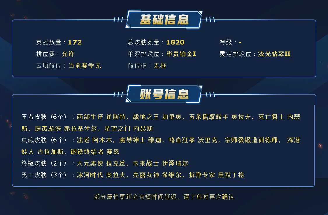 ~~喜欢记得收藏~~1900皮全英雄~~租之前尽量查一下游戏ID,确保段位是您需要的,避免浪费您的时间~~请勿挂机逃跑故意送人头,谢谢合作,谢谢~~