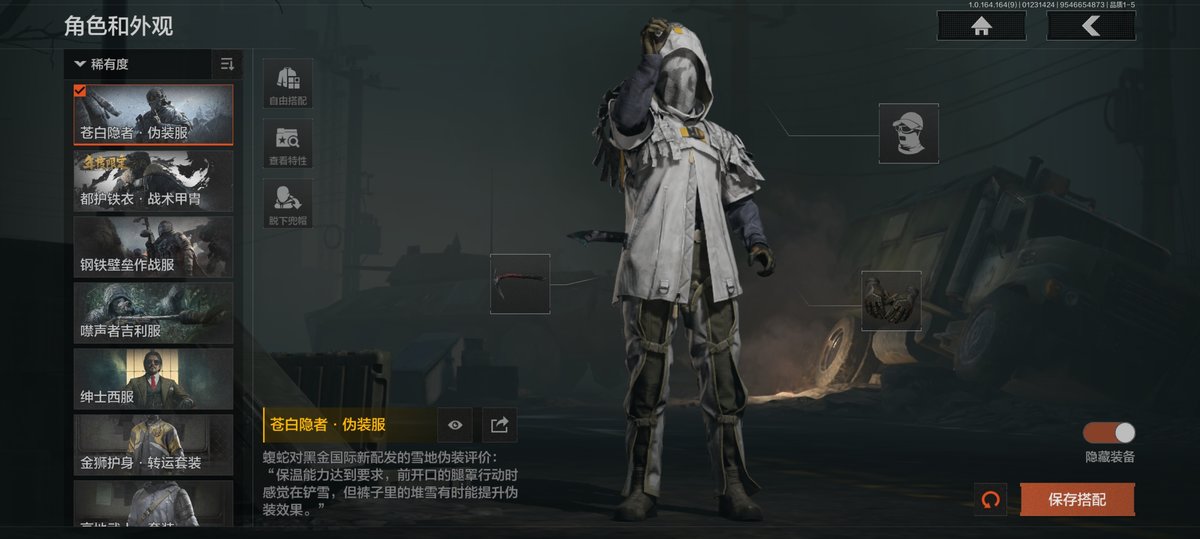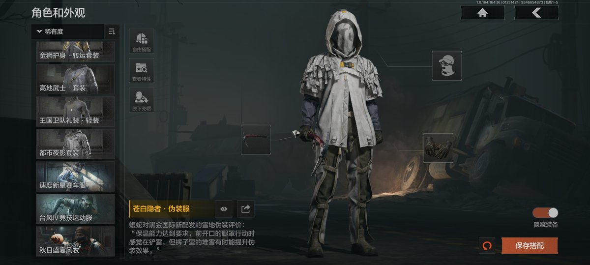 历史最高段位:暗区传说【角色皮肤】:苍白隐者伪装服,都护铁衣战术甲胄,钢铁壁垒作战服,噤声者吉利服,绅士西服,都市夜影套装,台风IV竞技运动服,秋日盛宴风衣;【近战武器】:苍穹利爪,收割者,S-07折刀,赢家匕首,热能武器补牢,三尺万仞战术剑,寒牙手刺,旧日主宰,下弦月,涂鸦利刃,明刀绣春,冬日冰镐,裁决手杖剑,突击匕首,工兵铲,来战开山刀;【手套】:玉鸾挂枝手套,苍白之触,噤声者作战手套,裁决手套;【突击步枪】:伦琴幻影FAL,黄金FAL,战术大师FAL,蓝色咆哮H416,告丧夜曲AUG,告丧夜曲AR57,水果AR57,旗帜AEK,冬夜AK12,和平之手FAL,棱光裂变AKM,缟兵玄墨AKM,来战AKM,历战AKM,骤羽尖啸M4A1,幻域莎绫M4A1,巅峰M4A1,德尔塔小队M4A1,竞技M4A1,鱼跃丹青DTMDR,竞技MDR,自喷网格H416,德尔塔小队H416,棱光裂变AK102,白垩游魂AK102,涂鸦AK102,火力倾泻AUG,火绒草AUG,伦琴计量AK74N,雪原凌锋AK74N,来战AK74N,山地伪装AK74N,骑士之剑AKS74U,赢家F2000,钢铁真理F2000,雪山之王F2000,炎夏浪花AR57,涂绘猎人AR57,棱光裂变ACE31,湖冰倒影ACE31,白垩游魂ACE31,粉绒臻选AN94,壁垒AN94,阴影AN94,饰金Groza,伦琴计量T951,武侍FAMAS,伦琴计量SCAR,利齿风暴T03,缟兵玄墨T03,玄戈梨花T03,林地数码T03,鱼跃丹青MCX,07式林地迷彩QBZ191;【冲锋枪】:利齿风暴MPX,饰金MP5,湖冰倒影MP5,无声暗月MP5,掌中盾MP5,龙威MP5,骤羽尖啸MPX,玄戈梨花MPX,雪山之王MPX,高塔之内P90,灰鼠幻歌P90,禁止访问UMP45,利齿风暴T79,伦琴计量Vector45,神锋Vector45,鱼跃丹青T85,超越自我Vector9;【射手步枪】:旧王圣谕VSS,冰河碎影MK14,棱光裂变QBU191,高塔之内VSS,缟兵玄墨VSS,玄戈梨花VSS,白狼连队VSS,战术大师SVDS,雪原凌锋SVDS,典礼武备MK14,骑士之剑MK14,鱼跃丹青M110,竞技M110,缟兵玄墨M110,玄戈梨花M110,鱼跃丹青QBU191;【栓动步枪】:长缨风掣AX50,白色丧钟莫辛,白垩游魂莫辛,噤声者莫辛,无声暗月AX50,超越自我AR30,骑士之剑SJ16,护命金翎M24;【轻机枪】:长缨风掣RPK16,战术大师RPK16;【卡宾枪】:敬伙伴M16;【手枪】:赢家G18C,涂鸦G18C,秩序G18C