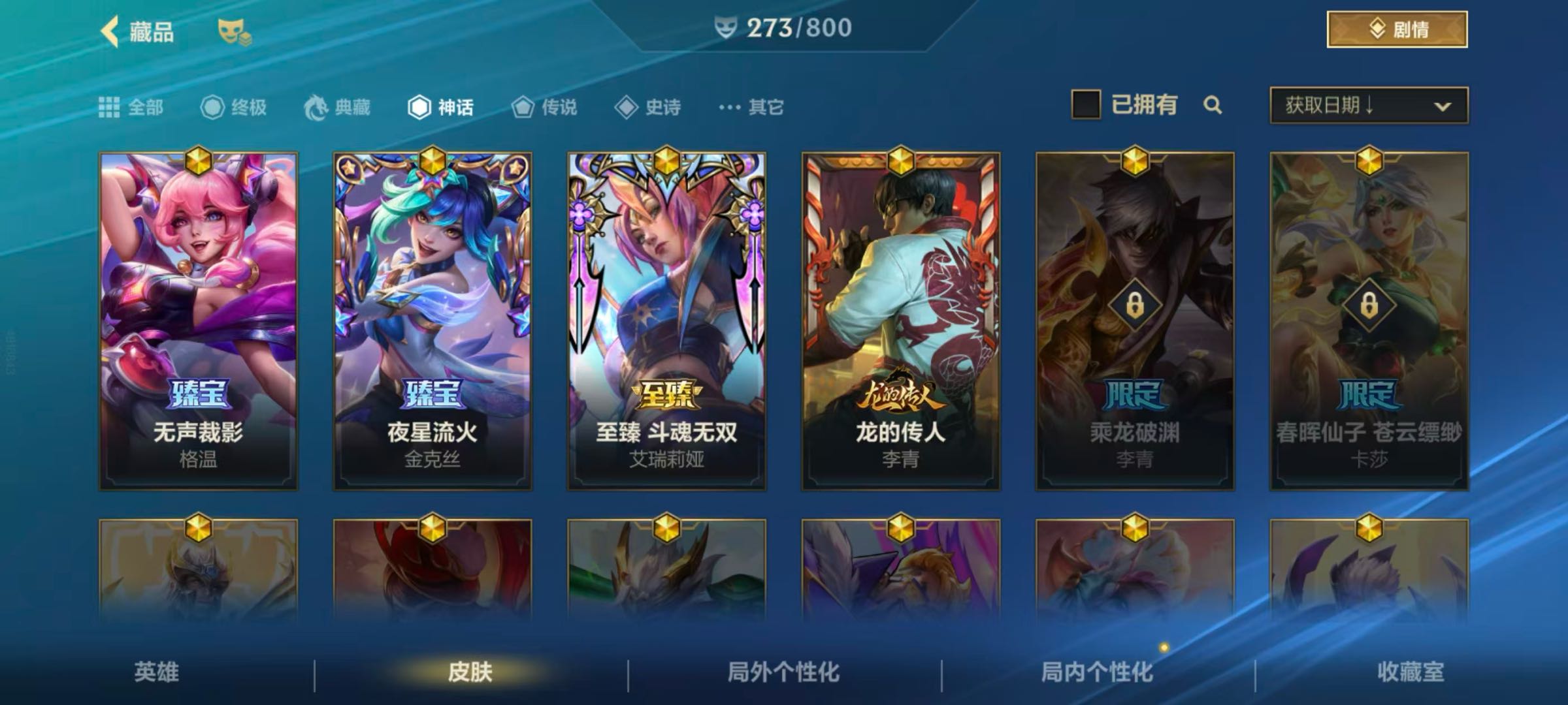 【安卓】 编号24/可排位4神话273皮/至臻斗魂无双刀妹/龙虾/臻宝夜星流火➕无声裁影/黎明传说套星守套!