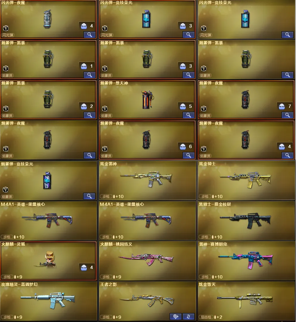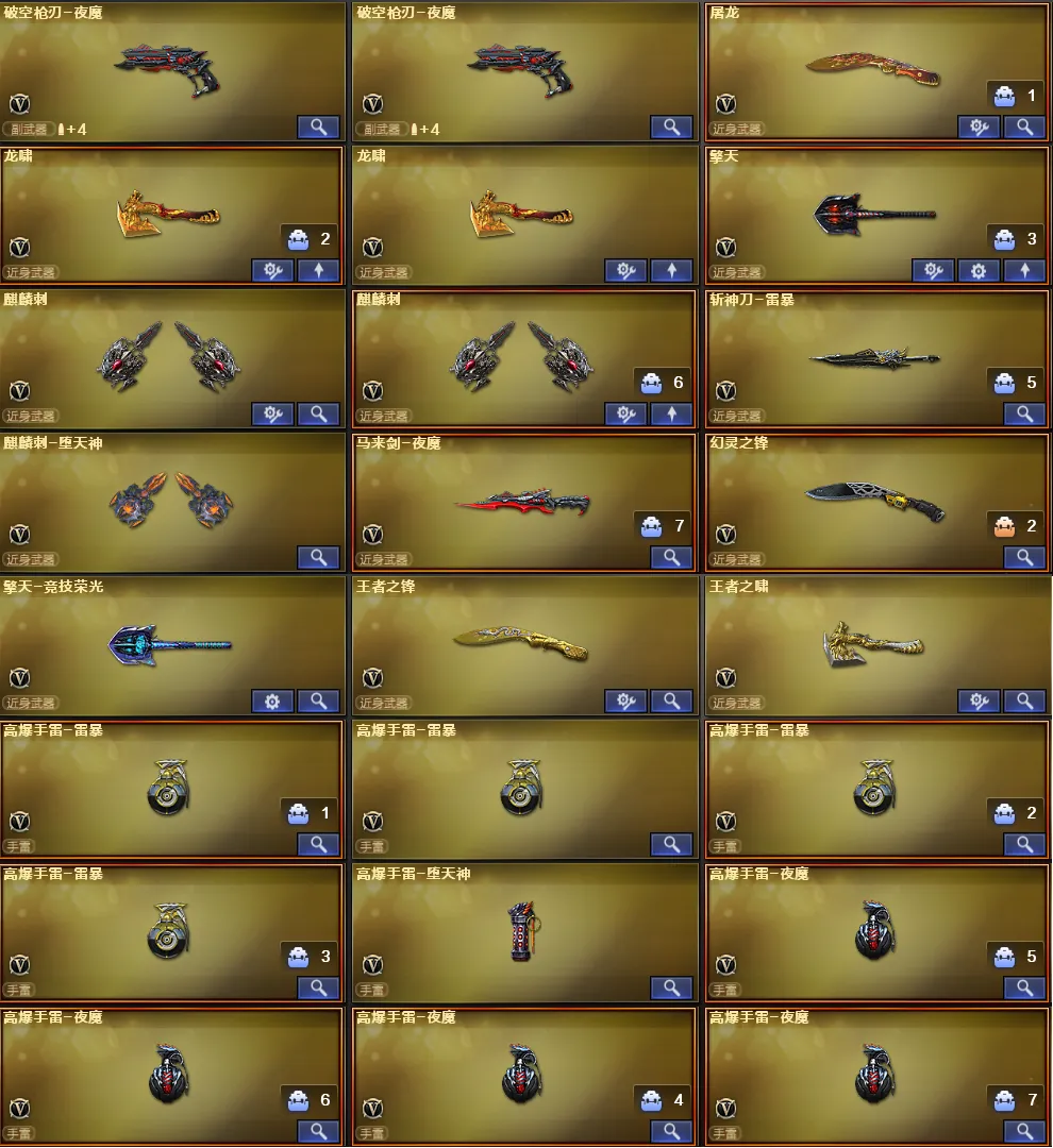 投掷套装:雷暴套X4、堕天神套、夜魔套X4、竞技荣光套、双生雷恶棍、音乐手雷