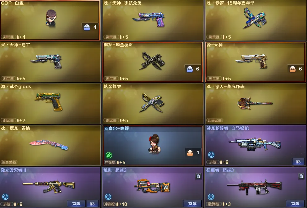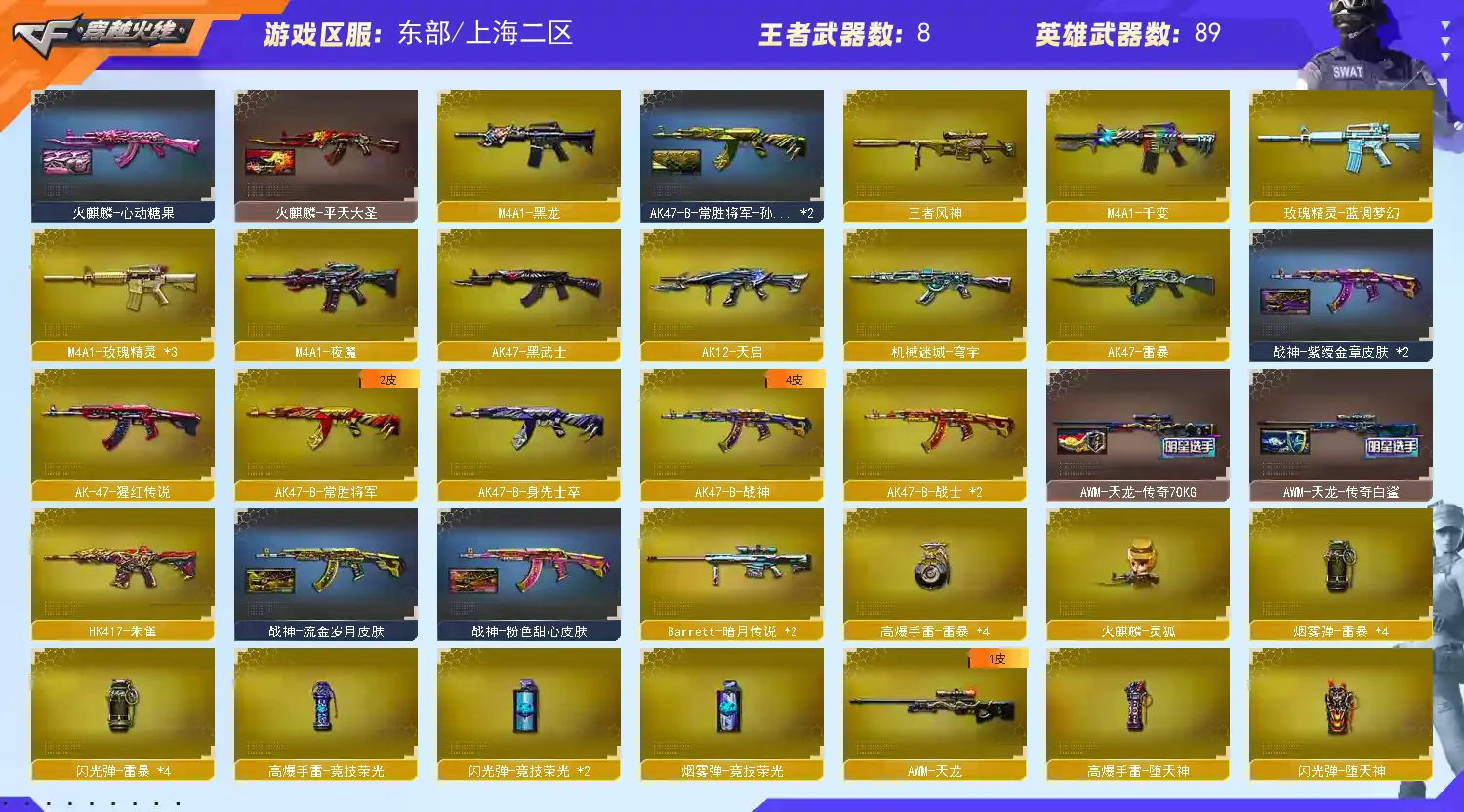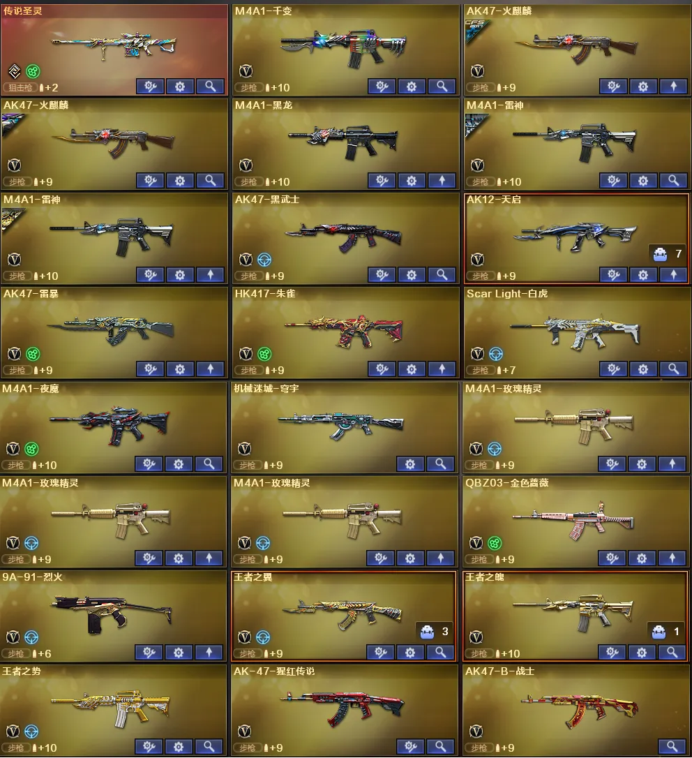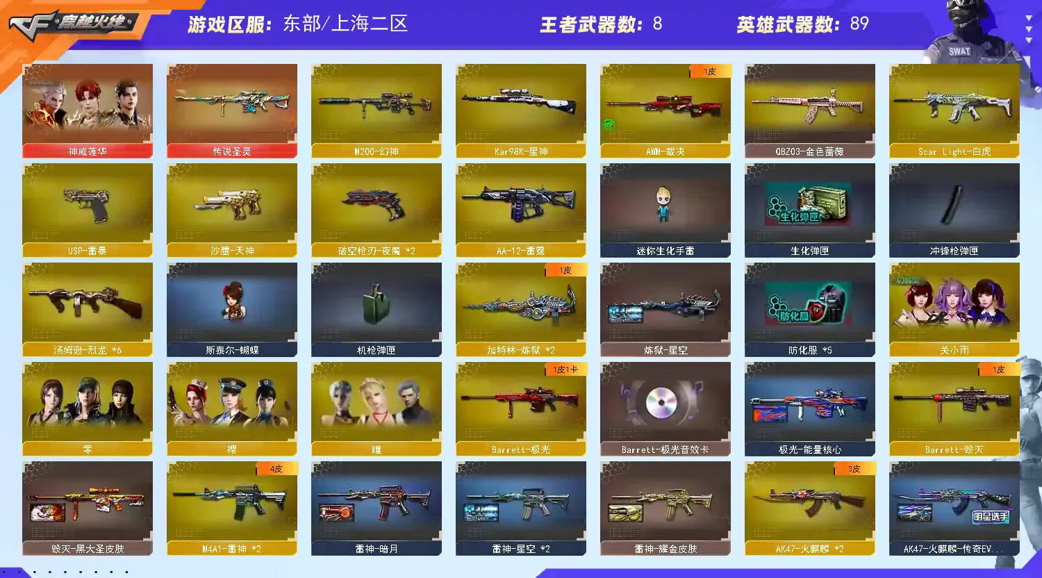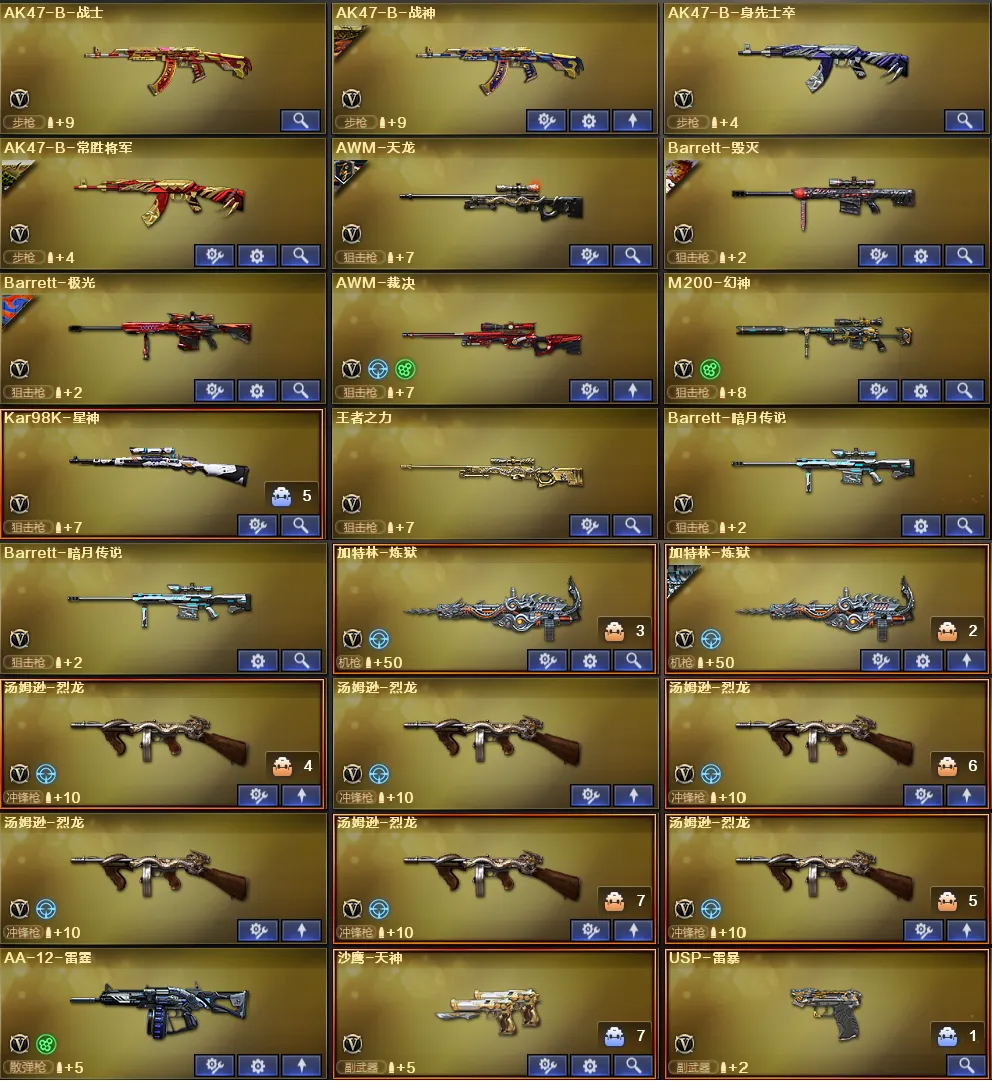 稀有武器:传说圣灵、M200幻神、98K星神、烈龙X6+斯泰尔蝴蝶、SCarlight白虎、HK朱雀、QBZ金色蔷薇、雷暴、夜魔、千变、火麒麟X2(心动糖果皮肤、平天大圣皮肤、传奇EVEN皮肤、AG战队皮肤、CFstar皮肤)、黑龙、雷神X2(星空皮肤、暗月皮肤、耀金皮肤)、黑武士、天启、机械迷城穹宇、玫瑰精灵X3、烈火、天龙(传奇70KG皮肤、传奇白鲨皮肤)、毁灭(黑大圣皮肤)、极光(极光音效卡、能量核心皮肤)、裁决、暗月传说X2、炼狱X2(星空皮肤)、A12雷霆、天神、USP雷暴、破空枪刃夜魔X2、屠龙、龙啸X2、擎天、麒麟刺X2、斩神刀雷暴、麒麟刺堕天神、马来剑夜魔、幻灵之锋、擎天竞技荣光、冰龙粉碎者白马银枪、激光毁灭者、乱世超越、征服者超越