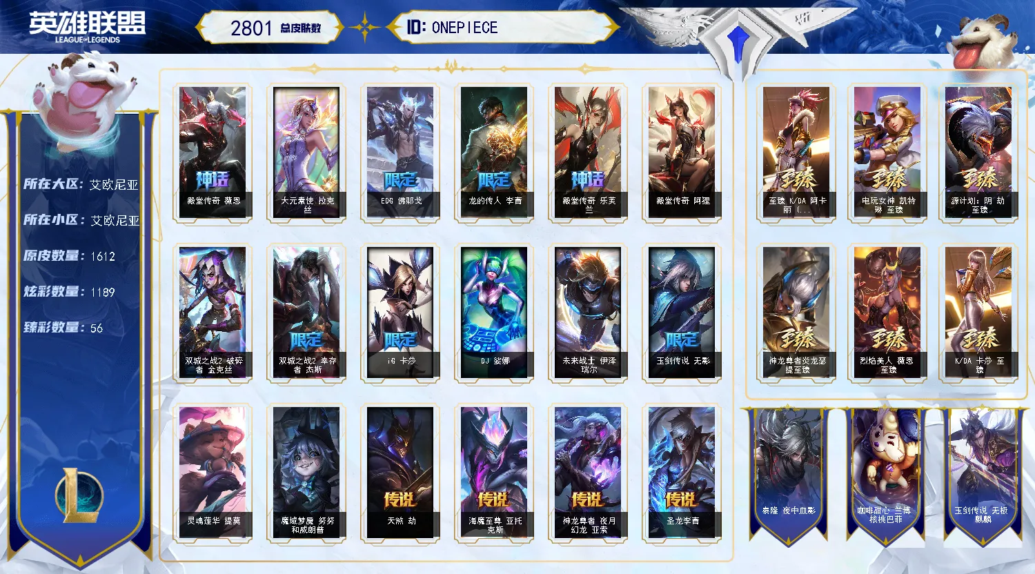 艾欧尼亚2700皮丨1609原皮丨1140炫彩丨圣堂金克斯丨328限定丨57神话丨56臻彩