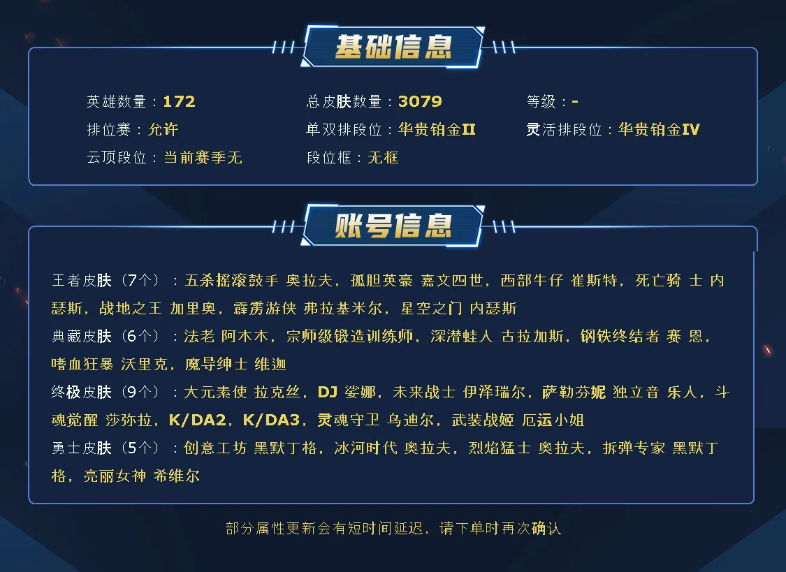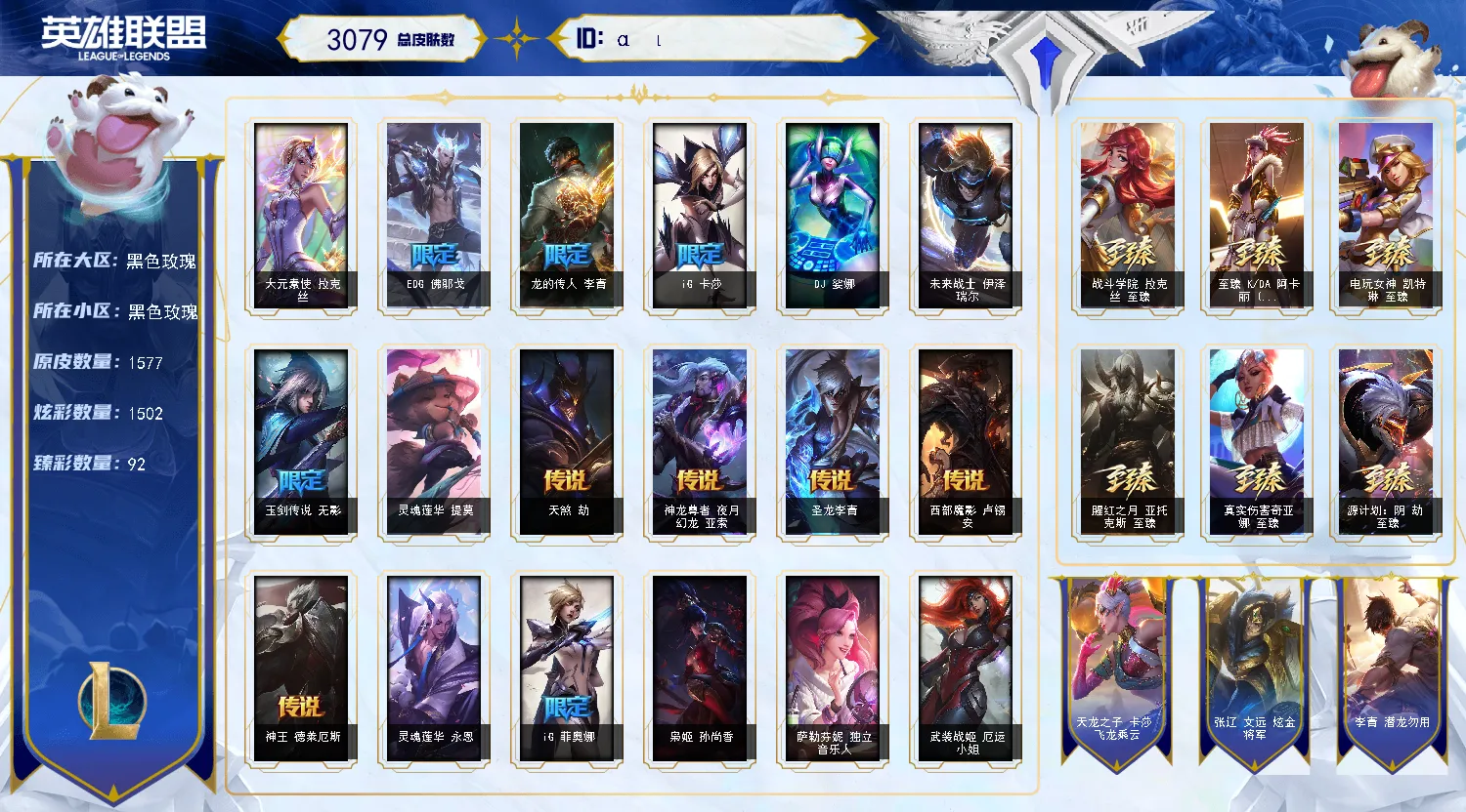 黑色精选号,3000皮、1569原皮、1488炫彩,8色龙瞎。海量限定皮肤,基本全英雄都有大量皮肤,