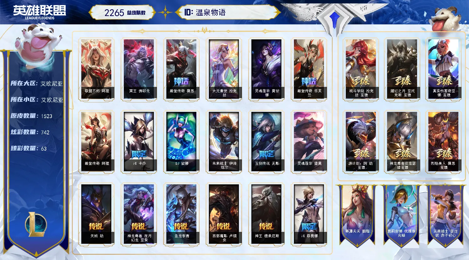 艾欧尼亚精选1500皮账号,圣堂佛耶戈、莫甘娜。三挡阿狸,281张限定皮。
