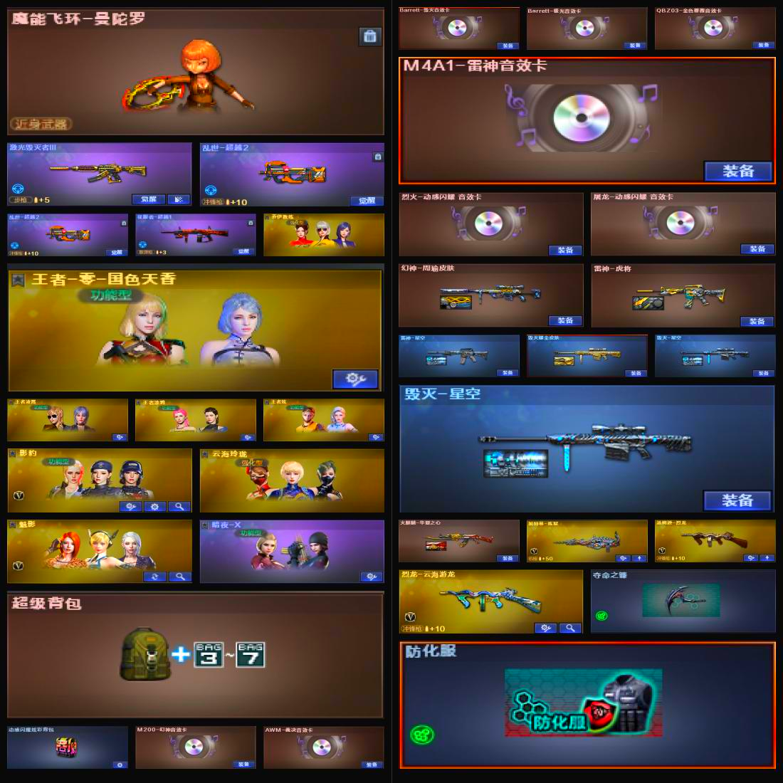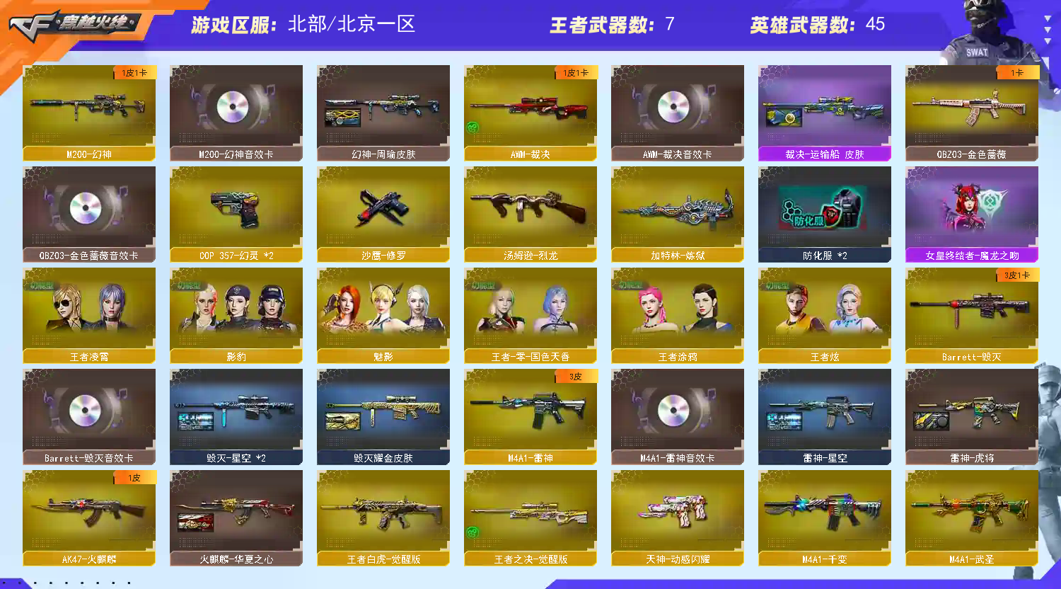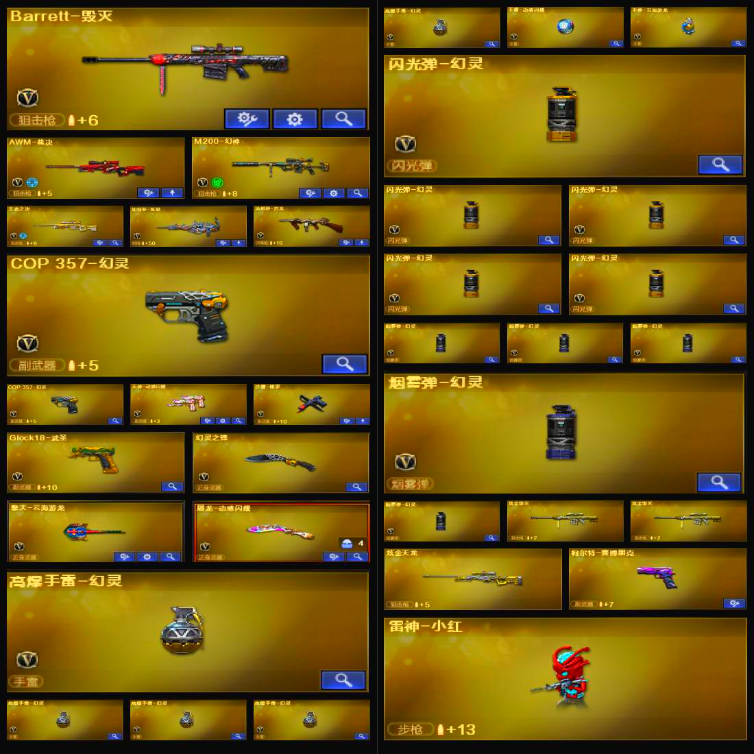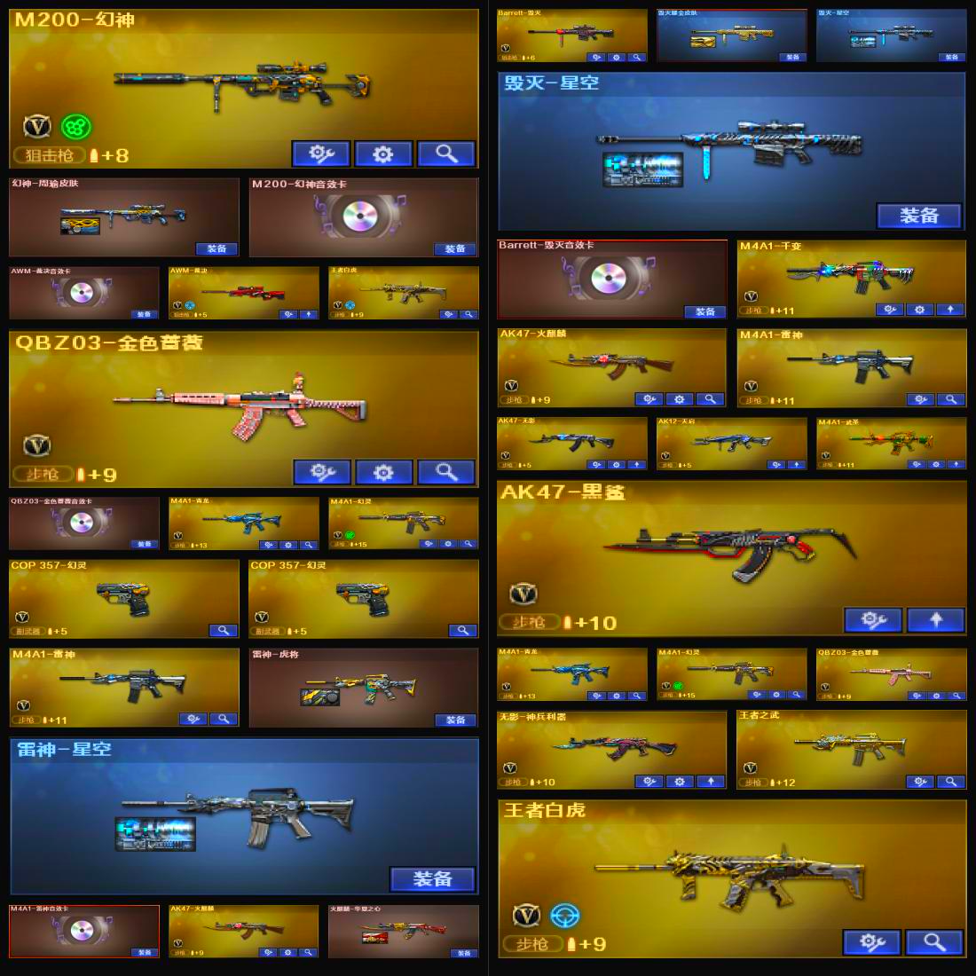 【亮点解析 幻神三件套 裁决三件套 】【m200幻神+音效卡+周瑜 】【王者白虎】【qbz金色蔷薇+卡】【火麒麟】【雷神+卡】【毁灭+卡】【裁决+卡+运输船 】【武器:青龙 幻灵 武圣 王者之武 炼狱 烈龙*2】【5手枪:修罗 武圣 幻灵*2 天神】【3刀具:幻灵之峰 擎天 】【雷套:幻灵雷*5】【小人枪:雷神小红 天龙乔伊教练】【音效卡:毁灭音效卡 幻神音效卡 金色蔷薇音效卡 雷神音效卡 极光音效卡 裁决音效卡】【四防角色:影豹 王者零国色天香 王者炫 】