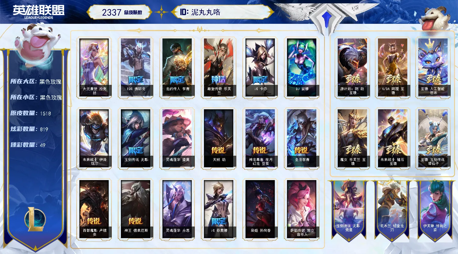 黑色1500原皮号,800张炫彩,318张限定。拥有稀有限定:冰原酒桶、斩星魔剑JS、莲花之令卡尔玛、哥特安妮、机械迷城加里奥、冬季仙境发条、龙瞎龙刀龙猴龙琴龙嘴、花木兰、藏龙卧虎贾克斯、勇敢的心诺手等