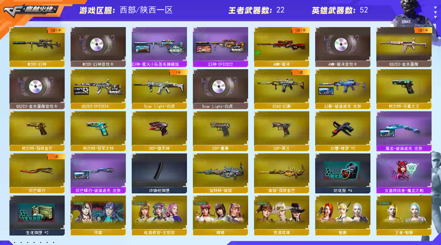 幻神-幻神星火-幻神cfs2022-幻神音效卡-白虎-幻影-qbz金色蔷薇-王者白虎-毁灭-裁决-竞技荣光-炼狱-修罗-usp雷暴-cop堕天神-usp冥王-冥王-冠军之特-屠龙-擎天-炽芒蝶刃-云悠悠-荒漠琉璃-雨棠-晴雅-黑骑士音效卡-裁决音效卡-毁灭音效卡-qbz音效卡-白虎音效卡-雷神heartshot-qbzcfs2024-雷神十周年-毁灭绿豆-冠军之势-荣耀之魄