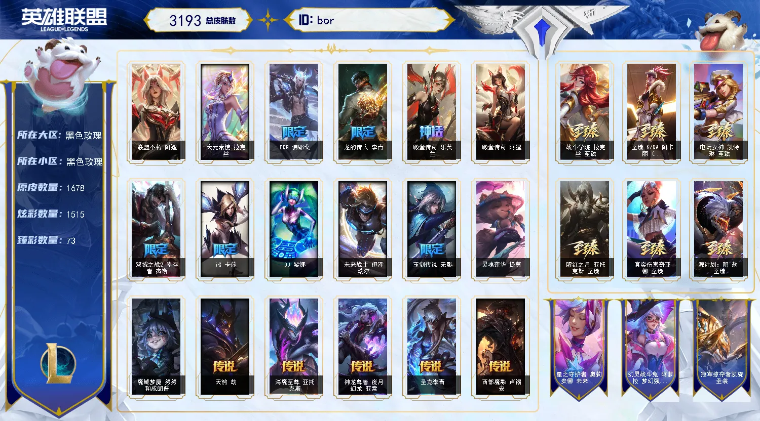 黑色3100皮畅玩号,三挡阿狸。1671原皮,1514张炫彩,326张限定,72臻彩。