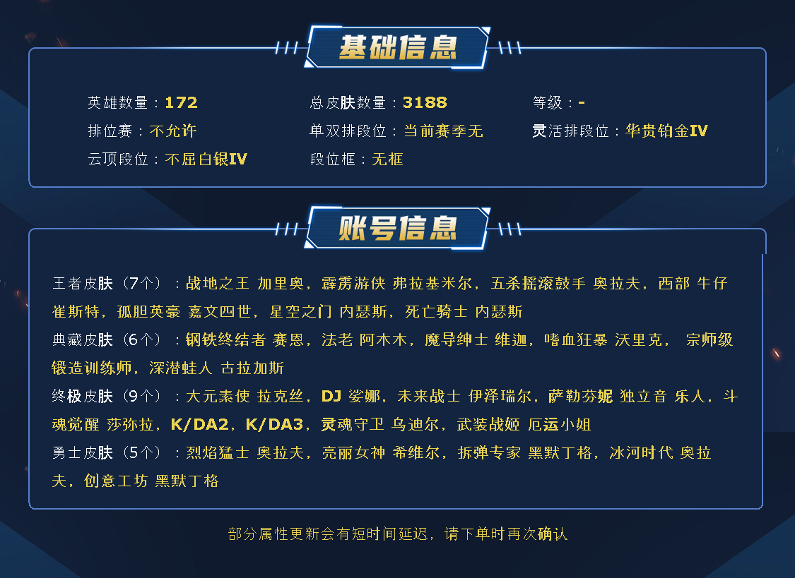 黑色玫瑰3100皮丨1671原皮丨不朽阿狸丨1514炫彩丨326限定丨131神话丨72臻彩