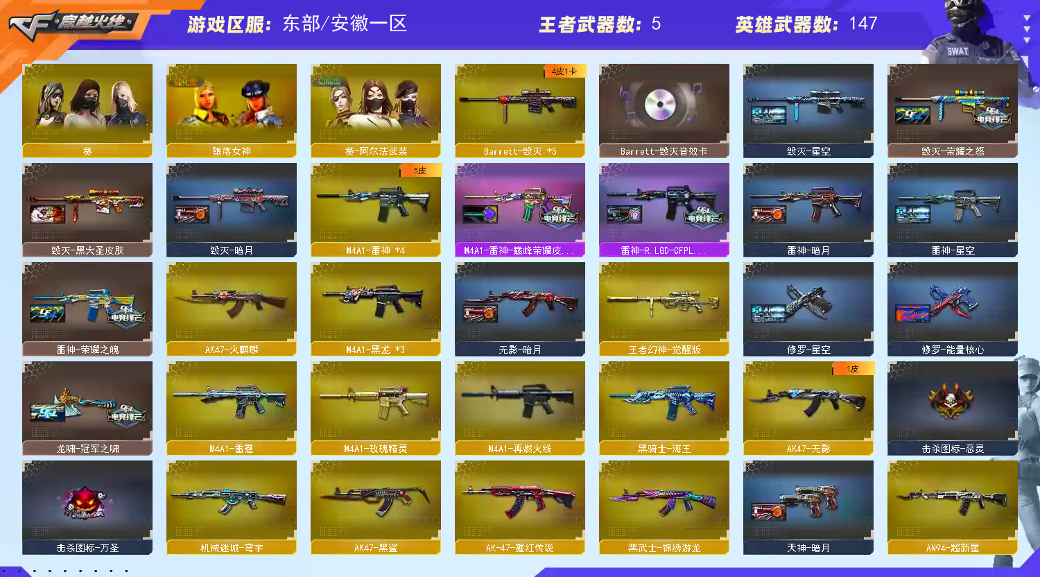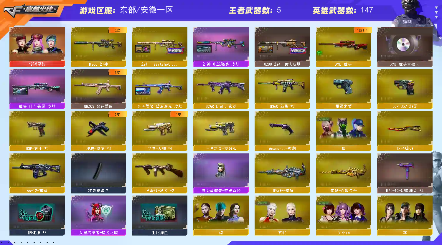 传说星骇✨幻神3皮✨G36C幻影✨炽芒蝶刃✨USP冥王2✨隼✨裁决三件套✨COPx2✨量子套✨影豹套