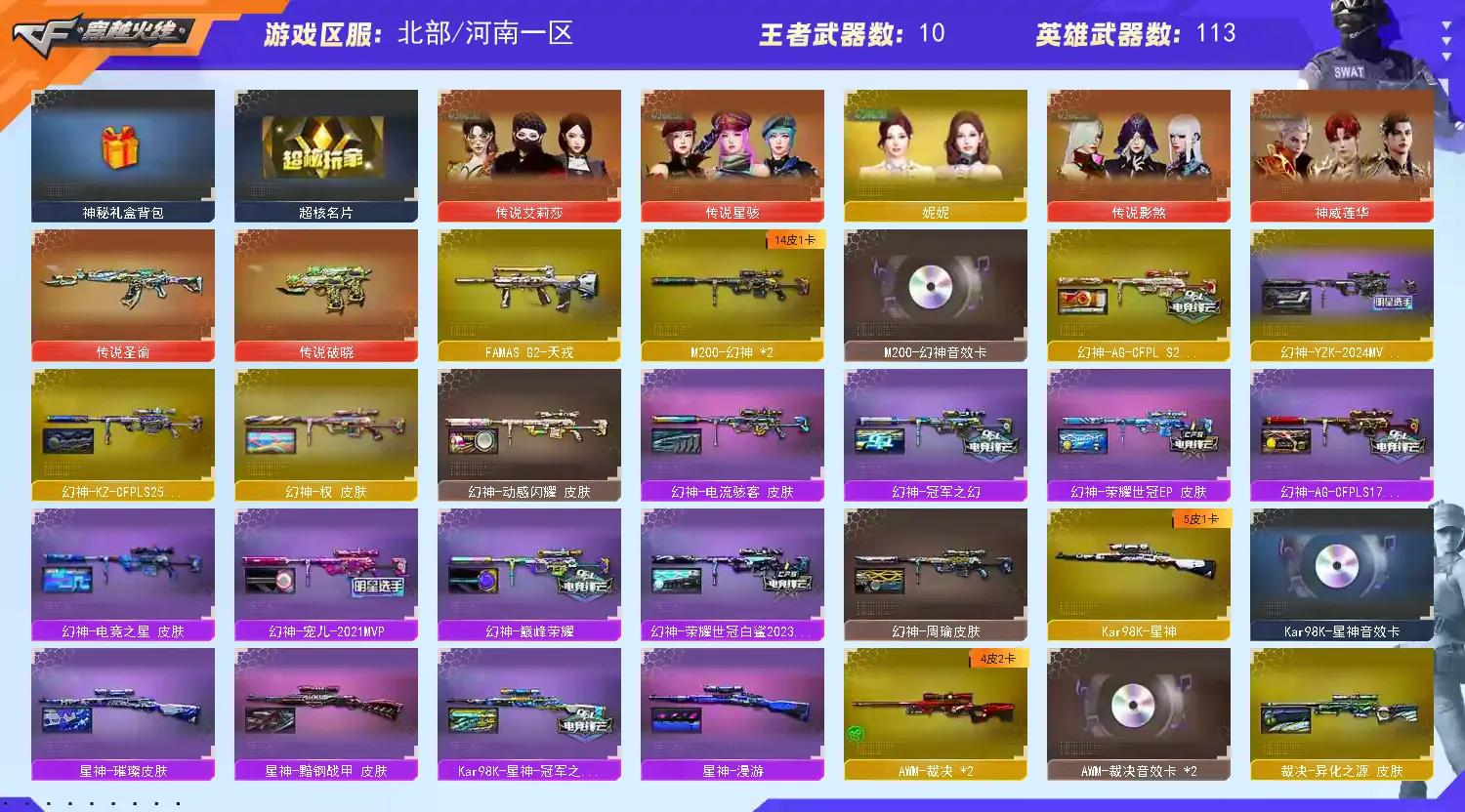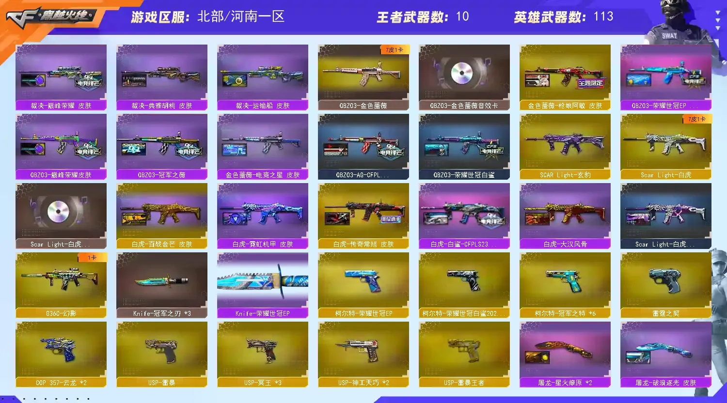【重要武器皮肤】幻神-电竞之星 皮肤/幻神-荣耀世冠EP 皮肤/幻神-电流骇客 皮肤/幻神-动感闪耀 皮肤/幻神-AG-CFPL S24冠军 皮肤/幻神-荣耀世冠白鲨2023 皮肤/幻神-AG-CFPLS17冠军/星神-黯钢战甲 皮肤/Kar98K-星神-冠军之星皮肤/星神-漫游/星神-璀璨皮肤/毁灭-定军扬威 皮肤/毁灭-星空/毁灭-枪娘巴雷特/毁灭-荣耀之怒/毁灭-黑大圣皮肤/巴雷特SV皮肤/AWM-天龙-传奇白鲨/天龙-CFSTAR/裁决-运输船 皮肤/裁决-典雅胡桃 皮肤/裁决-异化之源 皮肤/裁决-巅峰荣耀 皮肤/火麒麟-CFSTAR/火麒麟-华夏之心/火麒麟-枪娘凯特琳/火麒麟-轻羽皮肤/火麒麟-冠军之心/AK47-黑武士-361/雷神-R.LGD-CFPLS18冠军/M4A1-雷神-白鲨皮肤/雷神-荣耀之魄/雷神-虎将/雷神-耀金皮肤/雷神-维纳斯皮肤/黑骑士-典雅胡桃 皮肤/黑骑士-AG-S4冠军典藏/八面凌龙-星守炎龙 皮肤/金色蔷薇-电竞之星 皮肤/金色蔷薇-枪娘阿敏 皮肤/白虎-百战金芒 皮肤/白虎-白鲨-CFPLS23冠军/Scar Light-白虎-暗星/白虎-大汉风骨/白虎-霓虹机甲 皮肤/QBZ03-荣耀世冠EP 皮肤/QBZ03-AG-CFPLS19冠军/QBZ03-荣耀世冠白鲨/QBZ03-冠军之薇/烈龙-星空/炼狱-电子连击皮肤/炼狱-月 皮肤/修罗-CFSTAR/麒麟刺-甜蜜糖果 皮肤/屠龙-巅峰荣耀 皮肤/屠龙-星火燎原/擎天-秘银/龙啸-黯钢战甲 皮肤/炽芒蝶刃-巅峰荣耀 皮肤/炽芒蝶刃-荣耀世冠白鲨2023 皮肤