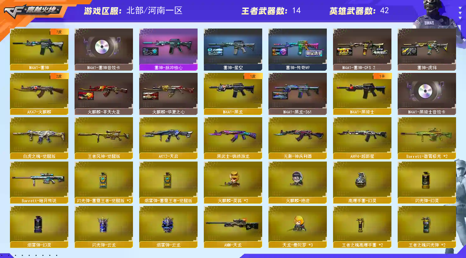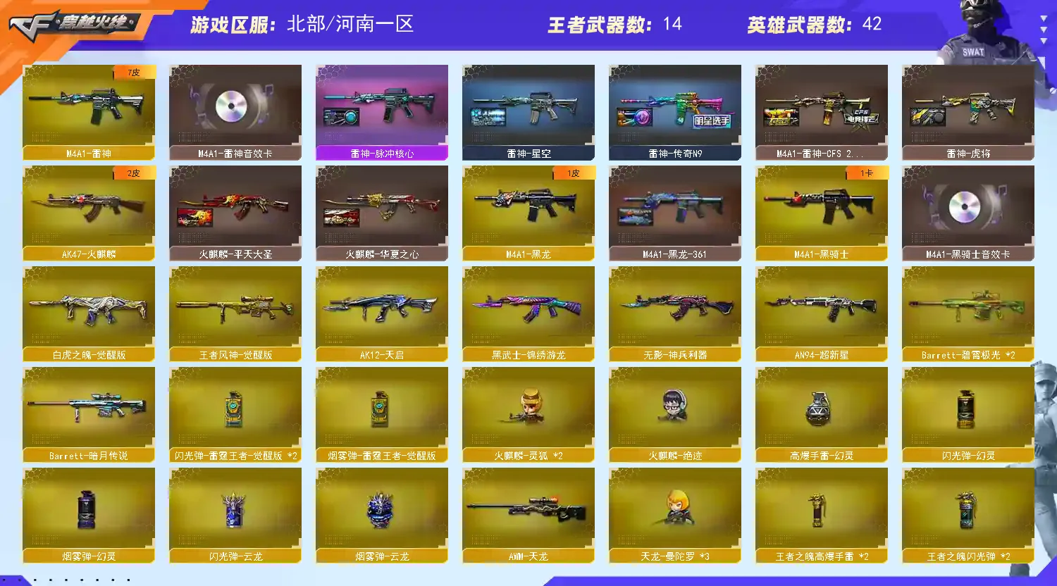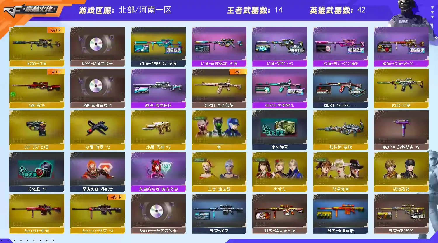 【M200-幻神+音效卡+幻神-传奇欧欧+幻神-宠儿+幻神-冠军之幻+幻神电流骇客+幻神-N9】【王者风神】【G36C-幻影】【白虎之魄】【QBZ03-金色蔷薇】【Barrett-毁灭】【裁决+音效卡+裁决-流光秘银】【极光】【AK47-火麒麟】【黑龙】【M4A1-雷神+音效卡+雷神-传奇n9】【黑骑士+音效卡】【天启 超新星】【6手枪 修罗*2 天神*2 cop幻灵】【11近战 屠龙 龙啸 麒麟刺*2 云龙扇 王者之锋*2】【手雷 幻灵雷 雷霆王者】【角色 荒漠琉璃 岚兮儿 云海玲珑】【幻神音效卡 裁决音效卡 Barrett-毁灭音效卡】