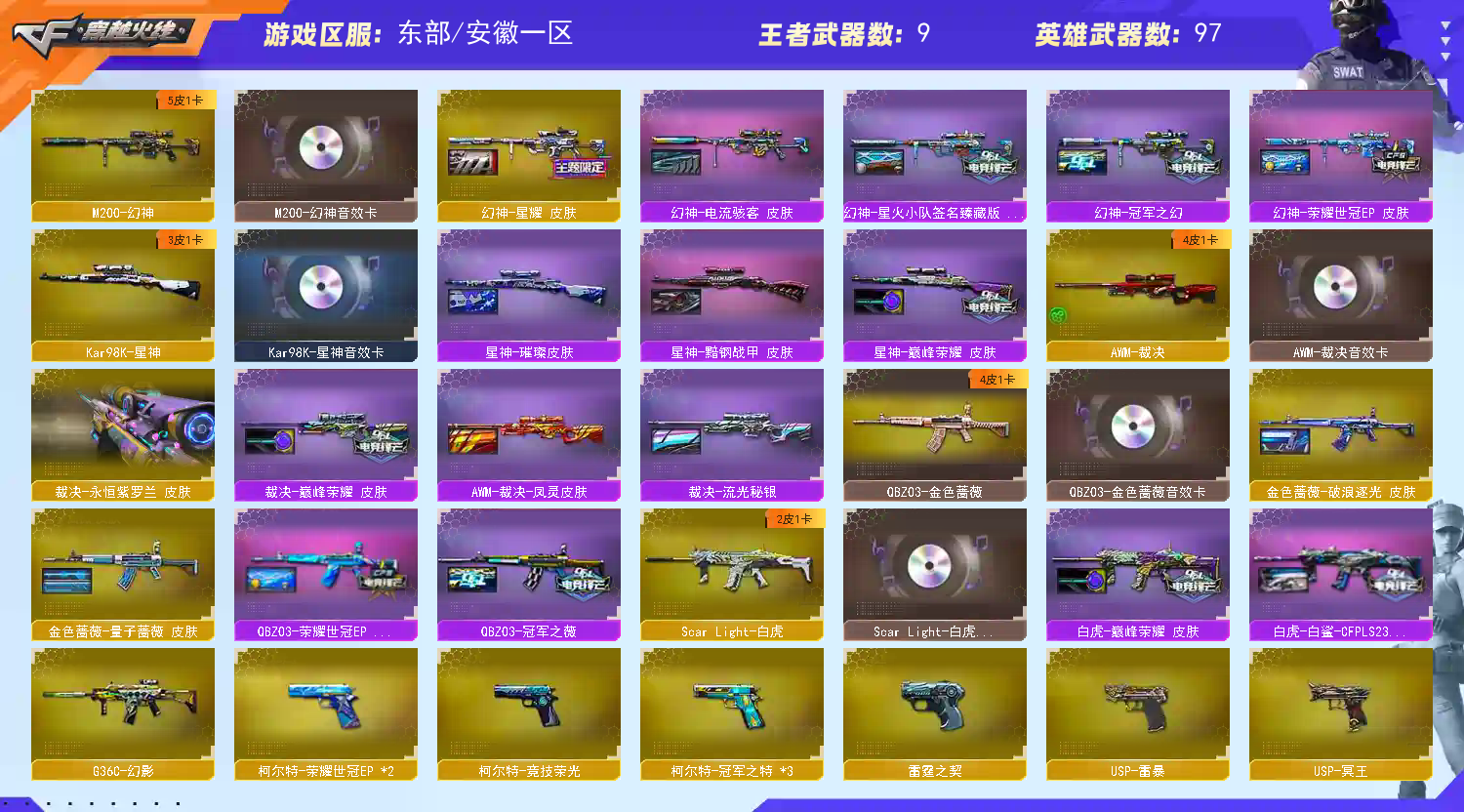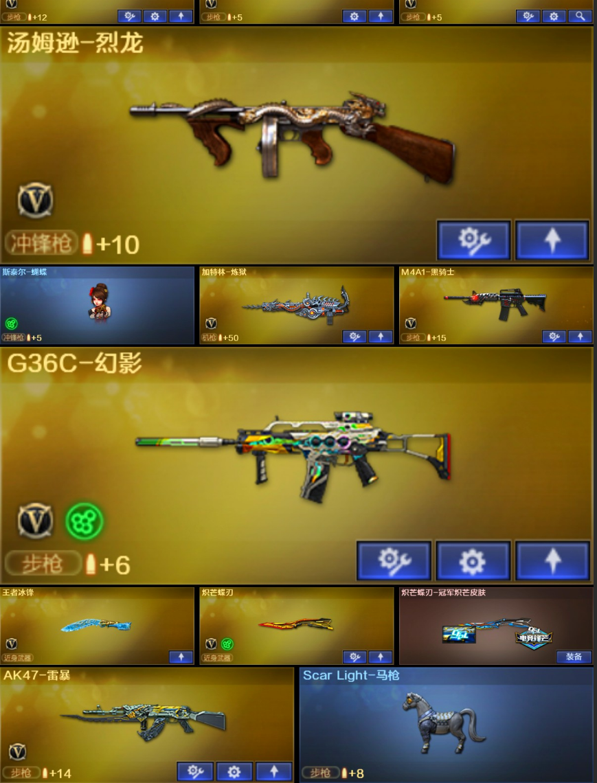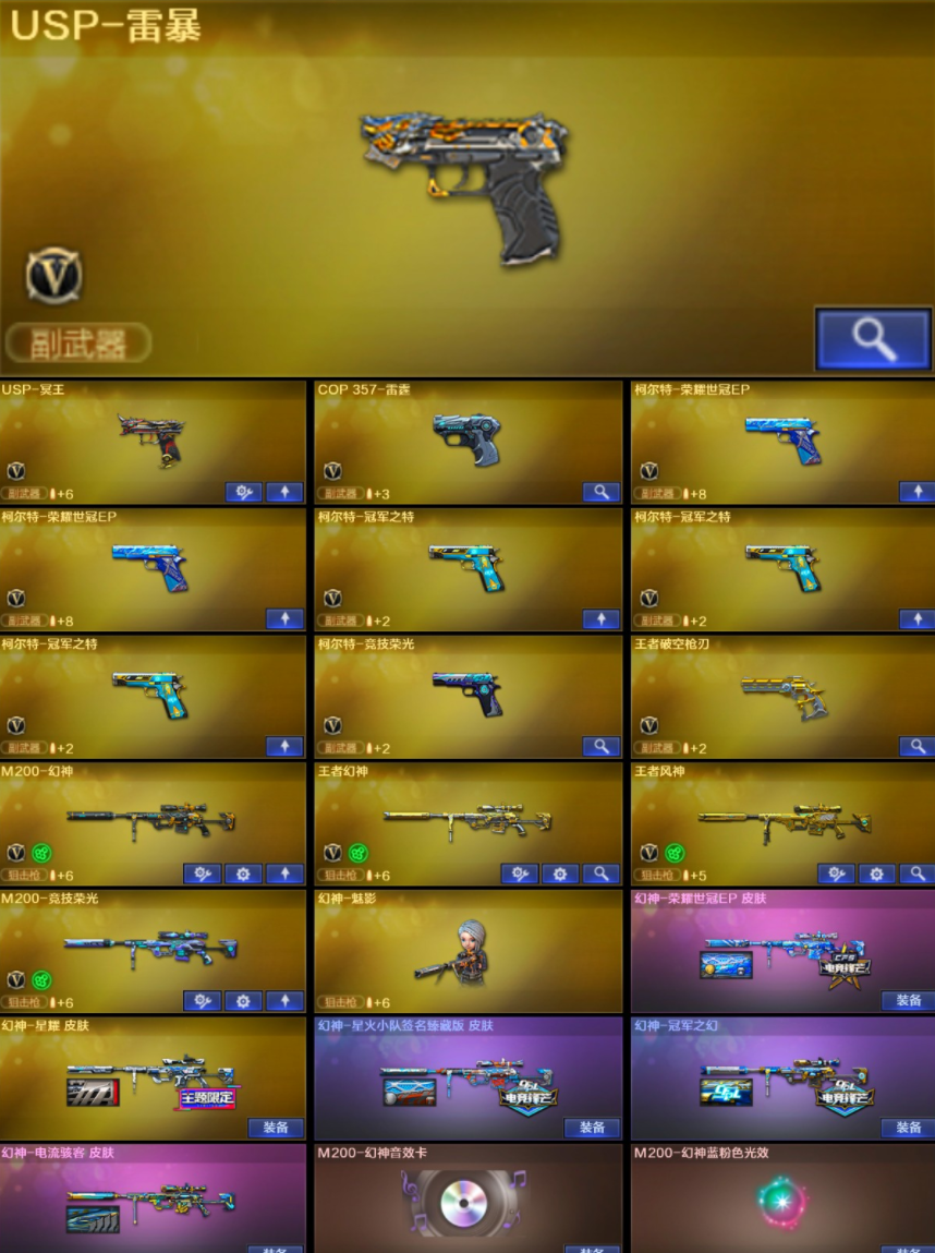 【稀有武器】:M200-幻神/Kar98K-星神/G36C-幻影/ScarLight-白虎/AK47-雷暴/雷霆之契/USP-雷暴/柯尔特-竞技荣光/天神-动感闪耀/柯尔特-冠军之特(3)/王者破空枪刃/QBZ03-金色蔷薇/AK47-火麒麟/M4A1-黑龙/M4A1-雷神/M4A1-黑骑士/AK47-无影/荣耀世冠-火麒麟/白虎-电玩蓝兔/Barrett-毁灭/AWM-裁决/M200-竞技荣光/加特林-炼狱/汤姆逊-烈龙/AA-12-雷霆/炽芒蝶刃/斩神刀-雷暴/马来剑-夜魔/擎天-竞技荣光