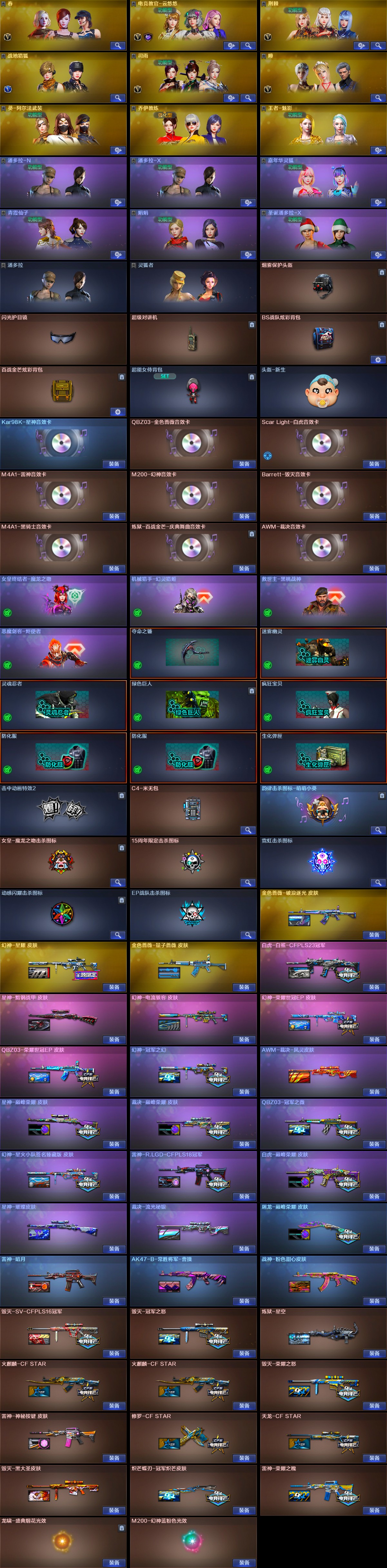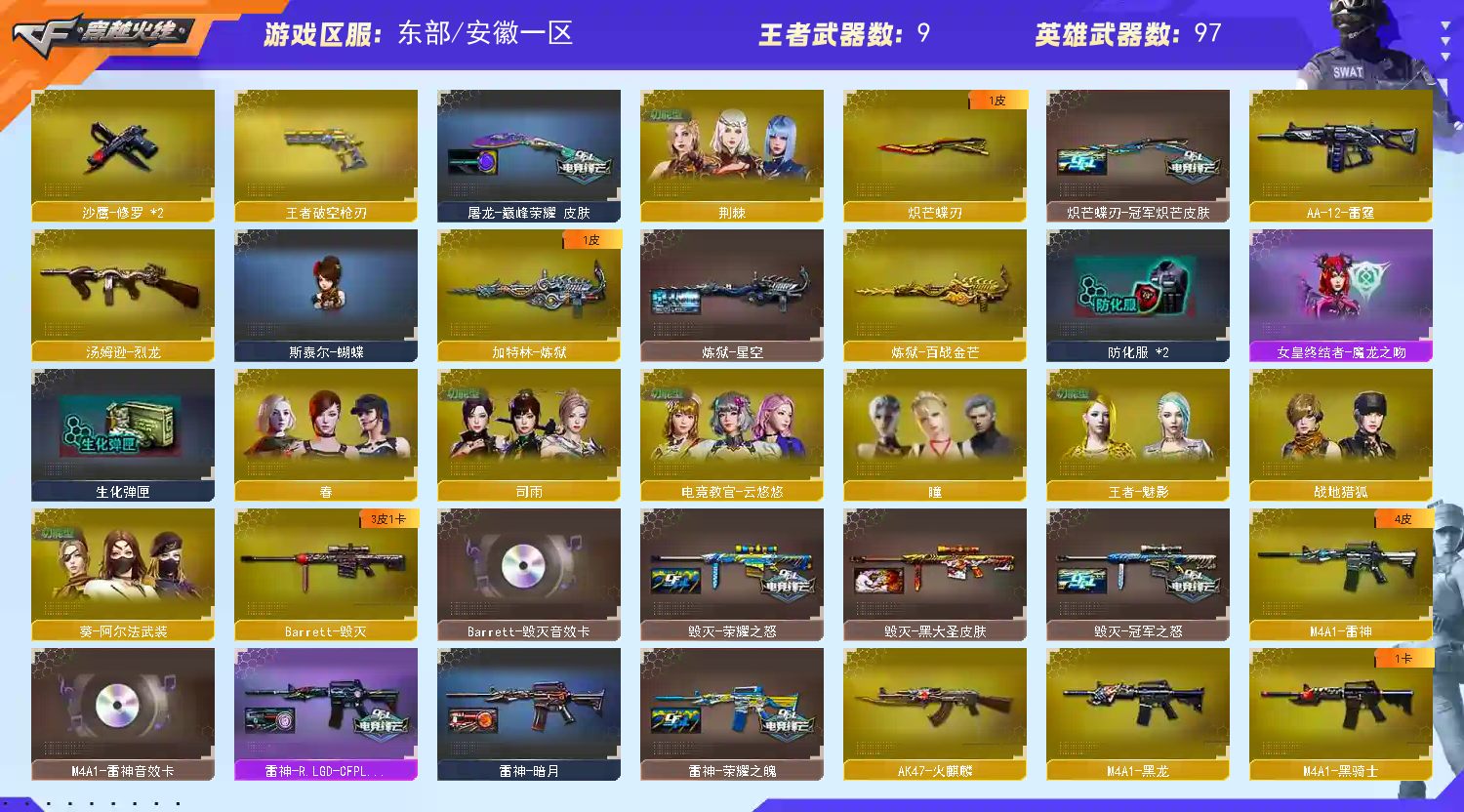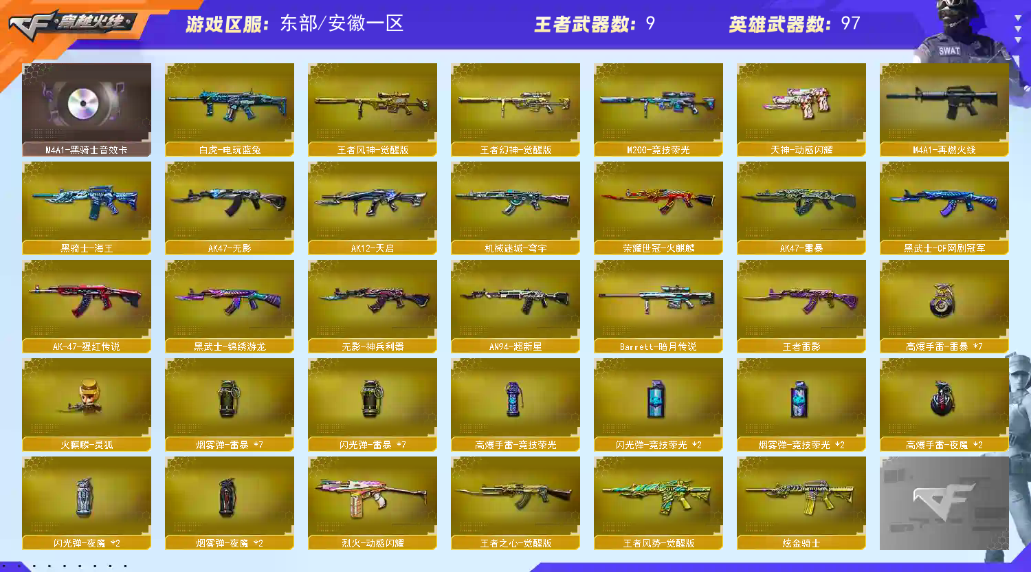 【稀有武器】:M200-幻神/Kar98K-星神/G36C-幻影/ScarLight-白虎/AK47-雷暴/雷霆之契/USP-雷暴/柯尔特-竞技荣光/天神-动感闪耀/柯尔特-冠军之特(3)/王者破空枪刃/QBZ03-金色蔷薇/AK47-火麒麟/M4A1-黑龙/M4A1-雷神/M4A1-黑骑士/AK47-无影/荣耀世冠-火麒麟/白虎-电玩蓝兔/Barrett-毁灭/AWM-裁决/M200-竞技荣光/加特林-炼狱/汤姆逊-烈龙/AA-12-雷霆/炽芒蝶刃/斩神刀-雷暴/马来剑-夜魔/擎天-竞技荣光