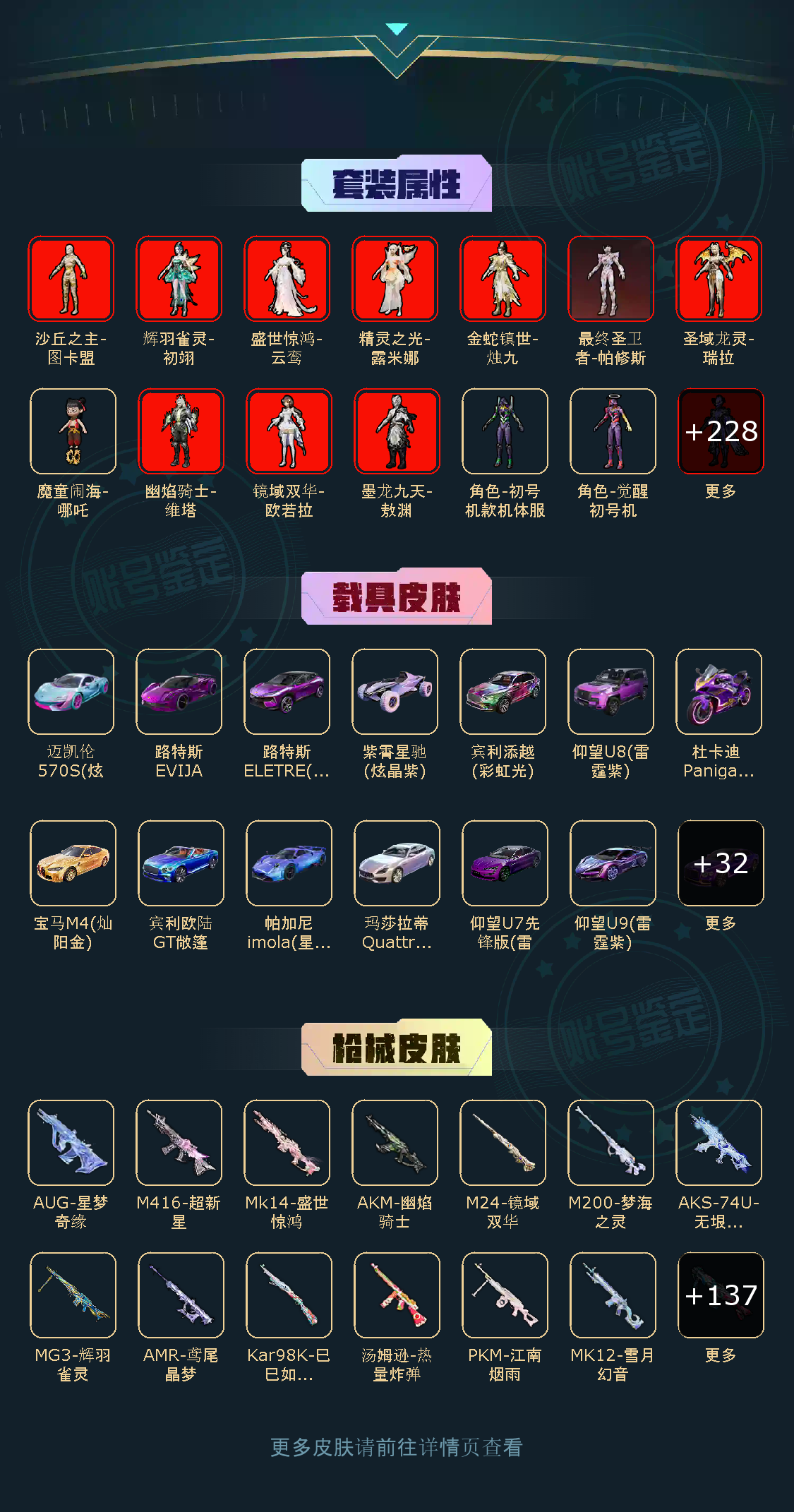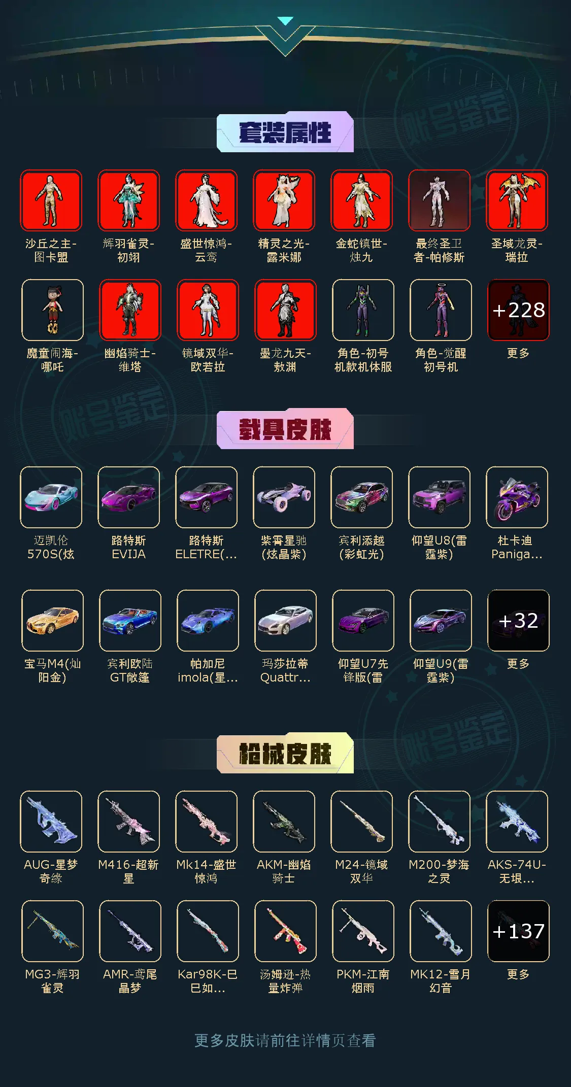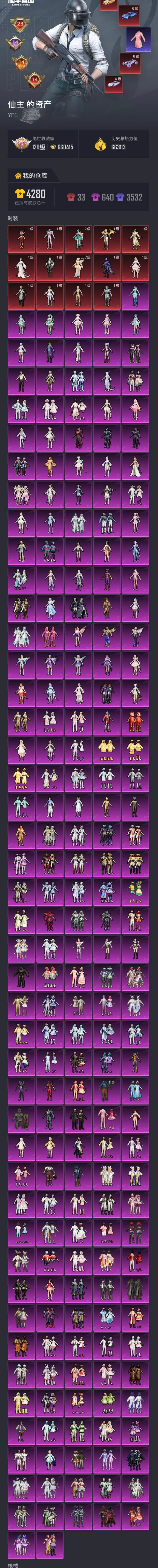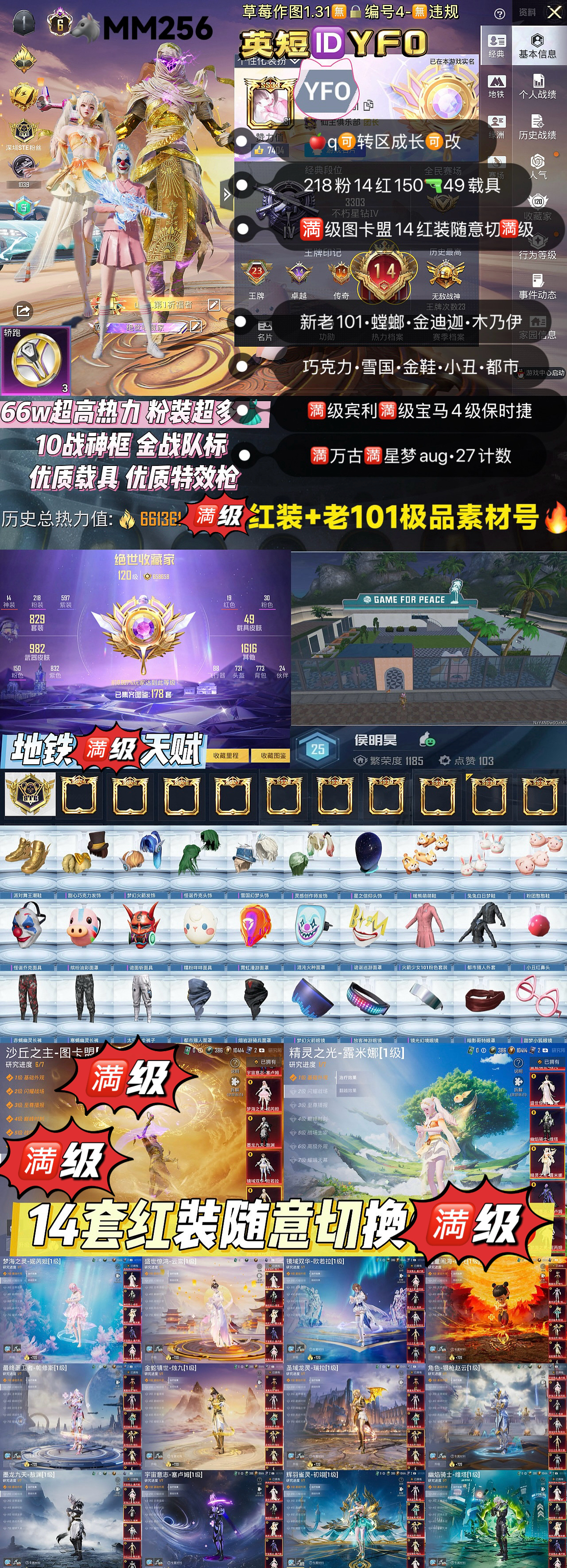 荣耀皇冠Ⅰ232粉,46载具,832套装,24王牌印记,无敌战神历史最高段,672542热力值 平底锅-喜羊羊与灰太狼/平底锅-仲夏莫吉托/平底锅-林间仙鹿/平底锅-桃粉嫣然/撬棍-永恒法杖/镰刀-幽影之判/Famas-初号机 觉醒Ver./AKM-盖世英雄/AKM-甜心宝贝/SCAR-L-梦幻火箭/蜜獾-荧海星豚/SCAR-L-童趣迷兔/AUG-星梦奇缘/AKM-绿萝繁花/M416-电玩时刻/AUG-星之彼岸/SCAR-L-甜梦小狐/M762-甜心娃娃/M416-全功率超战/M762-电糖天使/GROZA-旋转彩虹/AUG-甜心首席/GROZA-巴啦啦小魔仙/SCAR-L-桃夭倾城/GROZA-香水柠檬/M416-暖熊萌萌/AKM-幽焰骑士/M762-鬼刀/Famas-觉醒初号机/M416-心之恋语/SCAR-L-纯梦嫁纱/GROZA-超新星/M416-女娲灵识/AKM-魔法神域/M16A4-垂柳戏鸭/AKM-白勺歌姬/GROZA-精灵之光/M762-青锋波束/AUG-暖羊咩咩/M416-墨龙九天/SCAR-L-彩装战姬/GROZA-焦糖拿铁/SCAR-L-锦绣绵绵/AKM-幻海仙踪/AKM-百合蜜语/AUG-许七安/M416-至情至圣/SCAR-L-时空协奏/SCAR-L-金蛇镇世/AKM-星际浪客/GROZA-镜光银凌/AUG-妙趣可丽/M762-甜蜜誓约/AUG-超新星/M416-超新星/SCAR-L-万古烈焰/蜜獾-辉耀战甲/M16A4-晶梦幻蝶/AKM-梦之光华/SCAR-L-魔童闹海 哪吒/ARX-无垠阁/蜜獾-异瞳寒姬/S1897-蓝晶绮麟/SPAS-12-蜜语绒猫/SPAS-12-音爆索尼克/DBS-幻影飞狐/S12K-海渊国主/M417-第五大道/Mk14-盛世惊鸿/SKS-诡面斩/MK12-雪月幻音/Mk14-精灵梦叶罗丽/Mk14-爆裂游戏/Mk14-闲梦青缨/Mini14-荧光虫舞/Mk14-樱桃泡泡/SLR-暗夜玫瑰/Mk14-甜梦熊击/MK20-H-海螺星光/DP-28-暗夜鎏金/M249-彩虹甜喵/MG3-辉羽雀灵/PKM-天星战神/MG-36-幻梦之森/DP-28-枪炮玫瑰/DP-28-幻梦音符/PKM-守护天翼/DP-28-金蝉行者/DP-28-圣堂之誓/MG3-洛神天依/MG-36-幻彩电音/PKM-江南烟雨/MG3-突变脉冲/M249-绒雪飘舞/DP-28-千金淑猫/M249-蓝莓炮弹/MG-36-沧焰双生/DP-28-豹影疾电/UZI-绮梦青鸾/UZI-畅跳缤纷/Vector-飒粉甜心/P90-电糖天使/汤姆逊-怪笑疯兔/UMP45-量子极限/Vector-红伞翩翩/汤姆逊-星月云朵/P90-甜蜜草莓/P90-金丰海韵/UMP45-宇宙意志/AKS-74U-信仰神谕/P90-粉樱探戈/AKS-74U-星穹咏叹调/P90-冷漠罗丽/Vector-灵感创作师/Vector-环太平洋/汤姆逊-热量炸弹/Vector-最终圣卫者/UMP45-雪国精灵/野牛-青空秋雨/UMP45-恐龙拽拽/P90-沙丘之主/汤姆逊-冰川粉黛/AKS-74U-无垠阁/P90-魔童闹海 敖丙/JS9-奇迹舞步/破片手榴弹-瓶中星球/爆炸猎弓-雪梅暗香/烟雾弹-丁香清露/破片手榴弹-美味星星糖/烟雾弹-电雾迷城/破片手榴弹-热量炸弹/燃点复合弓-时空协奏/破片手榴弹-秋玉花灯/爆炸猎弓-拳皇·狂花道/烟雾弹-猫咪绅士/破片手榴弹-粉粉猫爪/莫辛纳甘-未来领航者/Kar98K-伏魔团/Kar98K-圣域龙灵/AMR-鸢尾晶梦/Kar98K-巳巳如意/Kar98K-创世·救赎/AWM-橘柚倾心/M24-镜域双华/AMR-炫光之旅/M24-暗星紫秘/M200-玉鳞金羽/Kar98K-未来歌姬/SVD-月影灵韵/M200-梦海之灵/M24-莲影清波/玛莎拉蒂Ghibli(金)/仰望U7先锋版(雷霆紫)/兰博基尼Estoque(炫光金)/宾利飞驰(皇家紫)/宝马M4(灿阳金)/阿斯顿·马丁DBS(金)/星河领航(炫晶粉)/玛莎拉蒂Quattroporte(幻星粉)/虚妄之影(炫耀紫)/宾利欧陆GT敞篷(深空蓝)/乔治·巴顿战车(辉煌金)/兰博基尼URUS(尊享铂)/路特斯ELETRE(电光紫)/仰望U8(雷霆紫)/宾利添越(彩虹光)/保时捷Taycan 旅行版(琉光青)/拉轰鸭鸭车/快艇-瑞蒂奥Espera 34(琉璃蓝)/Formula E Gen2(荒原银)/金龙耀世/紫霄星驰(炫晶紫)/合金龙骨(红)/糖心拉力赛车(炫动紫)/羁绊之心/糖心拉力赛车(波动紫)/迈凯伦570S(炫冰蓝)/路特斯EVIJA(电光紫)/仰望U9(雷霆紫)/布加迪威龙(星云粉)/宾利BATUR(星火红)/帕加尼imola(星空蓝)/时空跃影(极光粉)/冰绡玉鳞/护世瑞兽/星梦玉骢/关羽赤兔马/赵云玉狮子马/晶梦灵驹/仰望U7(雷霆紫)/照夜玉狮子/疾风龙骑/辉羽雀灵自行车/双人摩托-梦幻火箭/最终圣卫者摩托车/布尔玛摩托车/幽焰风驰摩托车/杜卡迪 Panigale V4(霓虹紫)/盛世惊鸿摩托车/